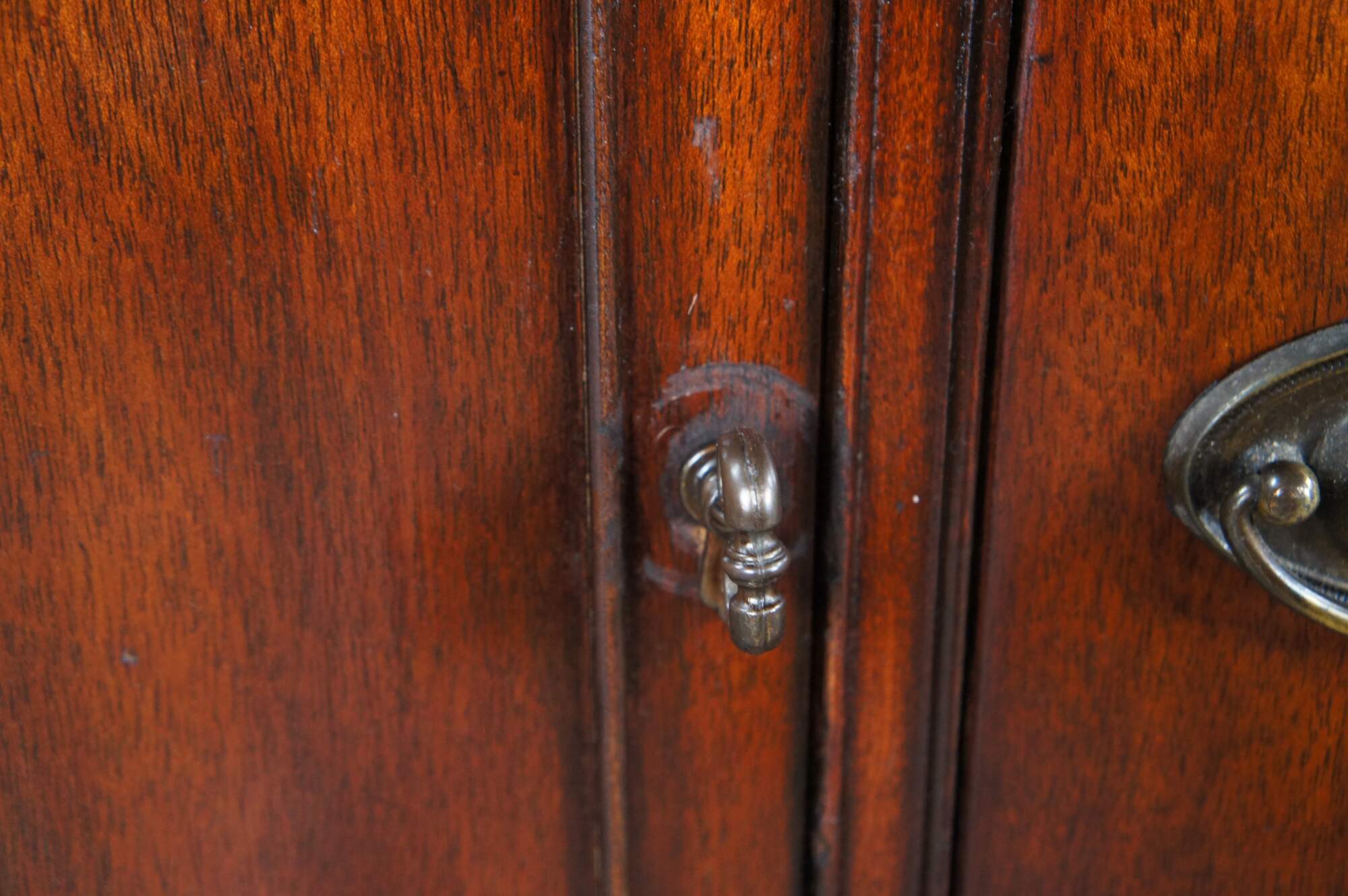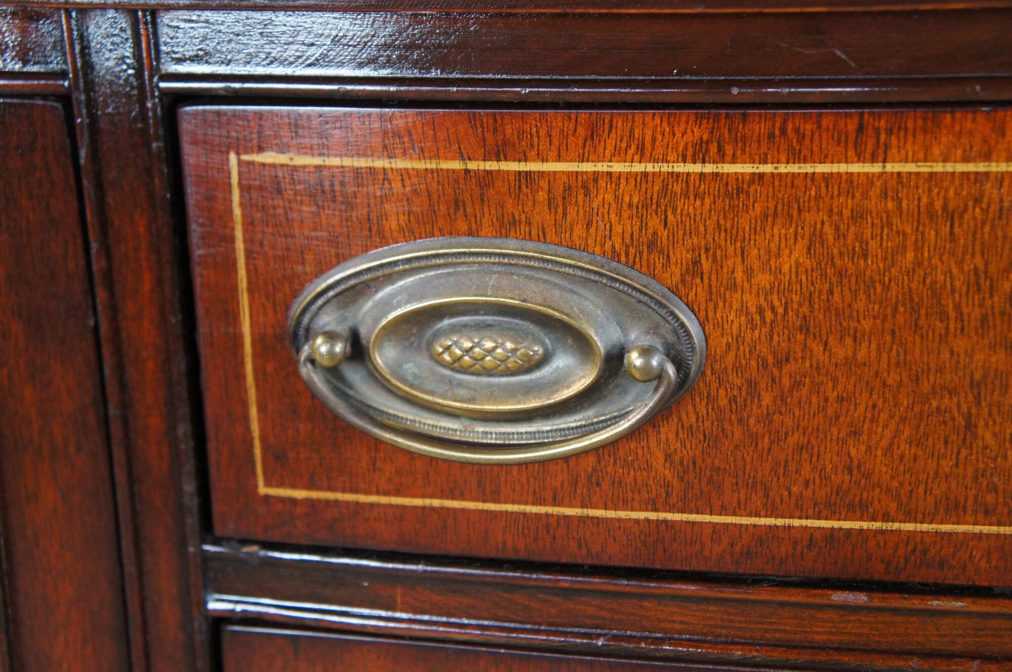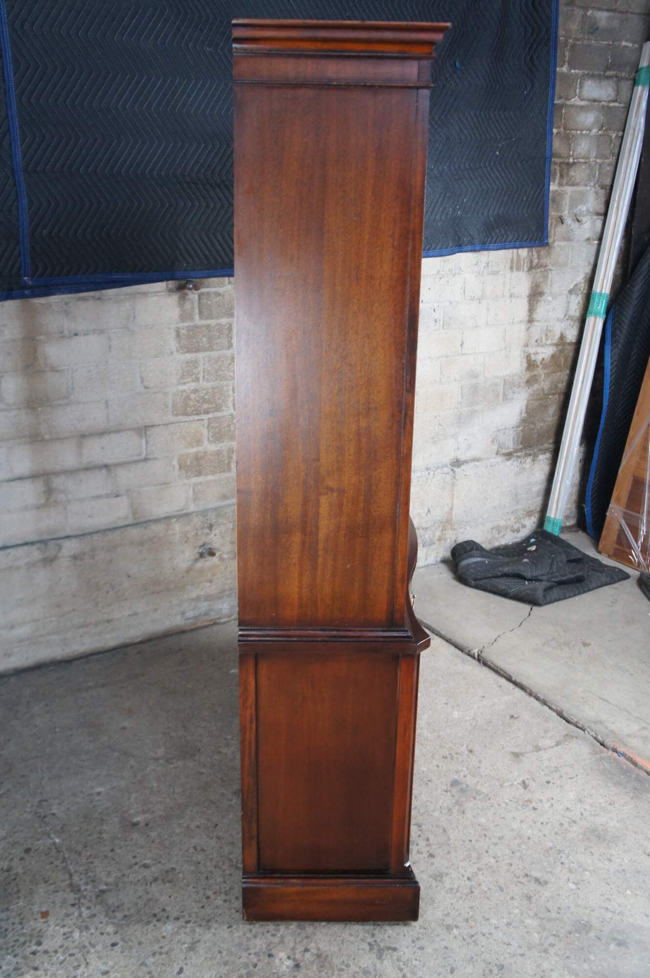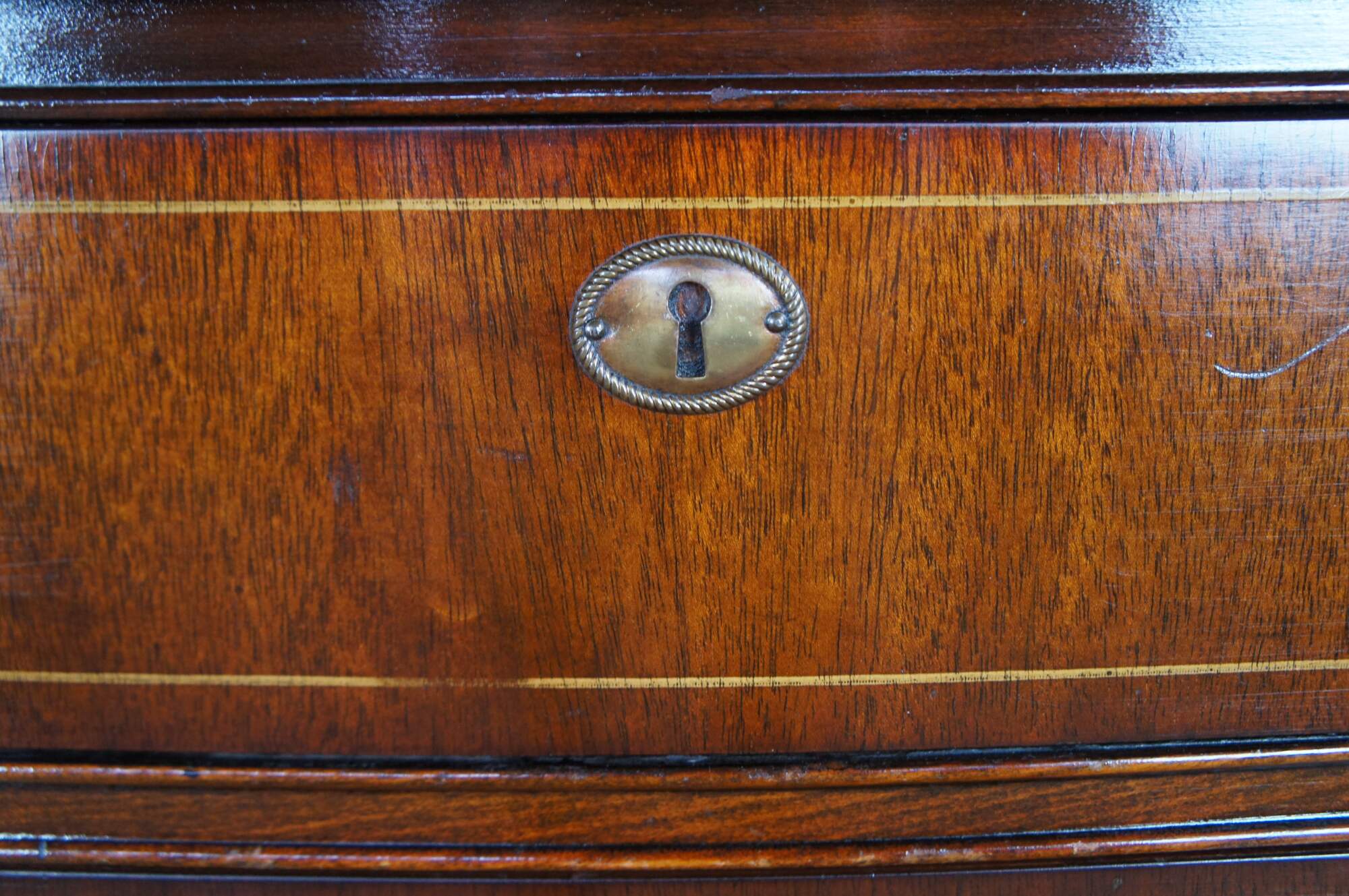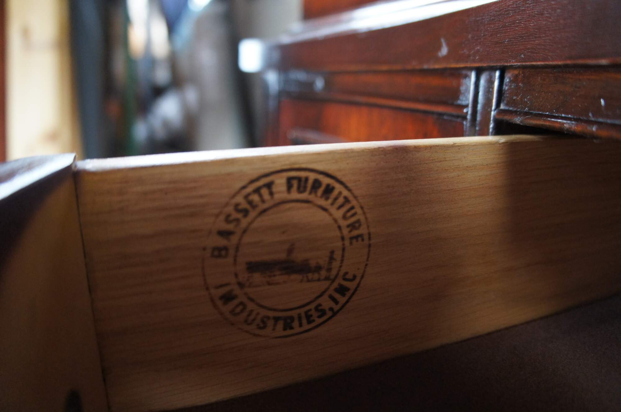 Vintage mid-century bow front china cabinet, made by Bassett Furniture in the 1950s as part of their Monticello collection. Featuring richly-hued mahogany and a curved glass door which matches the curved drawer fronts. This piece was constructed with quality in mind, and features plenty of storage.