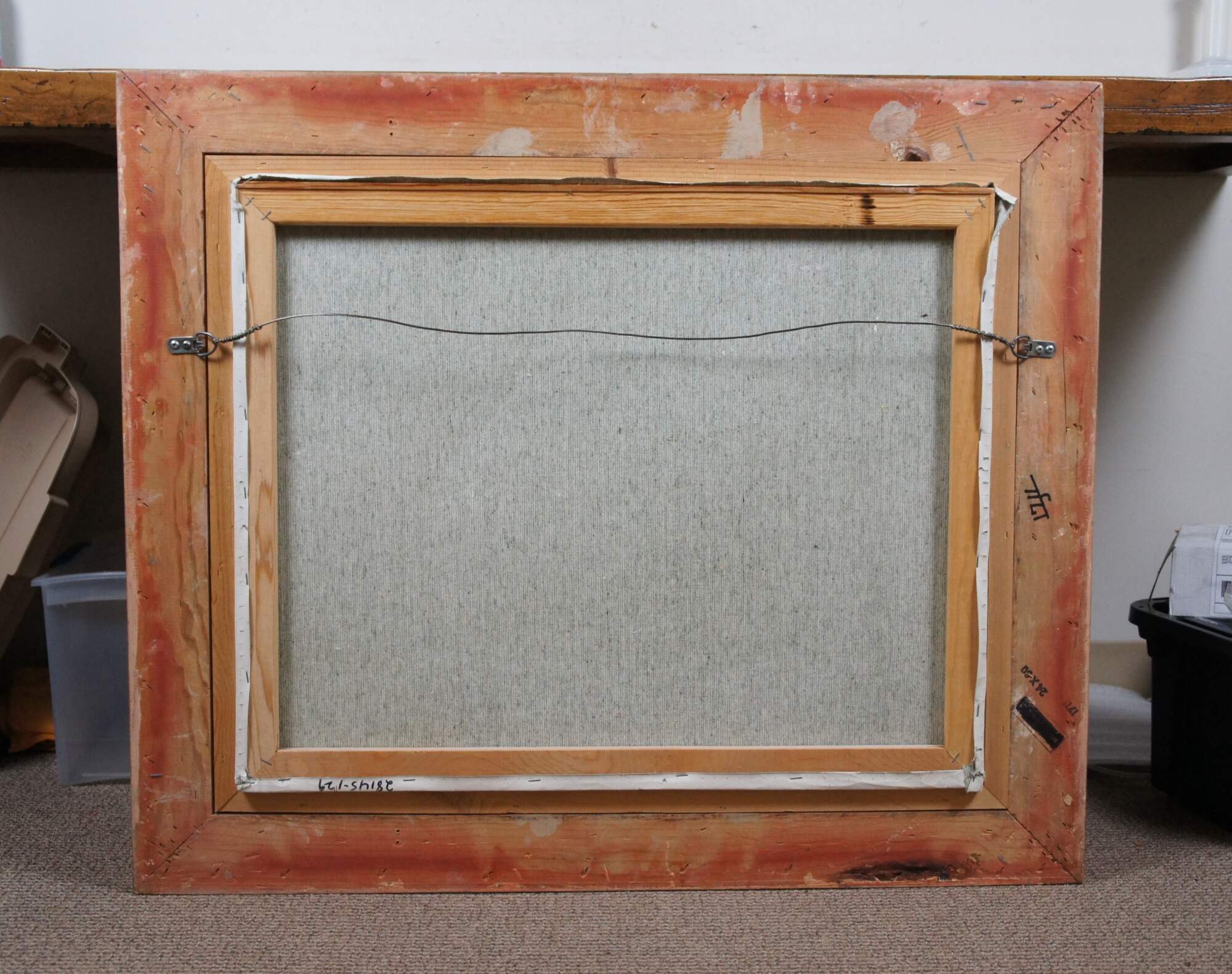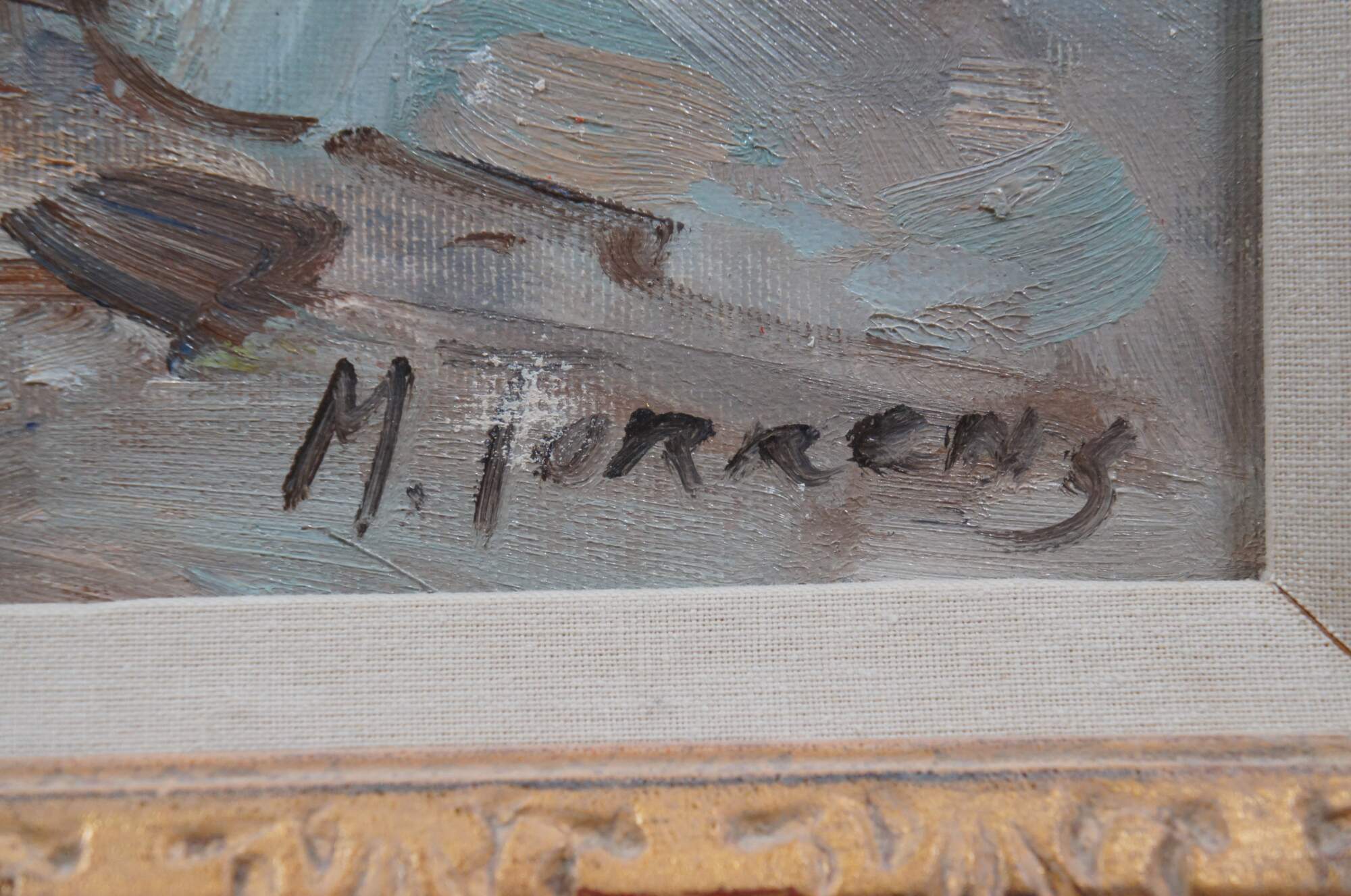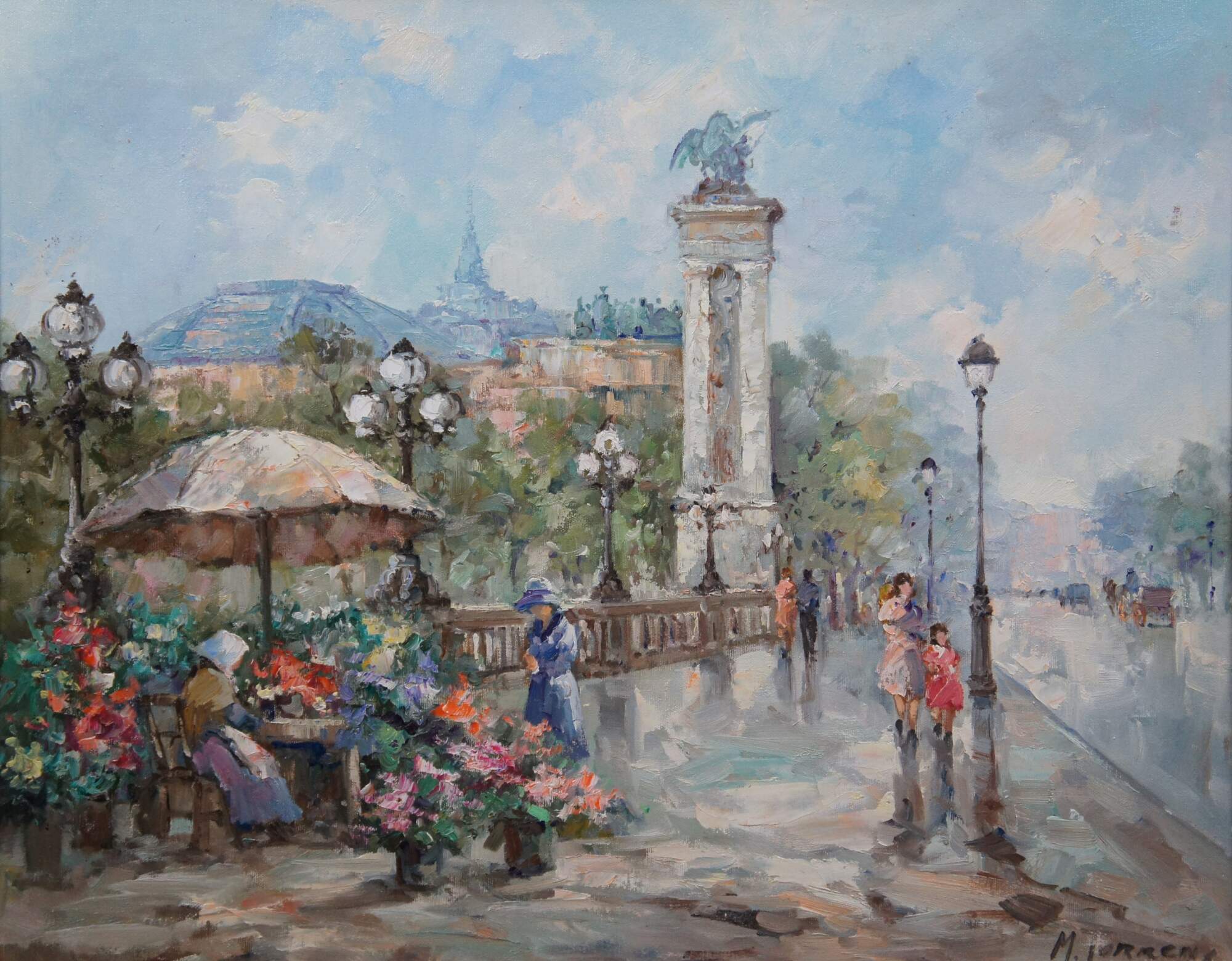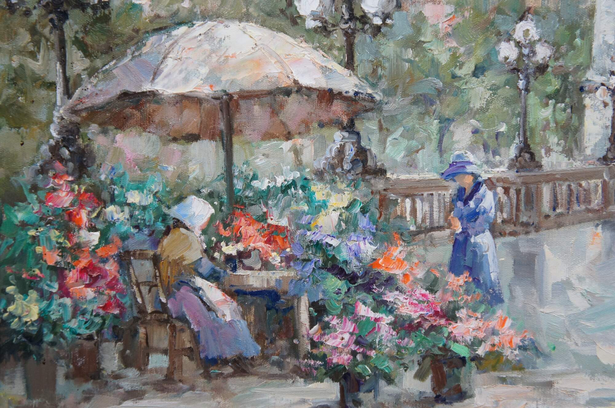Mid to late 20th century impressionist cityscape oil on canvas painting by Spanish artist Monserrat S. Torrens. Depicts a pleasant cityscape showing a broad Paris boulevarde with a flower seller in the foreground. Signed in corner. Giltwood frame with fleur de lis and foliate accents; white linen border.