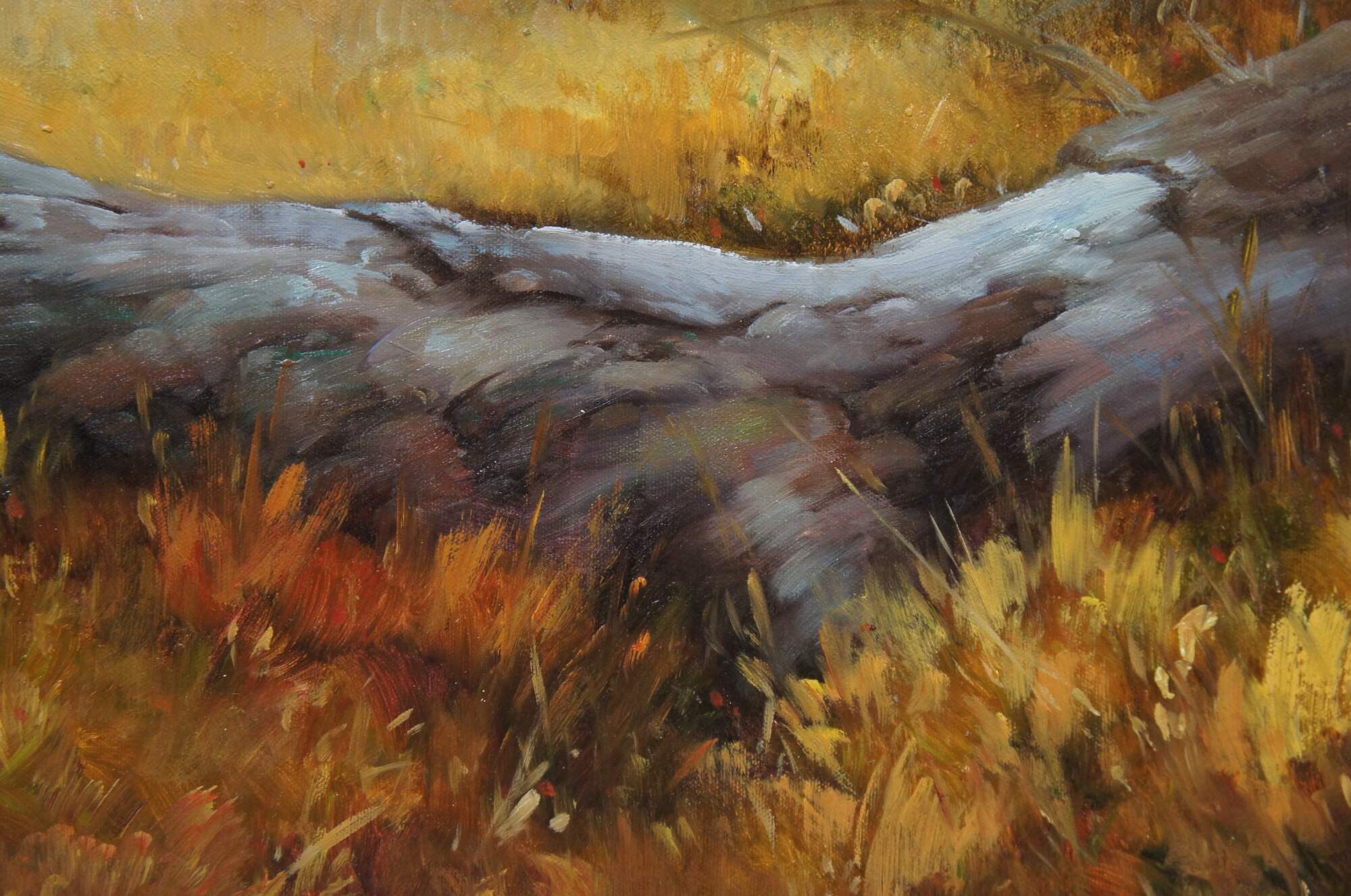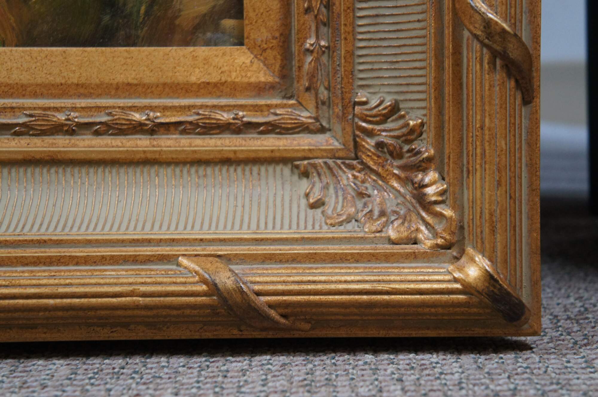A large and impressive vintage landscape oil painting on canvas by Jim Hutt (American 20th Century), depicting a pair of brown and white hunting dogs standing in an autumn field with fallen trees. Signed in lower right corner. Neoclassical gilt wood frame featuring ribbon wrapped staves, beveled with acanthus leaf corners, and leafy vine inner border.