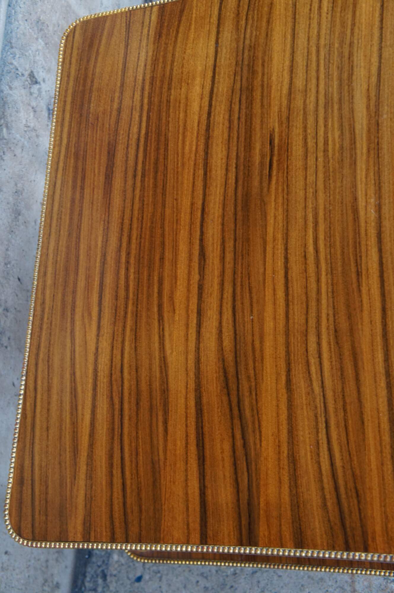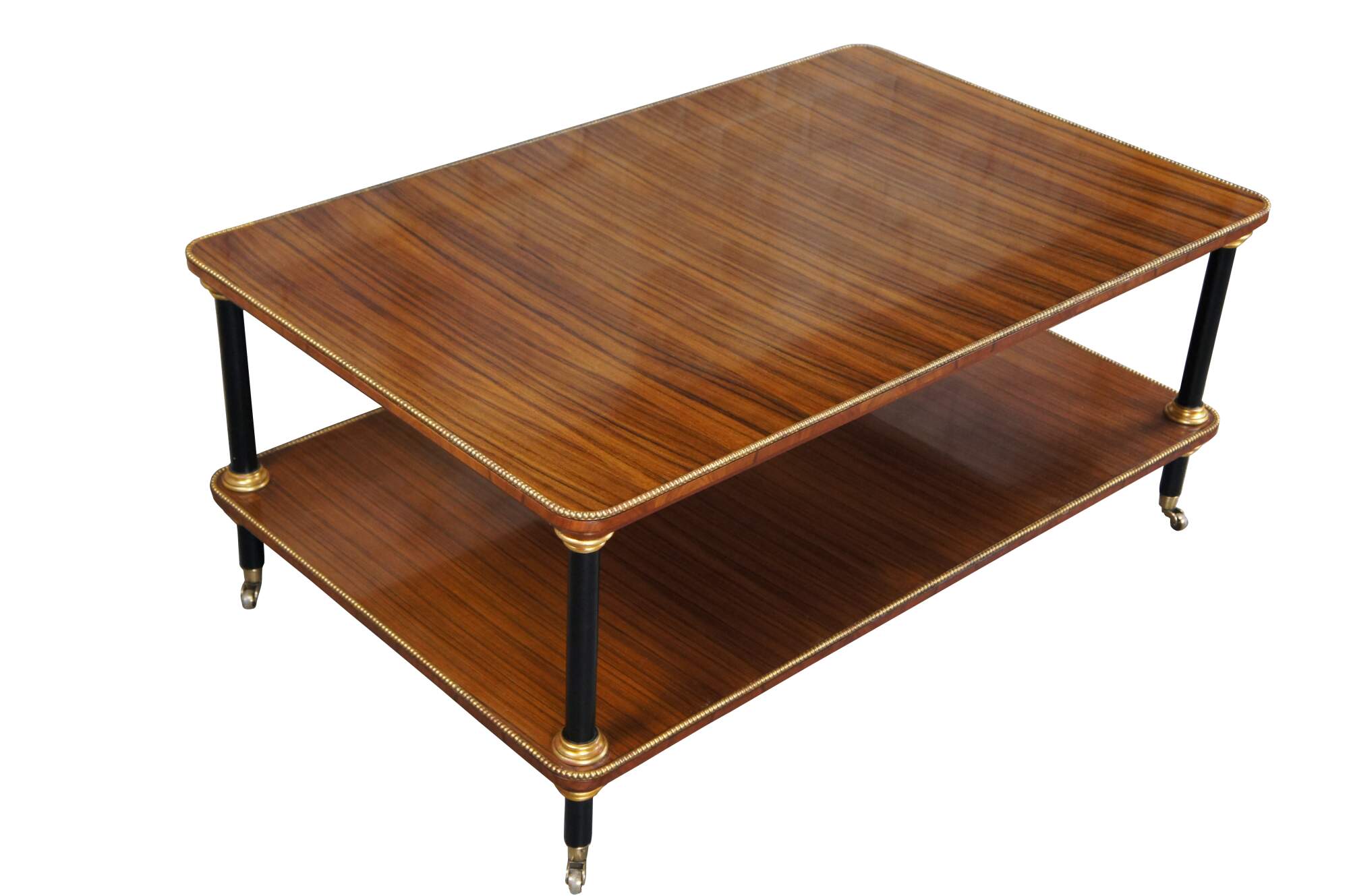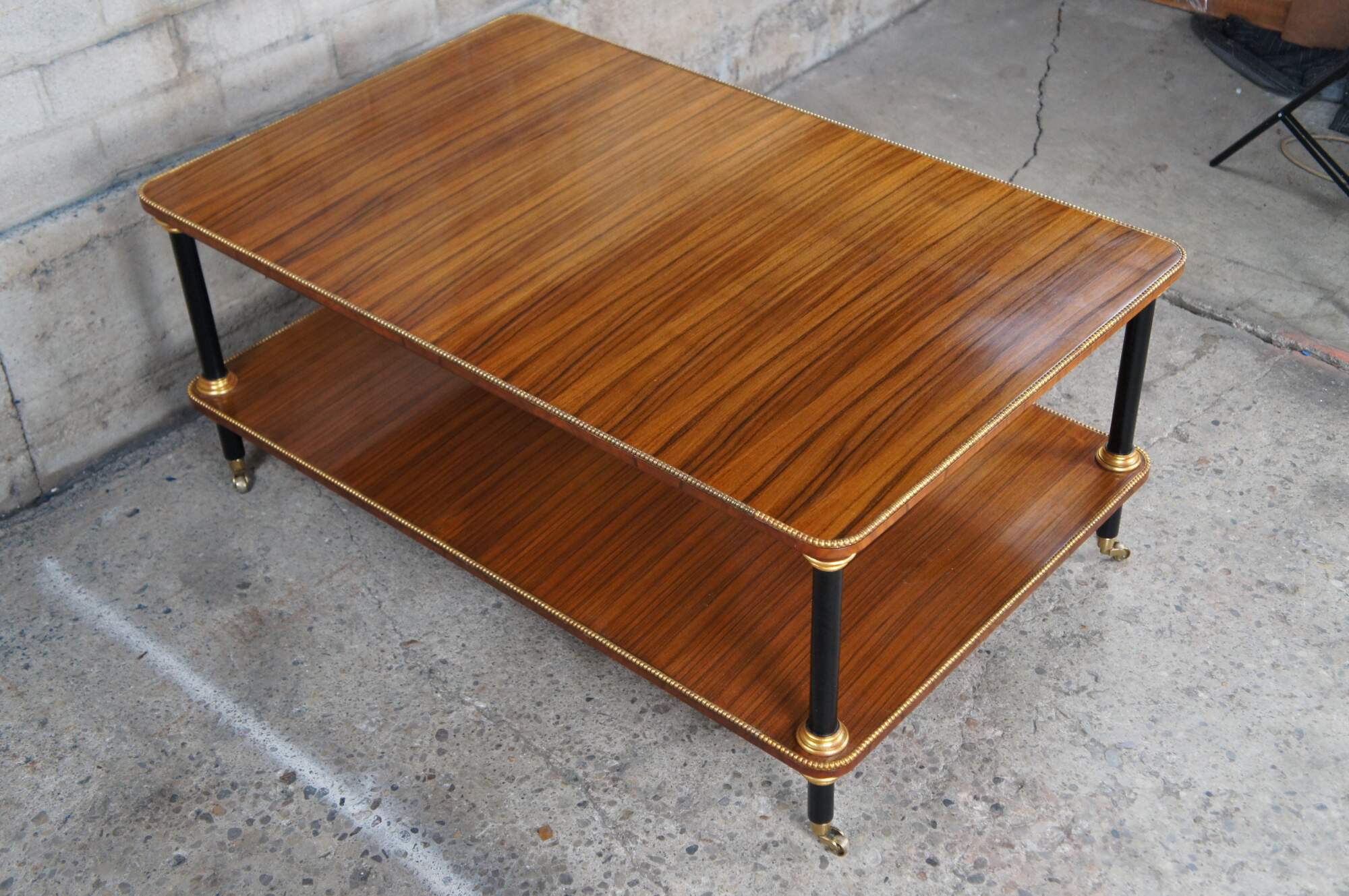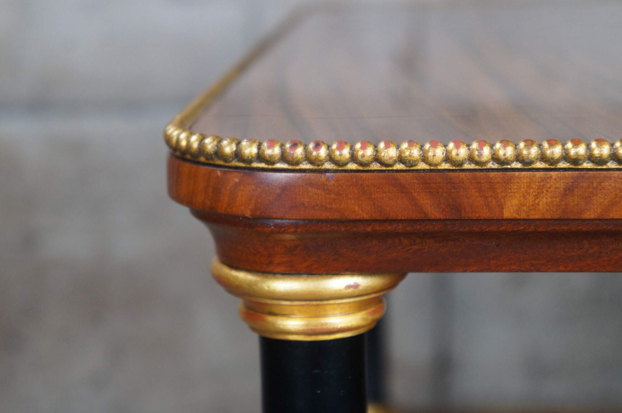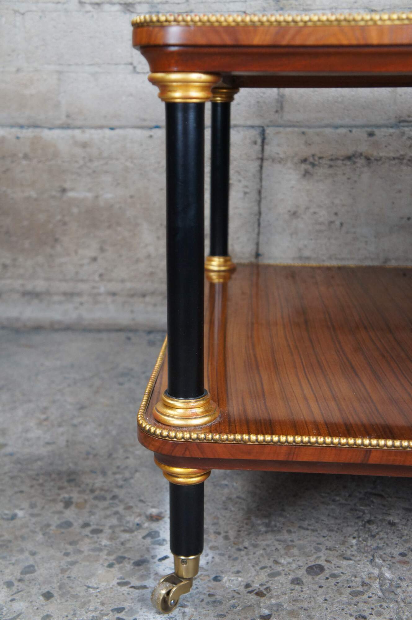 Impressive rare vintage Baker Furniture English Sir Humphry Wakefield Collection Empire / Regency style coffee cocktail table. Made of Satinwood featuring a two tiered rectangular design with ebonized and gilt accents, beaded trim and castors.