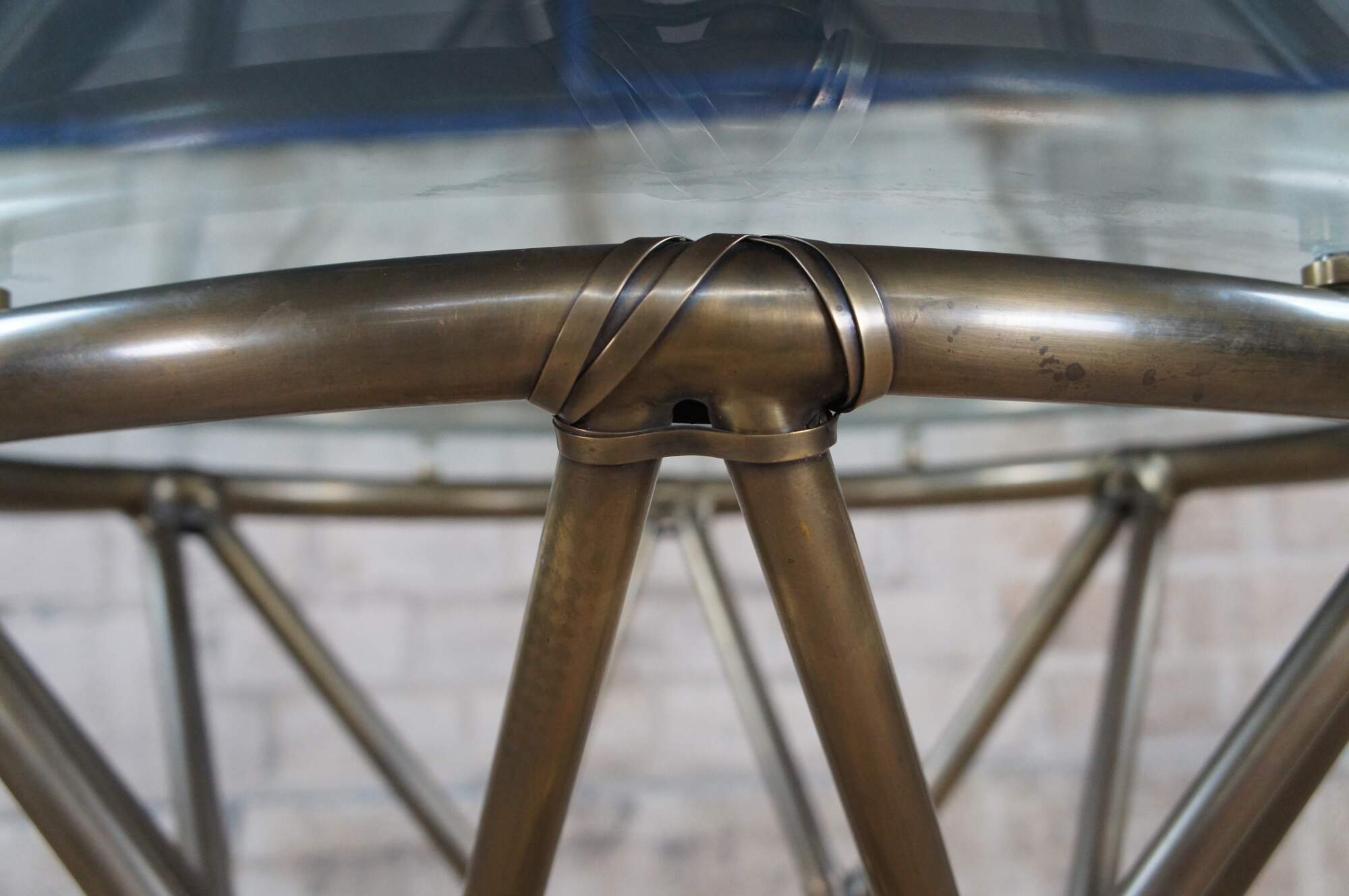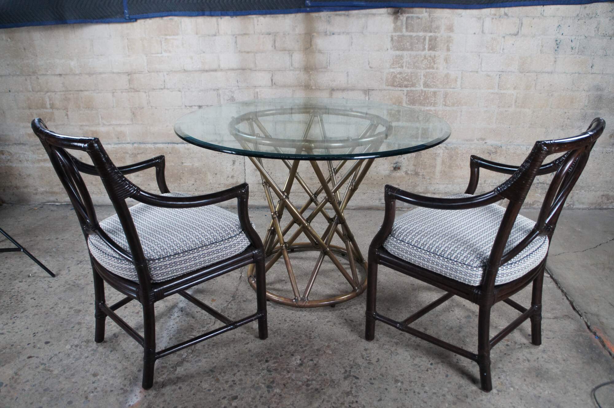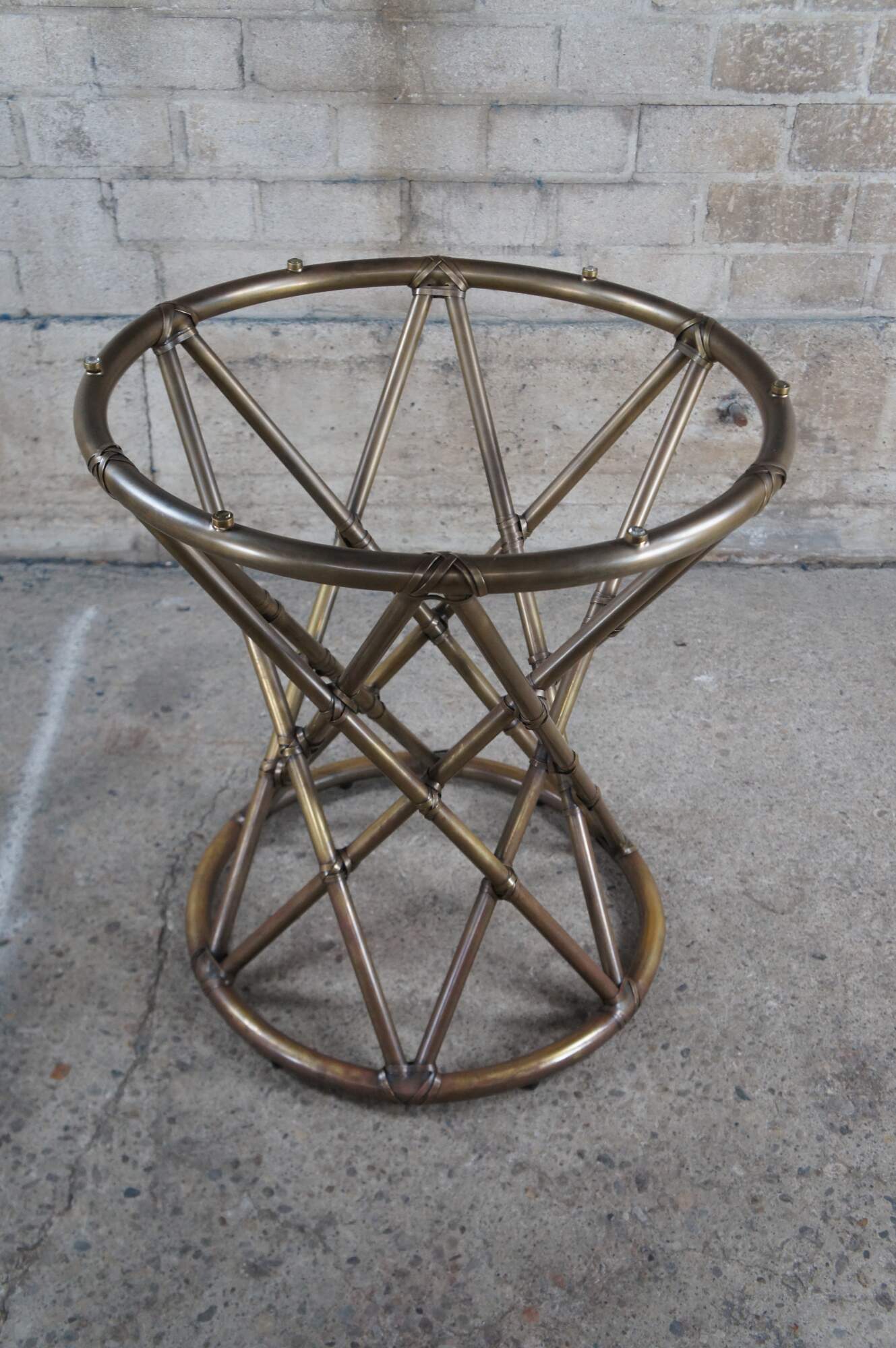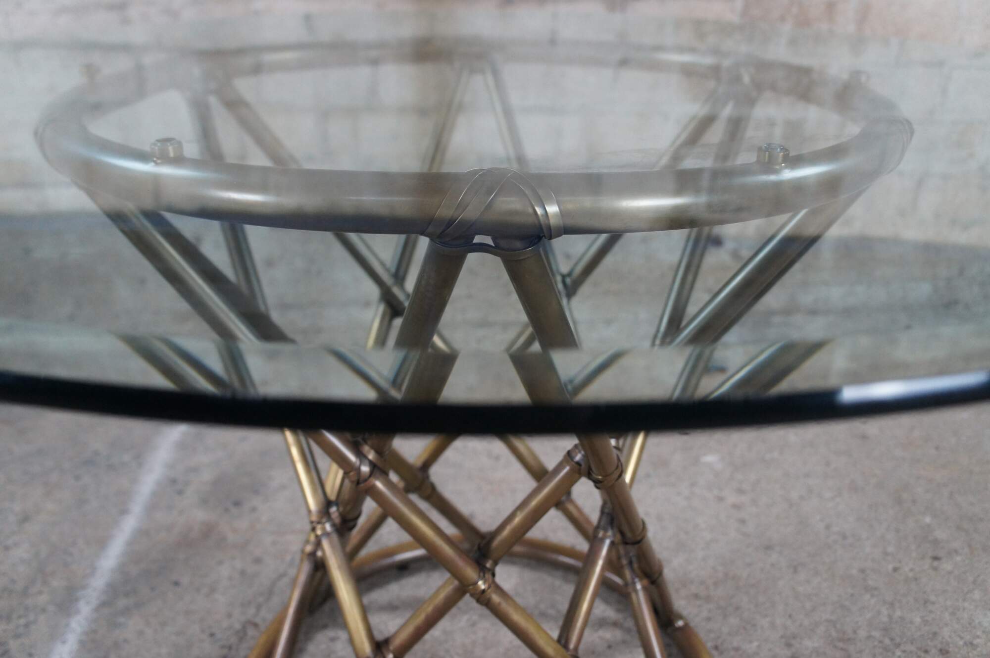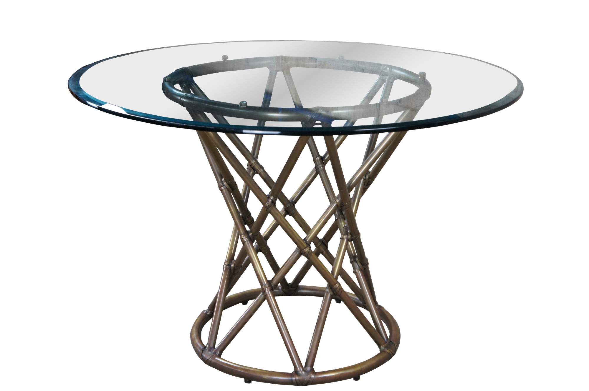 Vintage McGuire organic modern pedestal breakfast / dining / card / game table. Made of tubular brass featuring a faux bamboo / rattan design with a geometric hourglass form. Topped with a thick, round pane of 44" beveled glass.