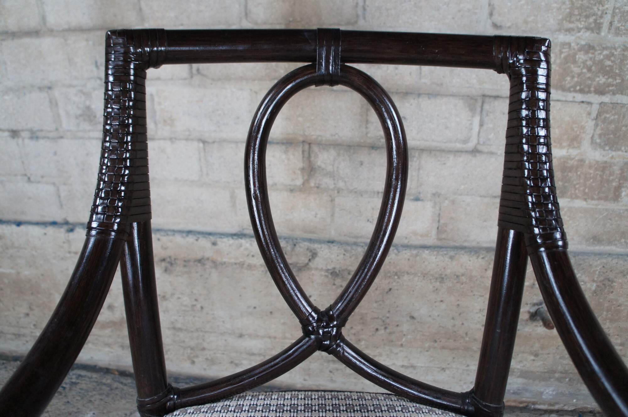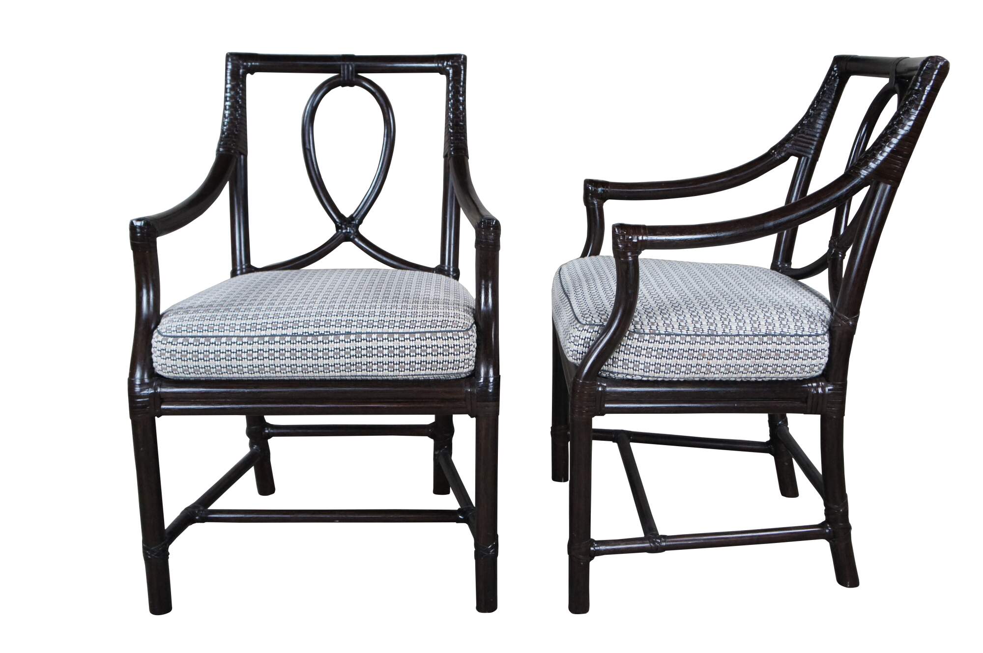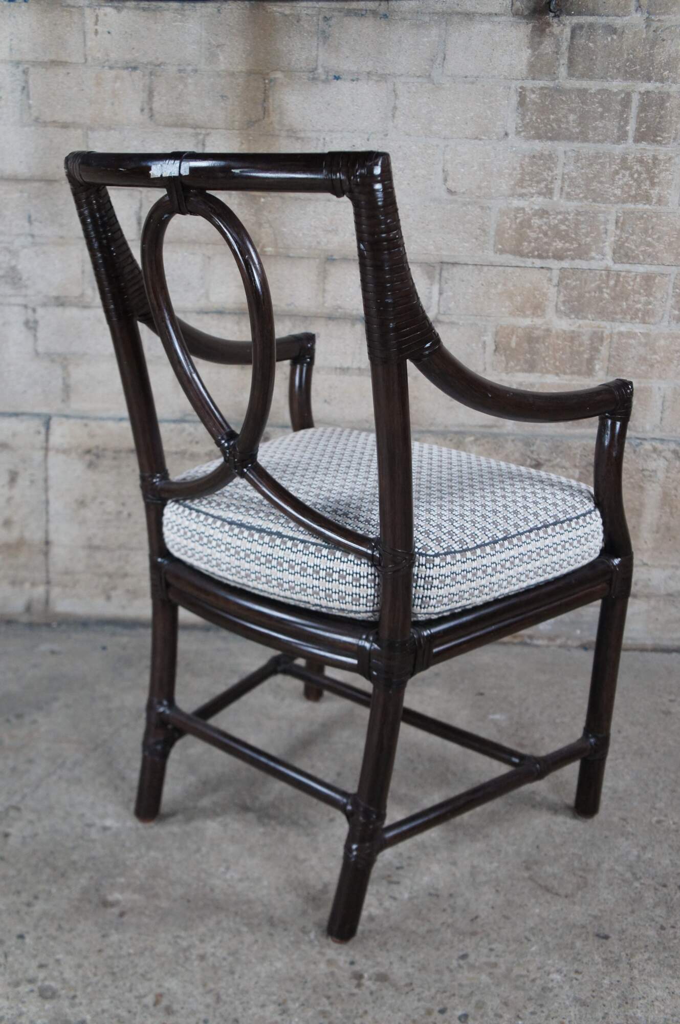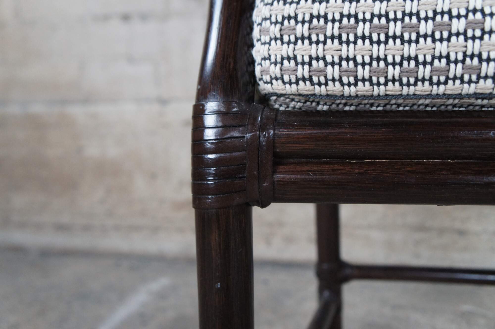 Vintage McGuire organic modern breakfast / dining / card / game arm chairs. Made of tubular bamboo and rattan construction featuring a sinuous looped back splat and sloped arms with dark finish.