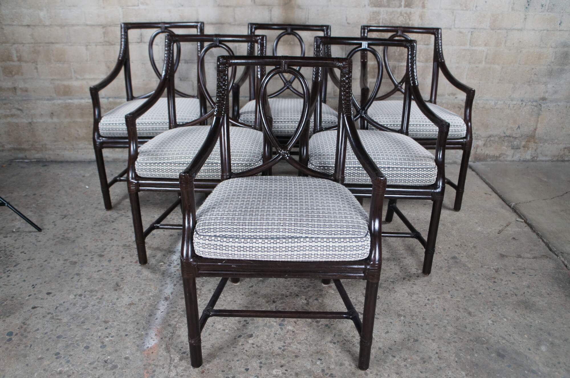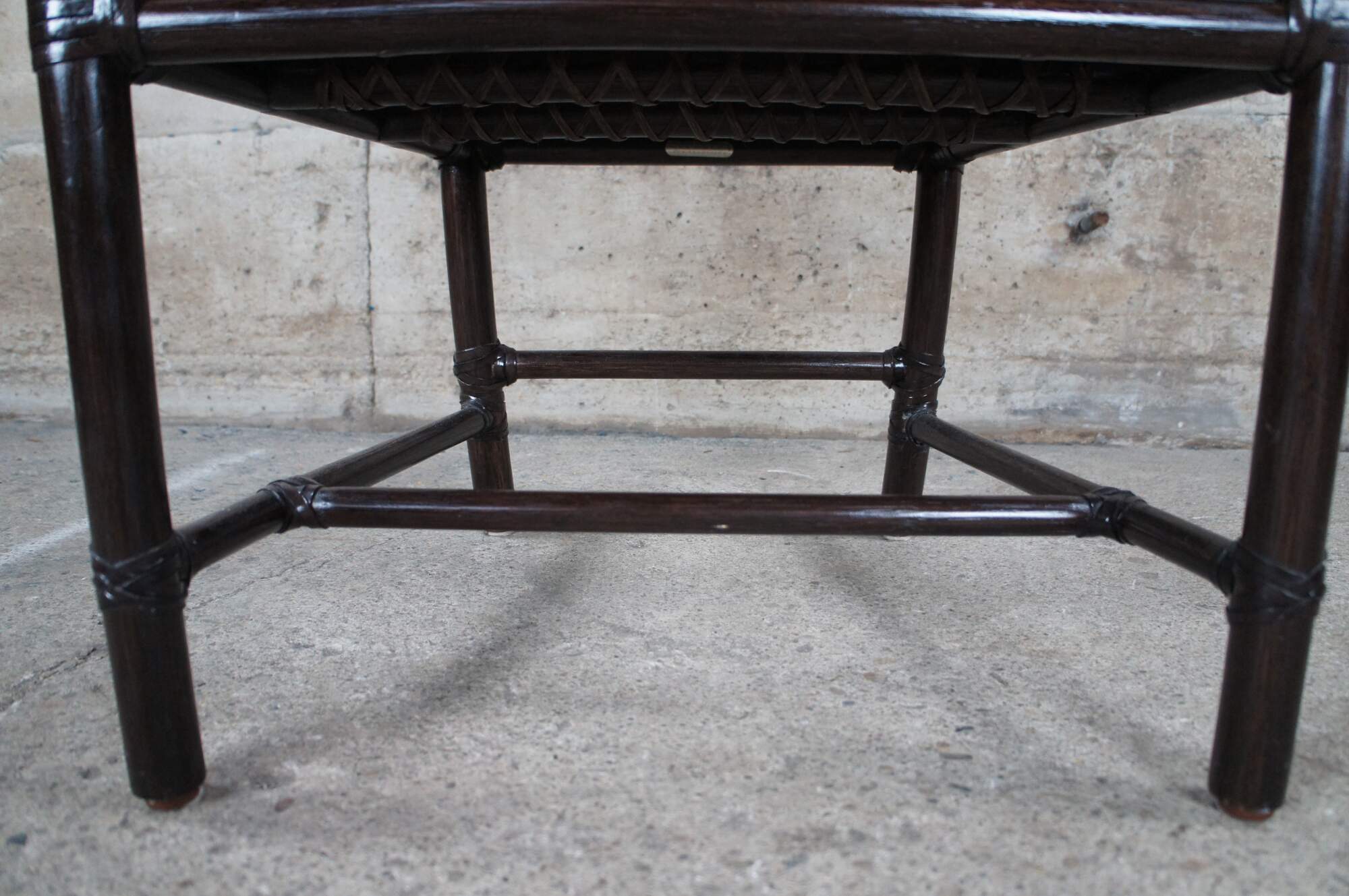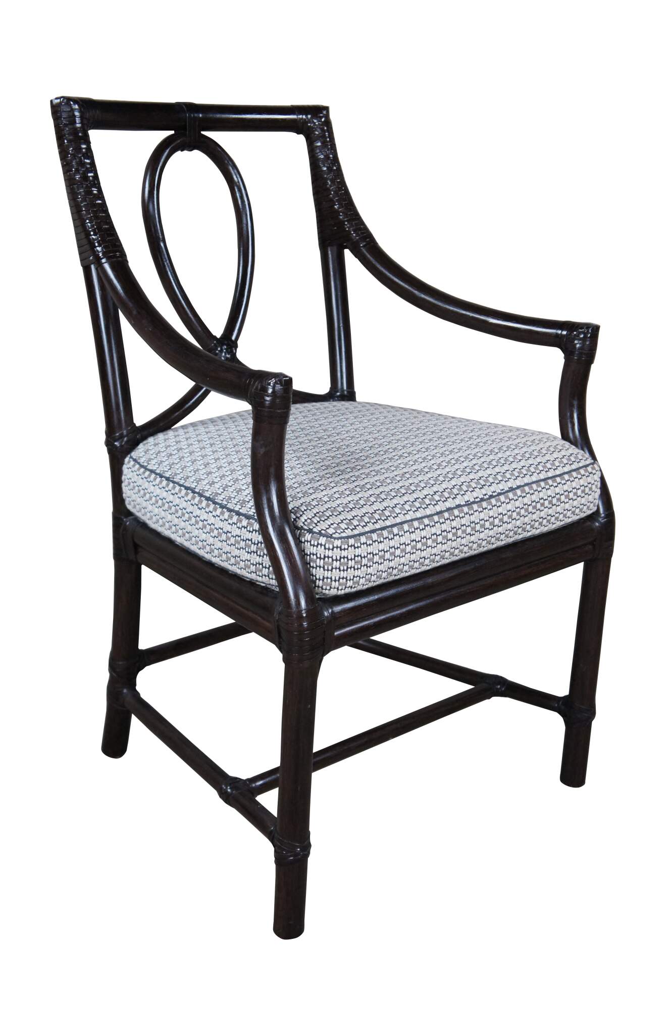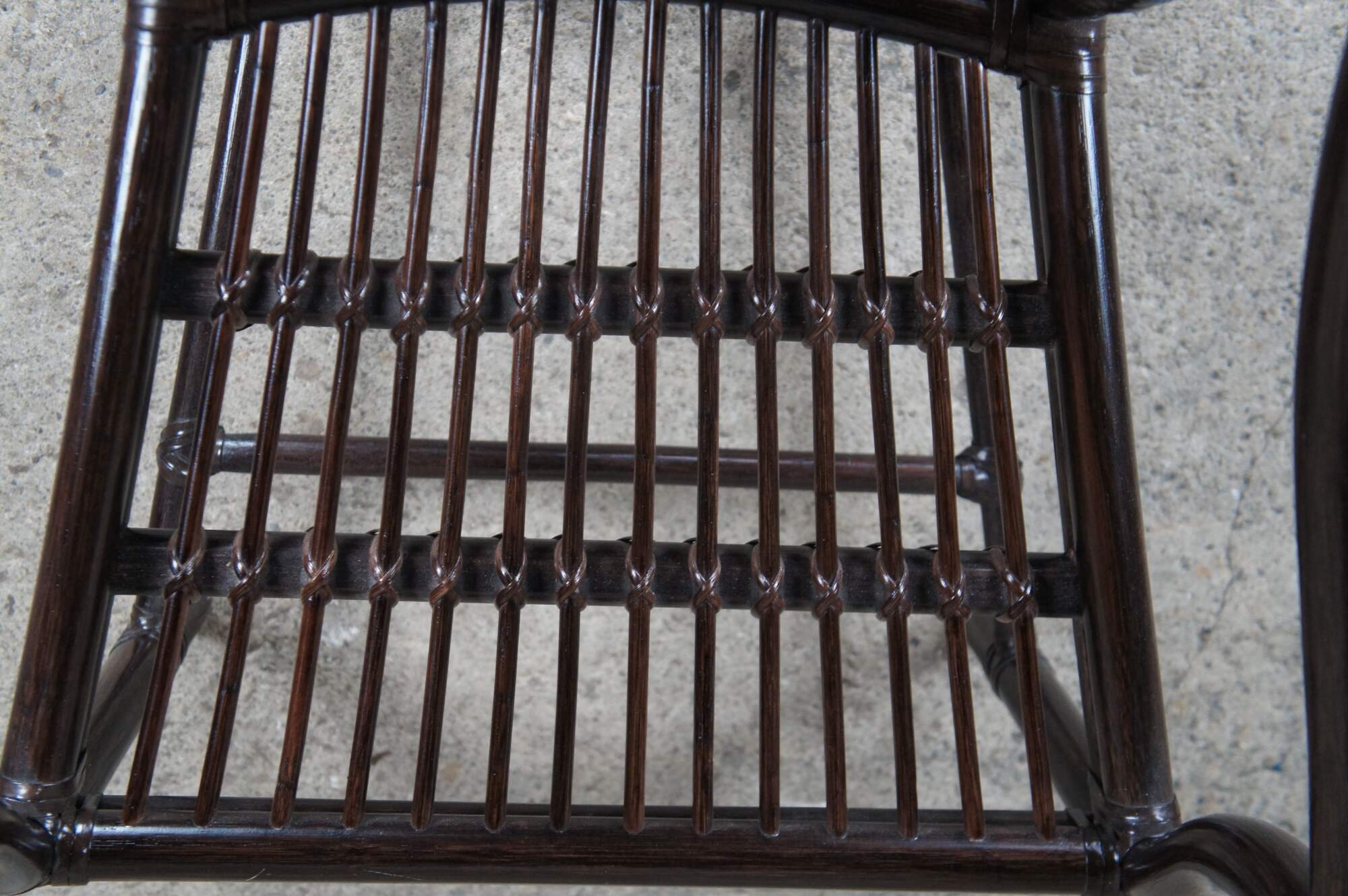 Vintage McGuire organic modern breakfast / dining / card / game arm chairs. Made of tubular bamboo and rattan construction featuring a sinuous looped back splat and sloped arms with dark finish.