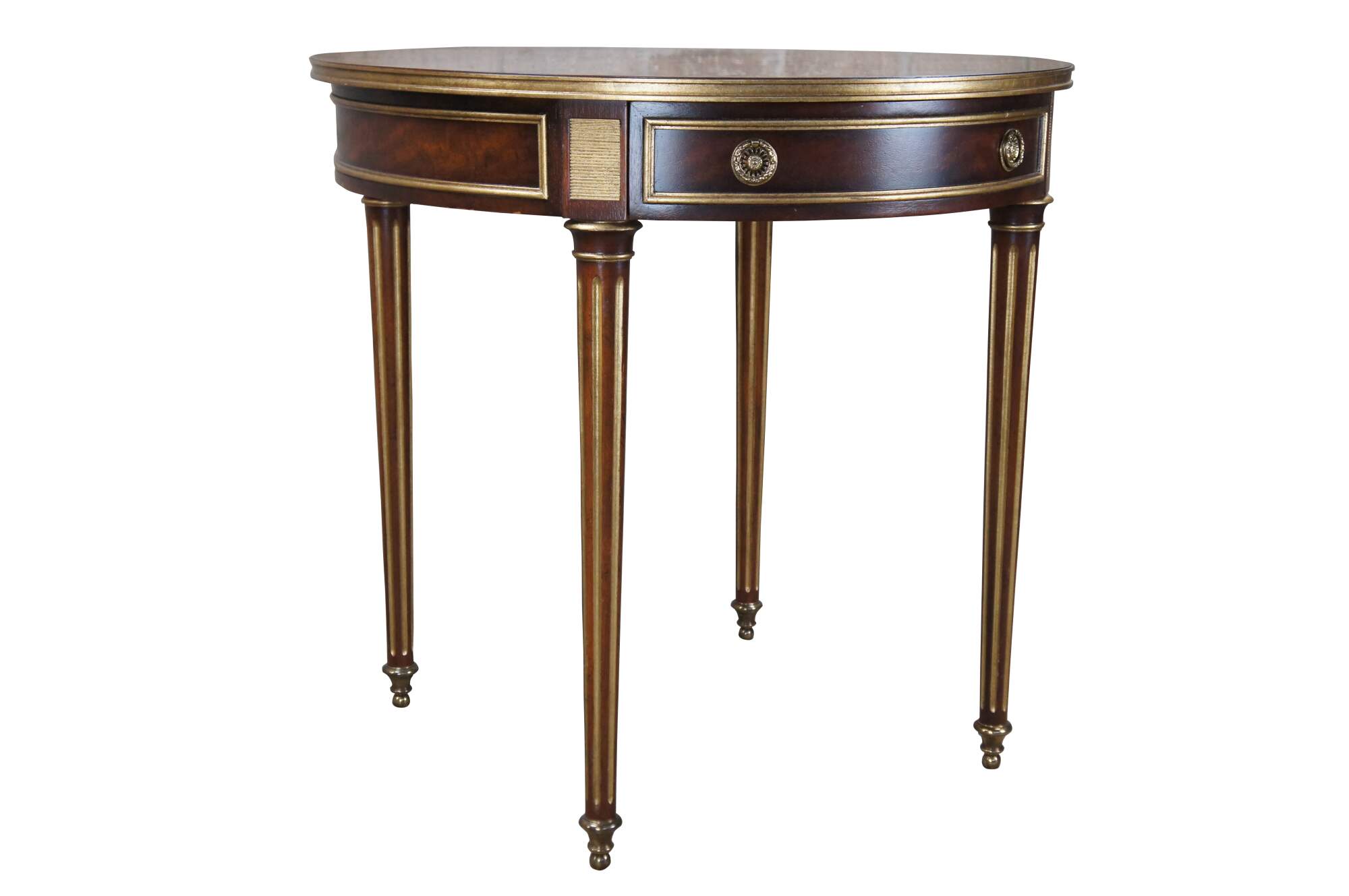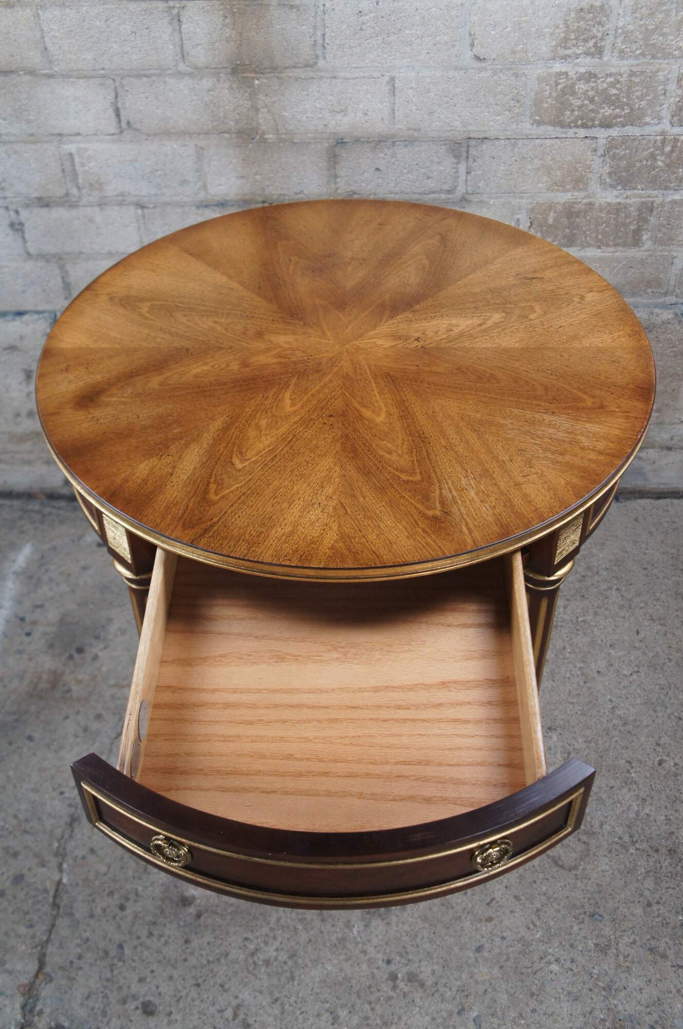 Vintage Baker Furniture English Sir Humphry Wakefield Collection French Louis XVI bouillotte style side accent table. Made of mahogany and satinwood featuring round form with sunburst bookmatch top, one drawer with brass hardware, gold gilt accents, and round tapered fluted legs with brass capped feet. Includes glass top.