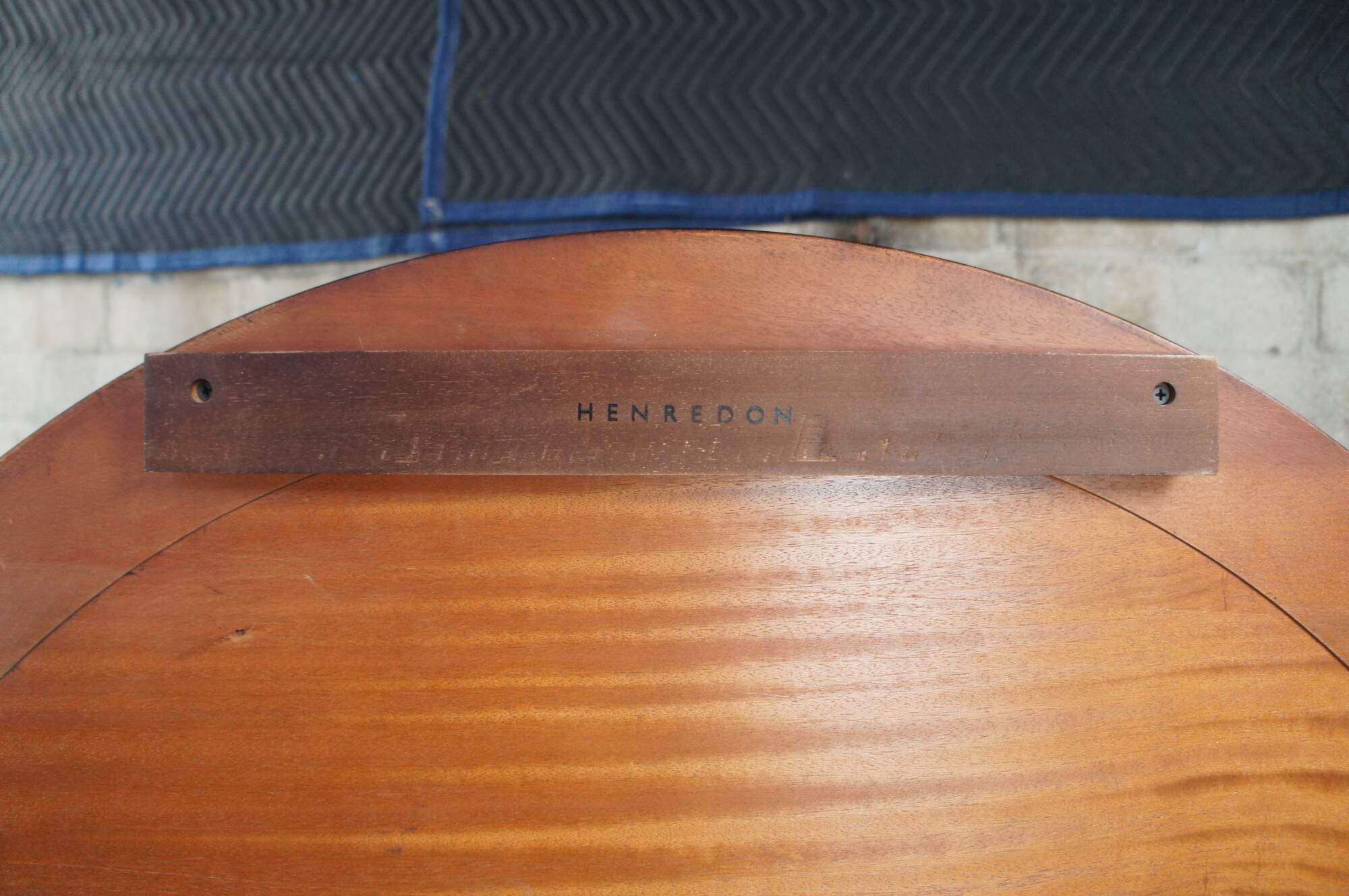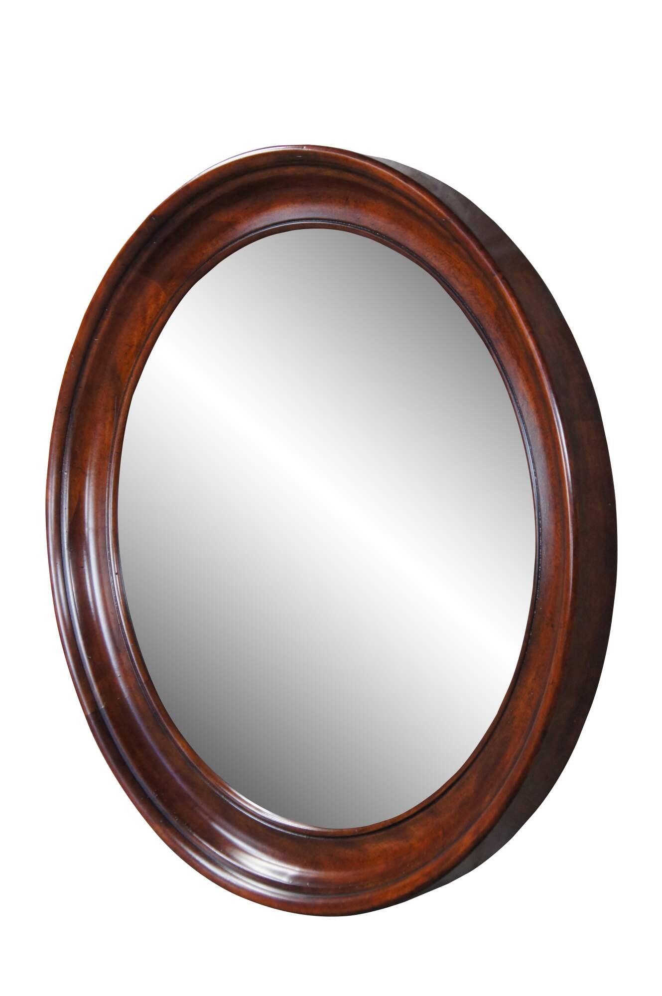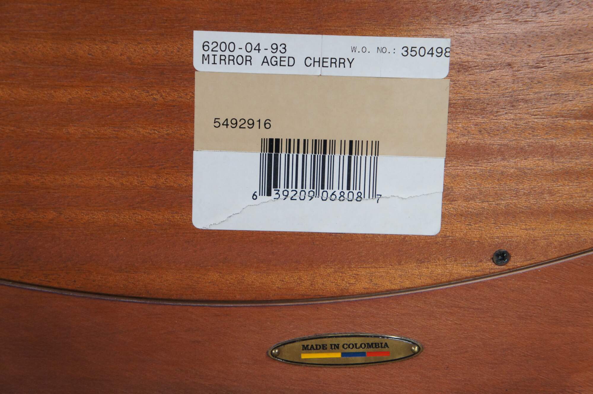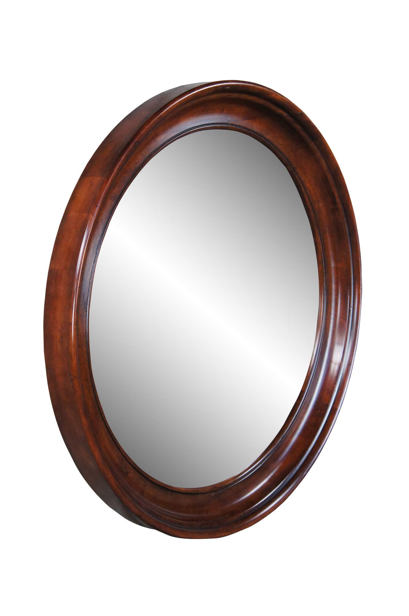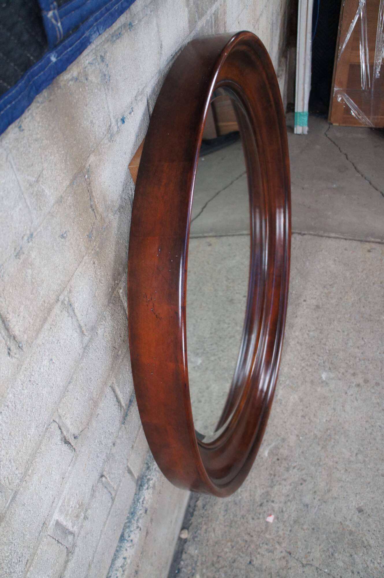 Vintage Henredon cavalier aged cherry round beveled bullseye style vanity or hall mirror. Includes hanging bracket. 6200 - 04 - 93, 350498, 5492916. Made in Columbia.