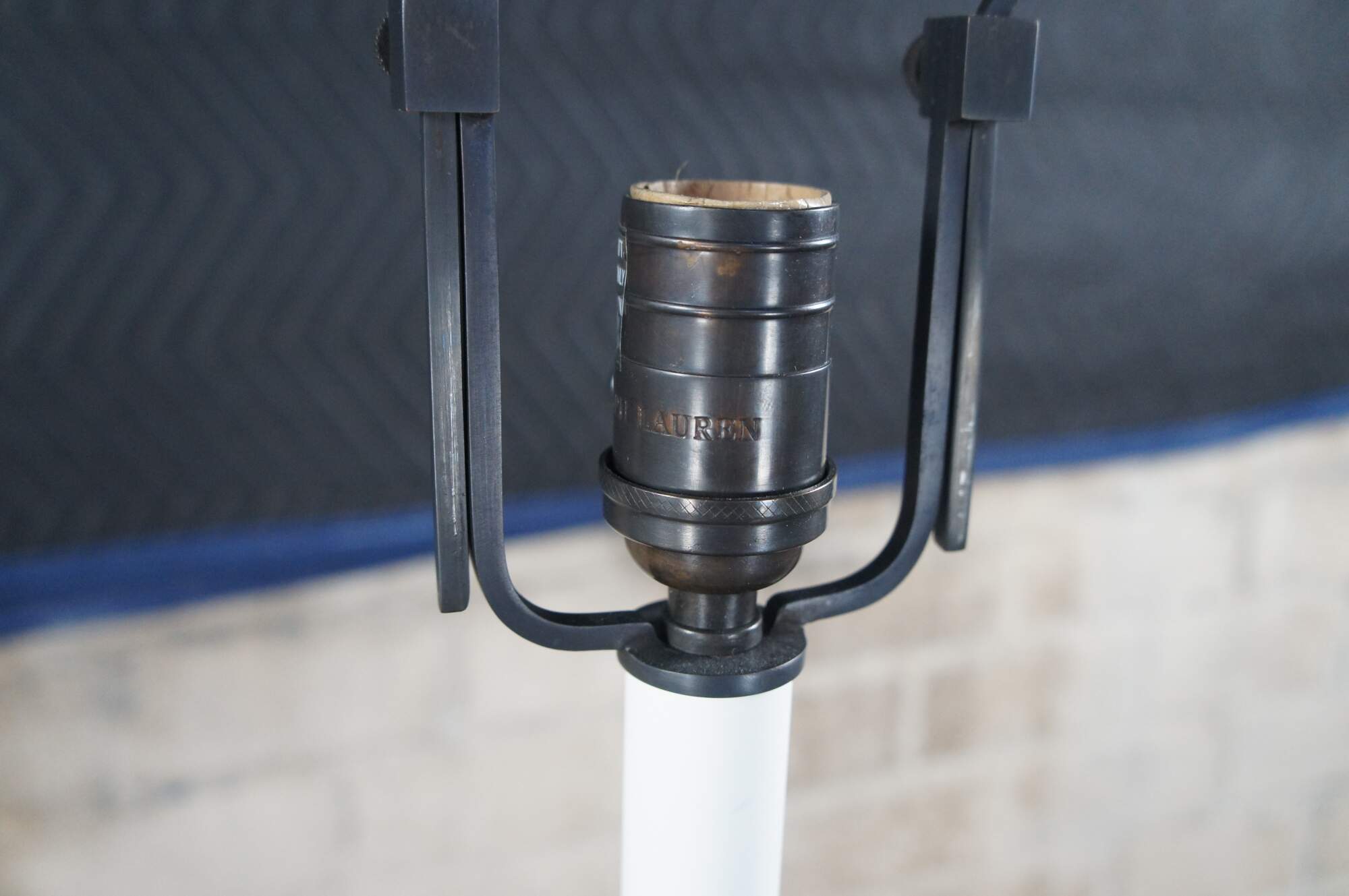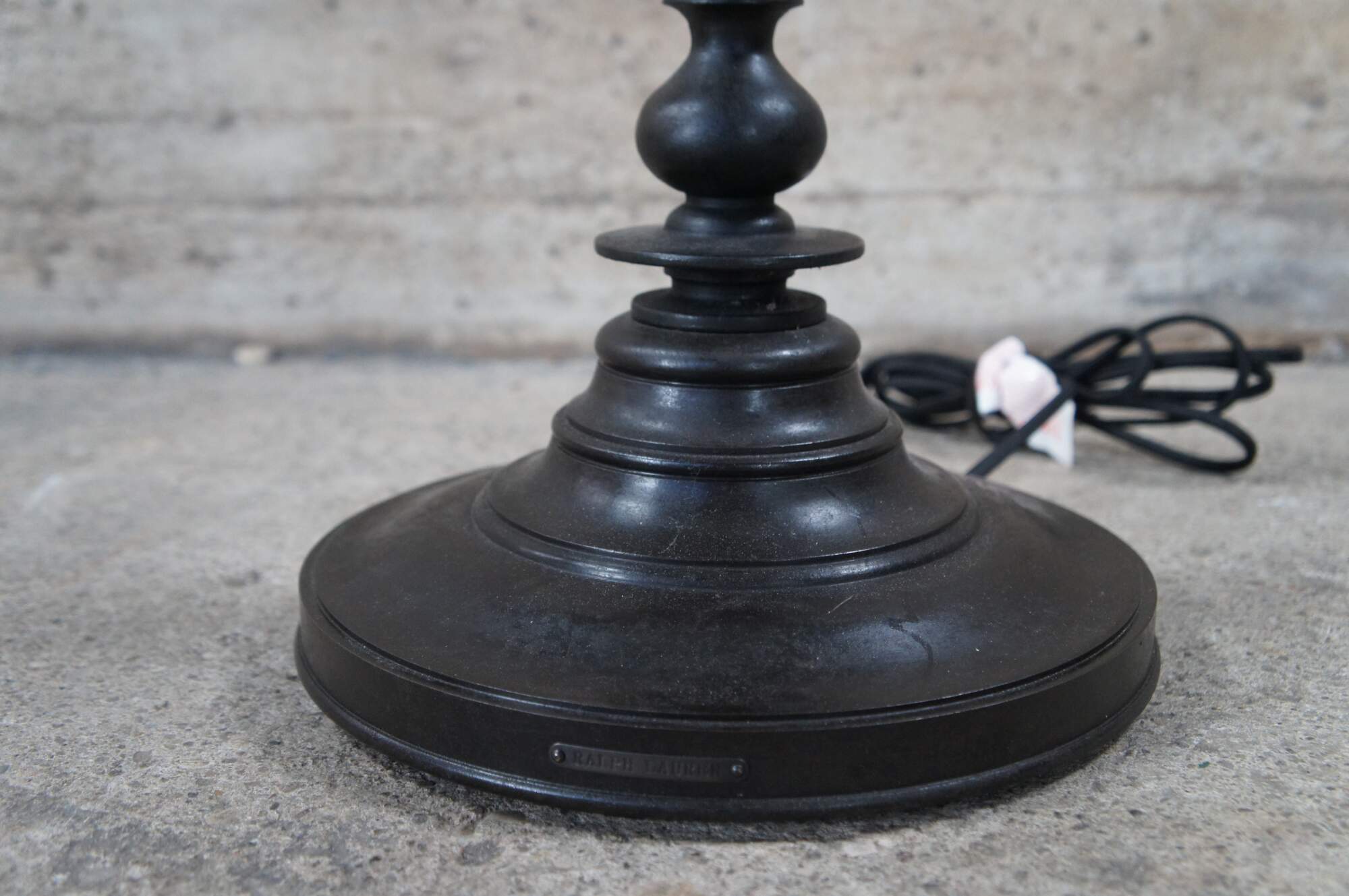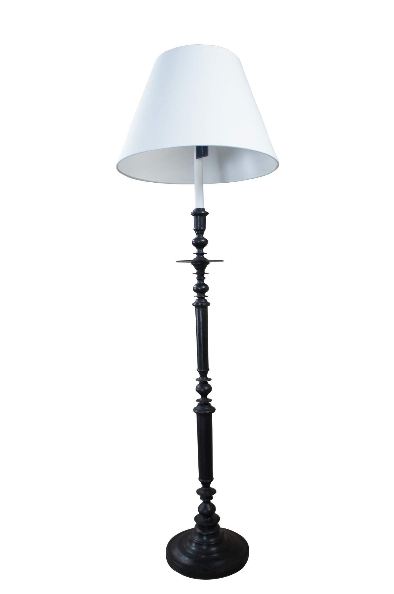 A beautiful old world Spanish Revival floor lamp by Ralph Lauren. Features a rustic iron frame in the shape of an 18th century candlestand with a long candlestick and tapered shade. Harp height is adjustable.