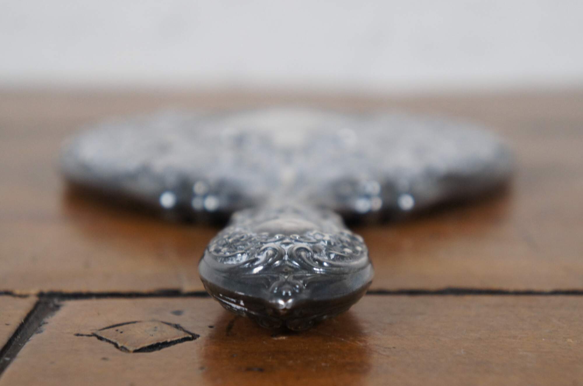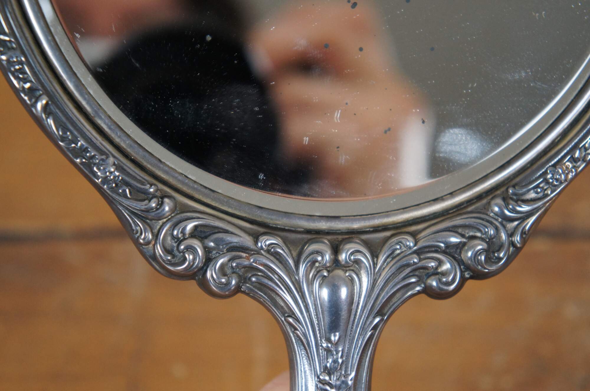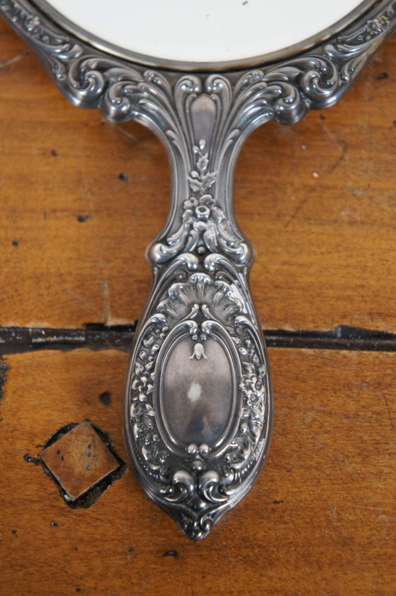 Early 20th century Gorham sterling silver, round hand mirror, number 23, Buttercup pattern featuring a repousse silver frame emblaxoned with scrolling foliates, roses and buttercups around two shield shaped spots perfect for engraving a monogram.