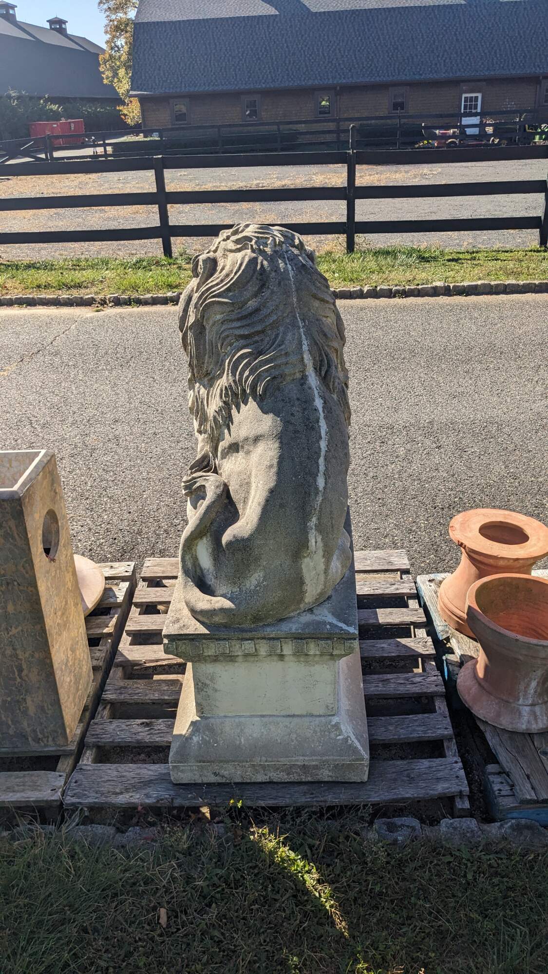 A large stone lion and cub statue over Grecian plinth base. The lion and cub are facing slightly right with open mouths. A nice detailed example for your garden or entry. Will require a Pallet jack to be moved