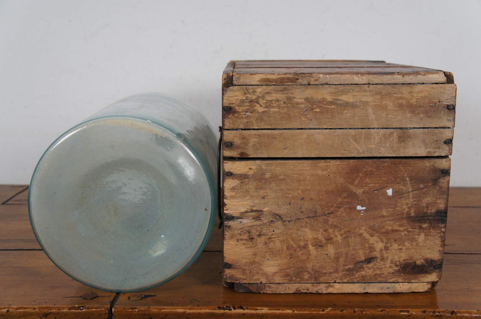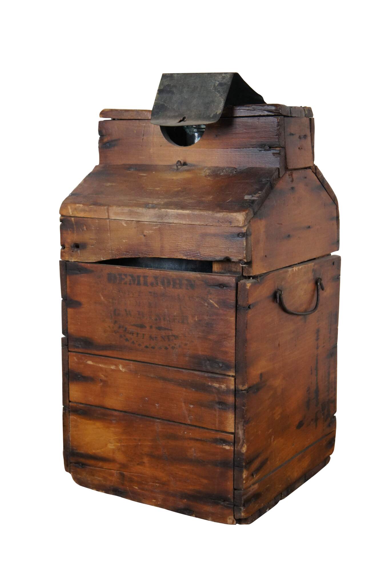 Late 19th century antique demijohn - an overzied wine bottle in pale blue glass with cork stopper - and hardwood tantalus style wine box / storage crate with lockable metal flap on top. Stamped on front G.W. Banker of New York. Circa 1880s.