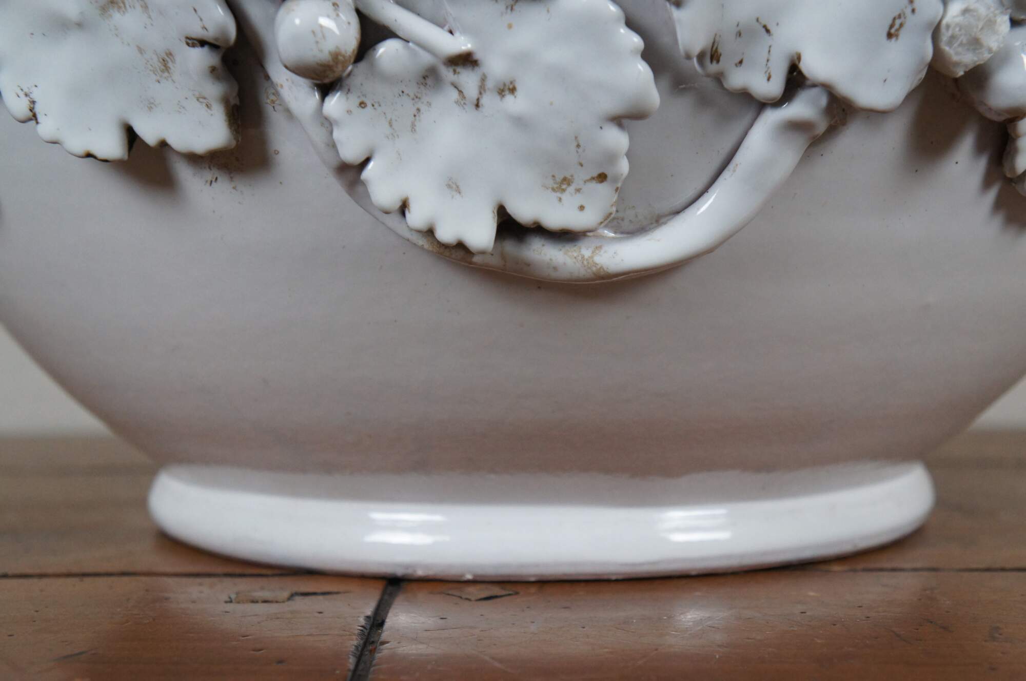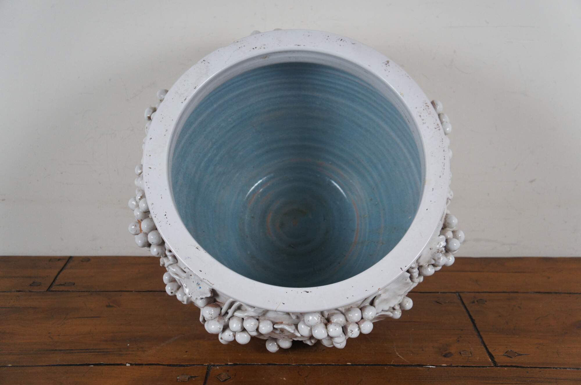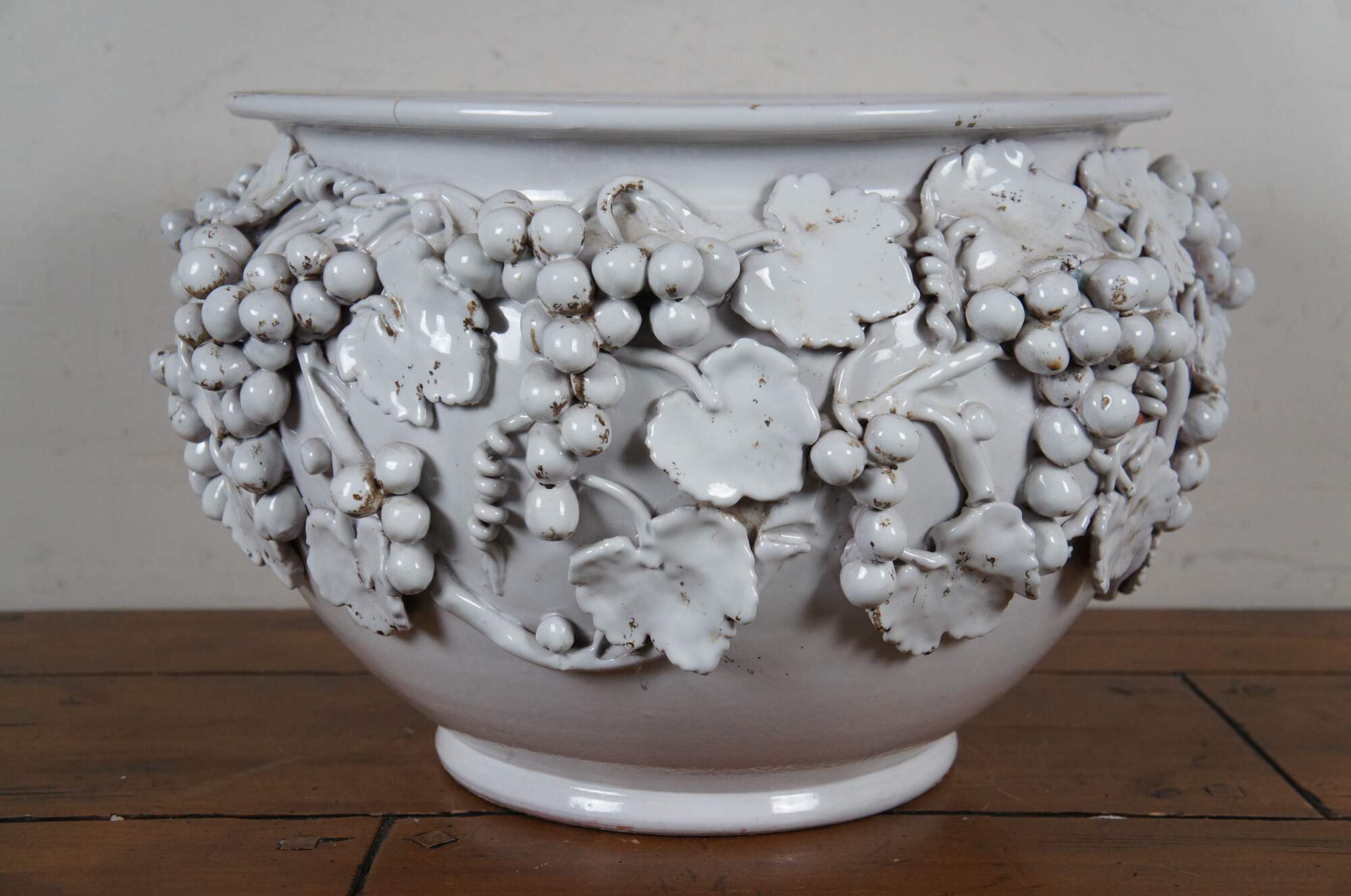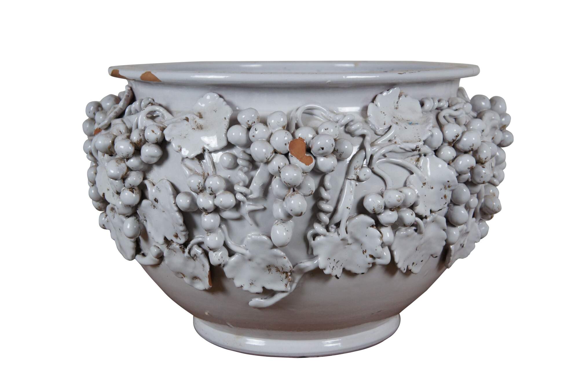 Large white Italian Dolfi Otello Cottura fishbowl shaped terracotta earthenware planter / jardiniere / cachepot, decorated with applied high relief grapevine, fruit and leaves. Finished in a thick white glaze with brushed brown accents underneath and a pale blue interior. Made in Italy for Cottura by Dolfi Otello.