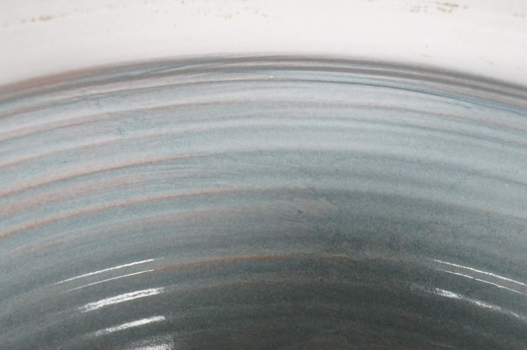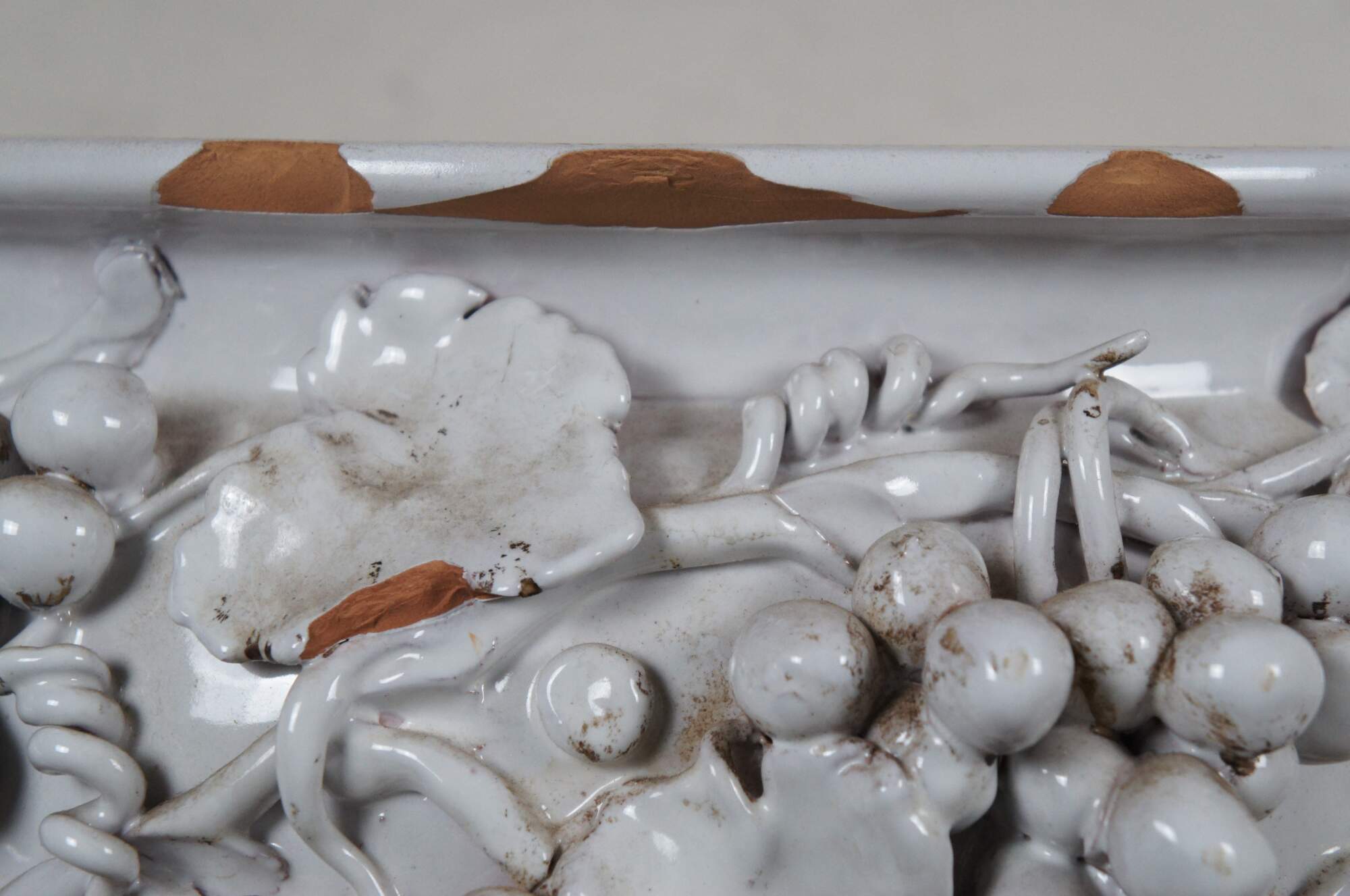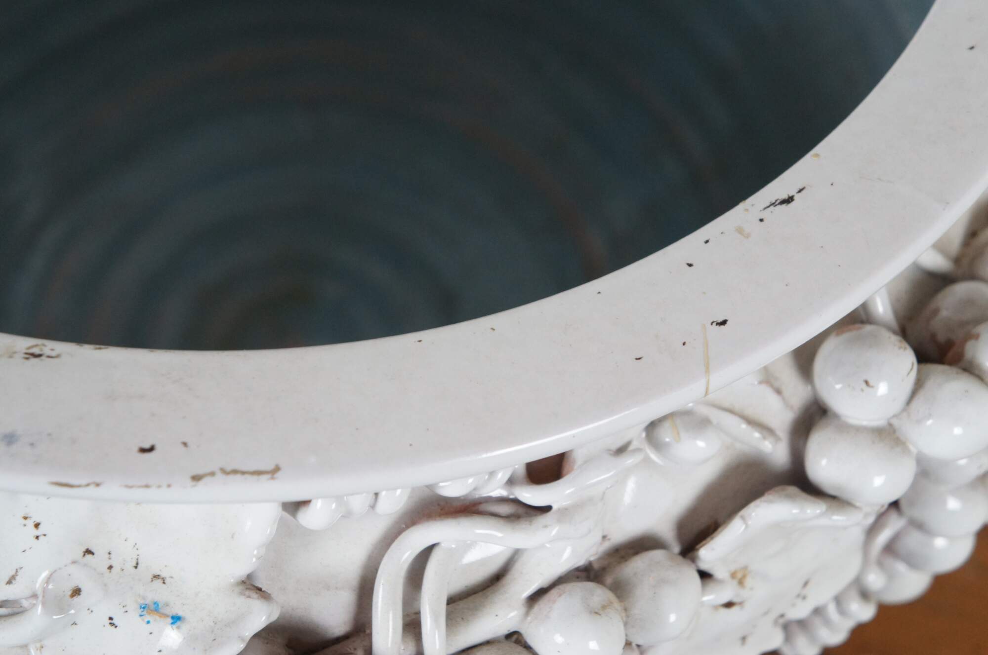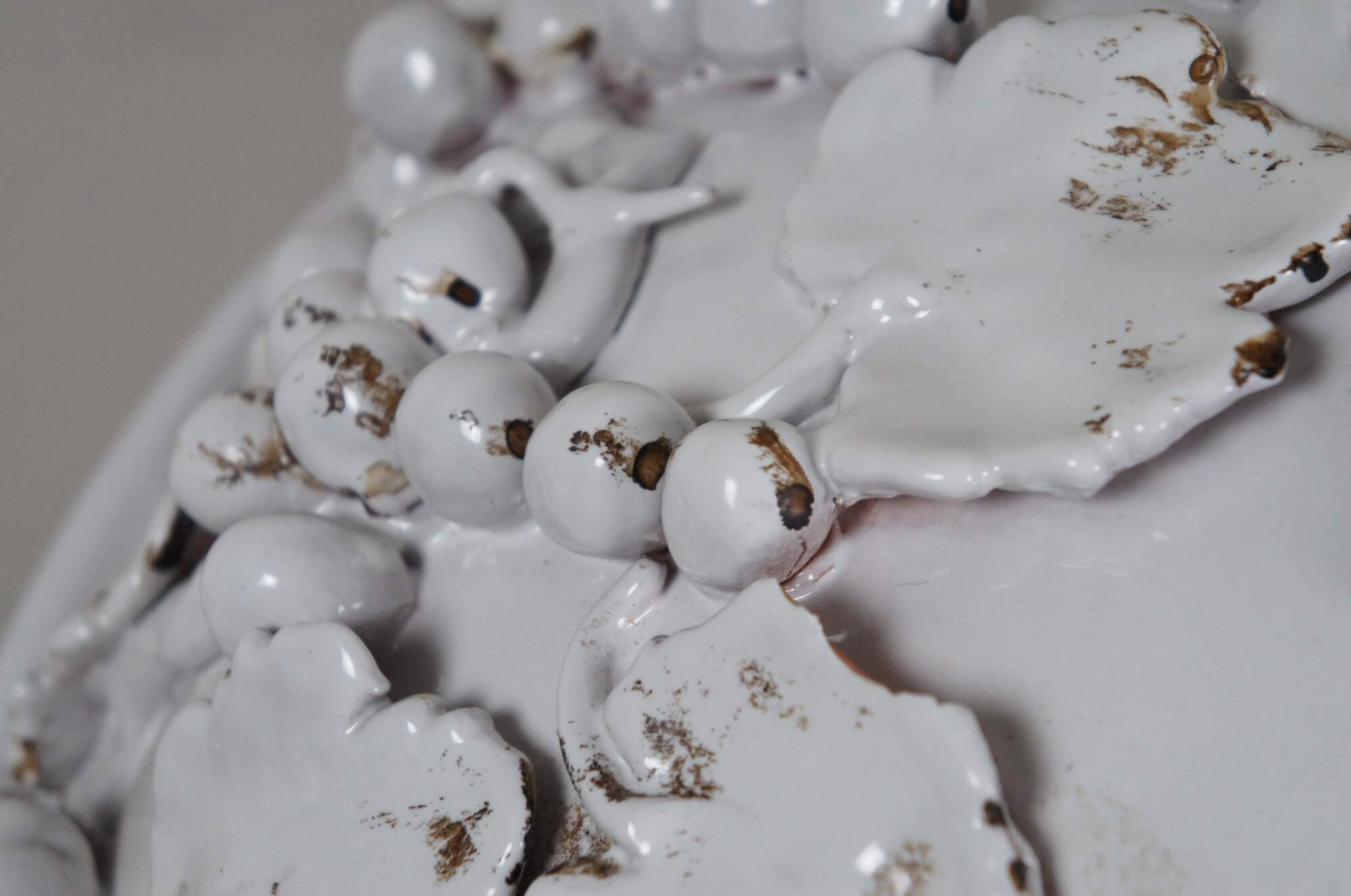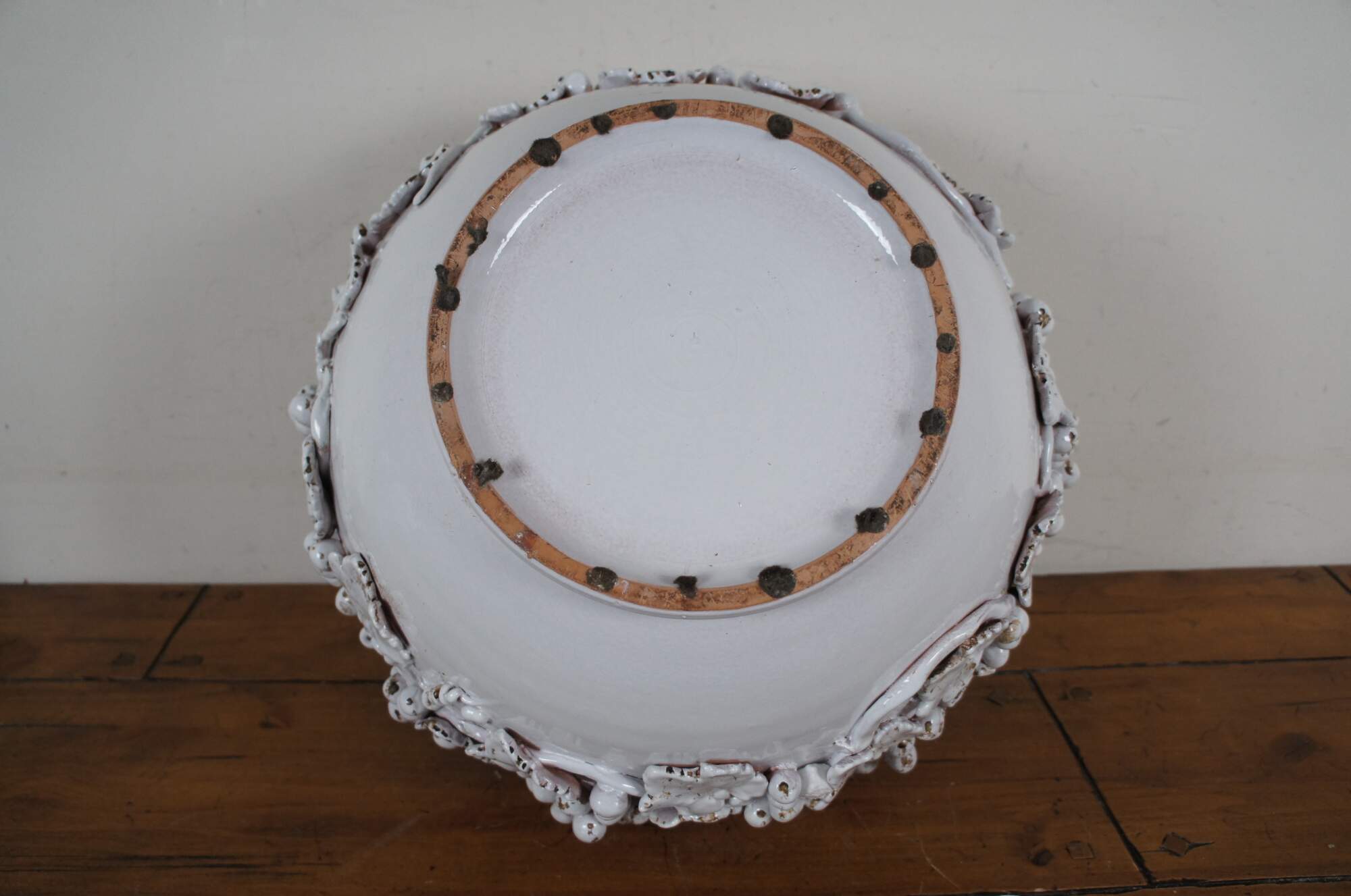 Large white Italian Dolfi Otello Cottura fishbowl shaped terracotta earthenware planter / jardiniere / cachepot, decorated with applied high relief grapevine, fruit and leaves. Finished in a thick white glaze with brushed brown accents underneath and a pale blue interior. Made in Italy for Cottura by Dolfi Otello.