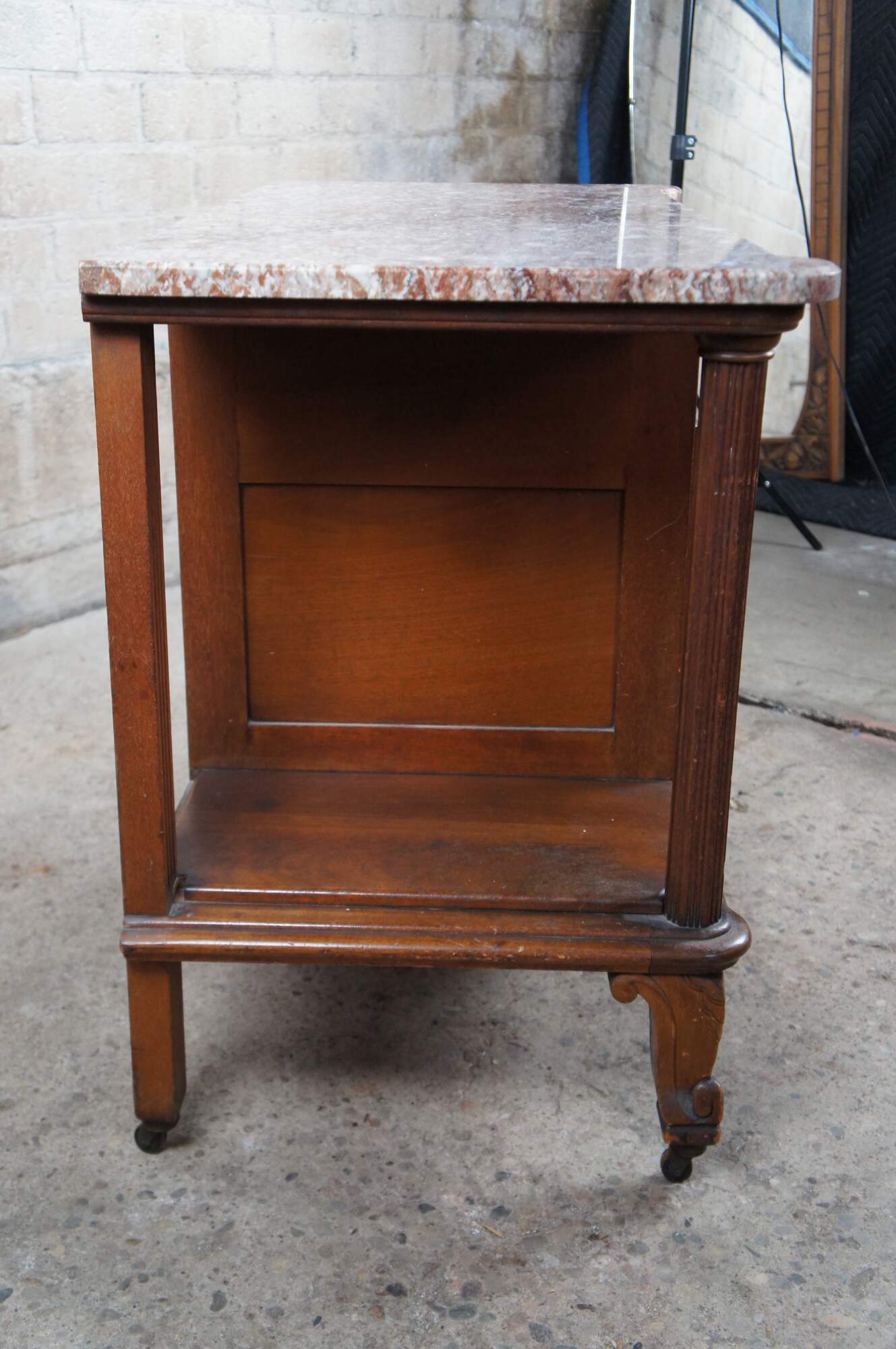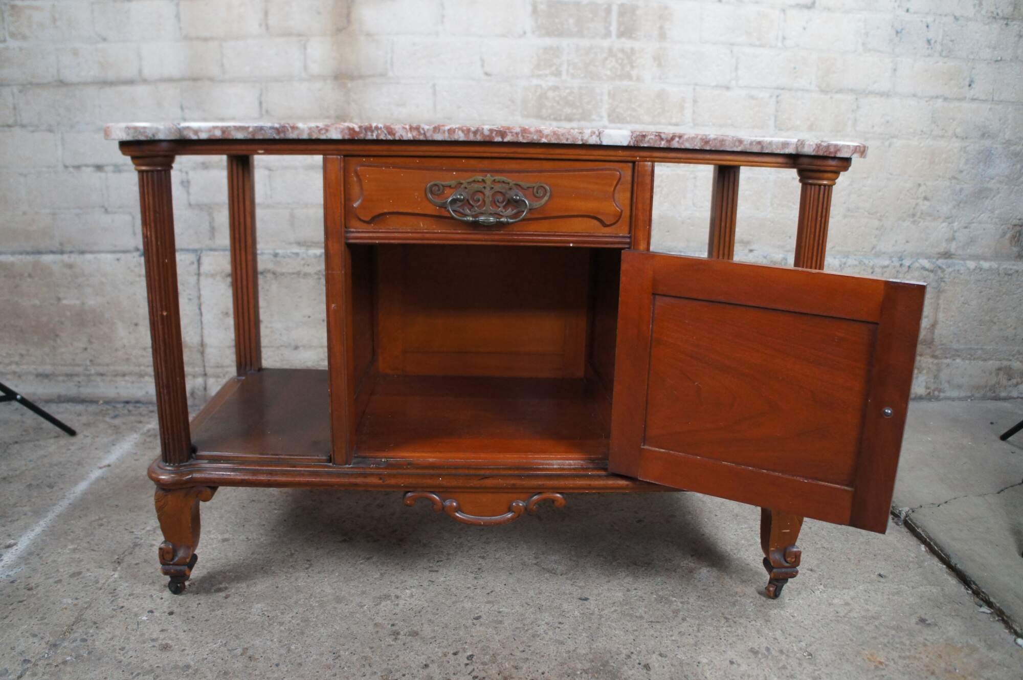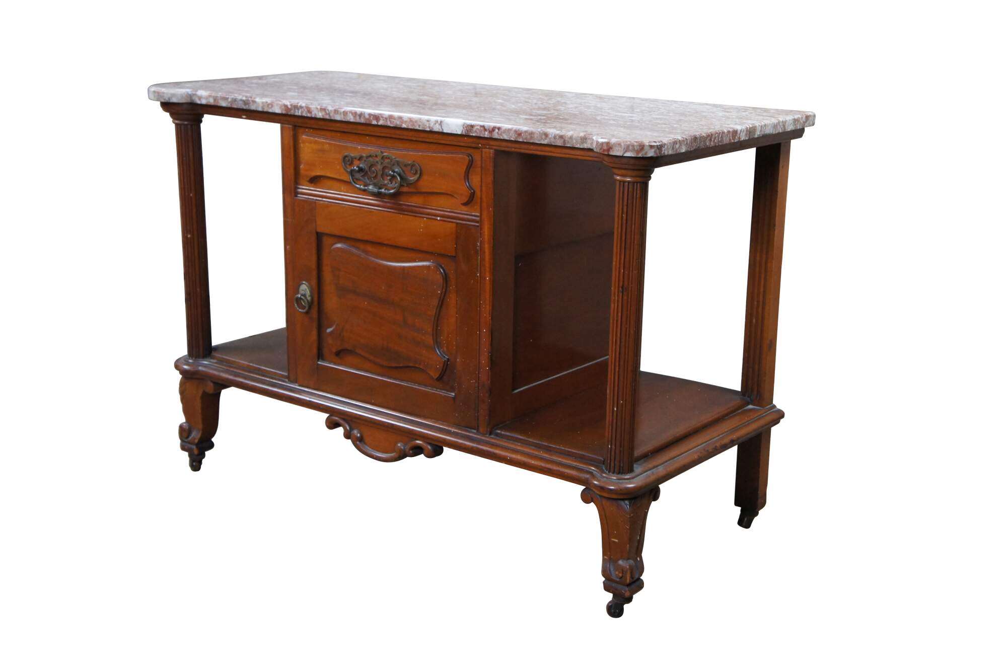 Antique Victorian marble top wash stand / server / console / buffet / sideboard / entry table. Made of walnut featuring upper drawer and lower cabinet with rouge marble top supported by reeded columns and cabriole style legs with castors.