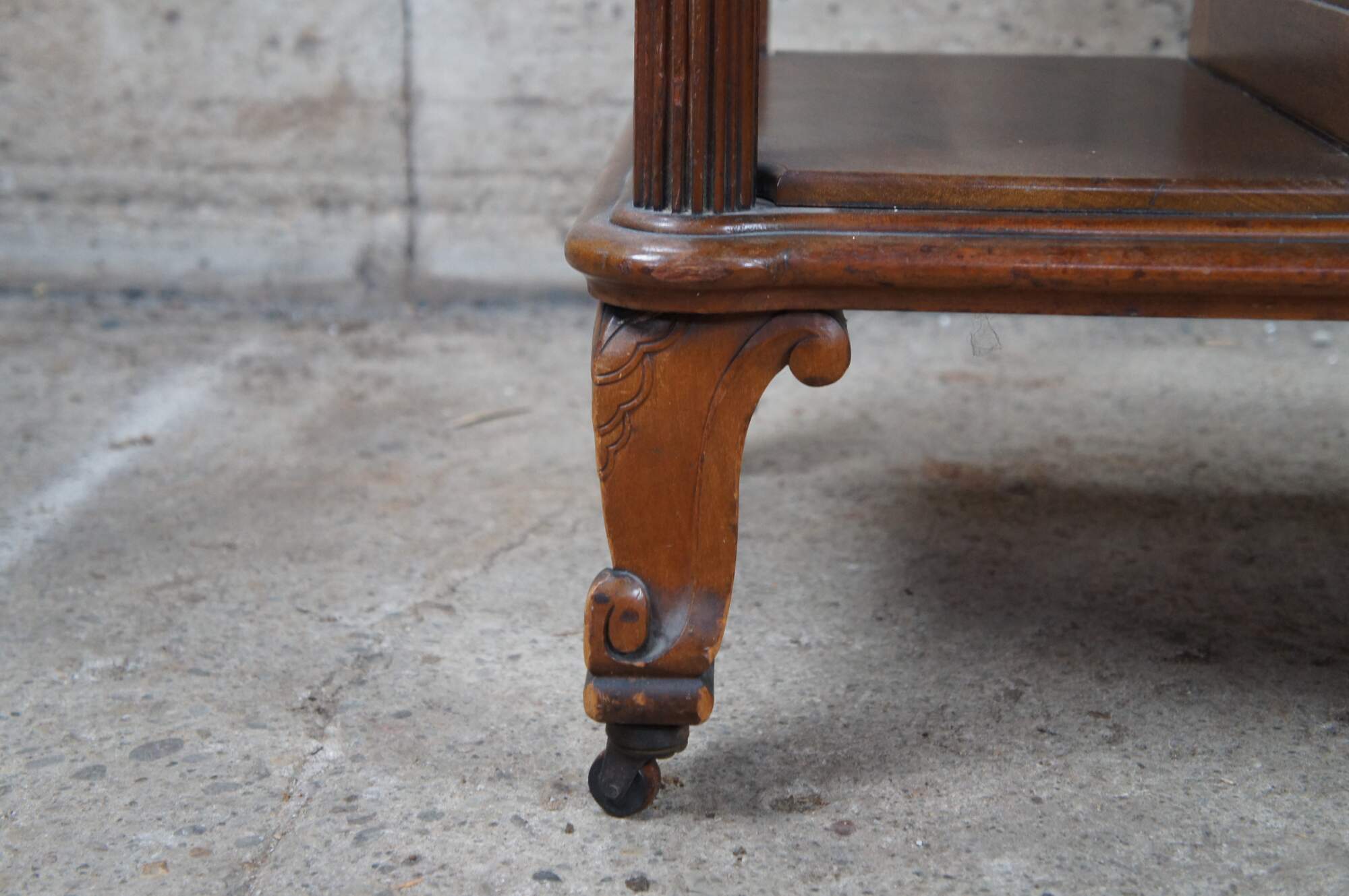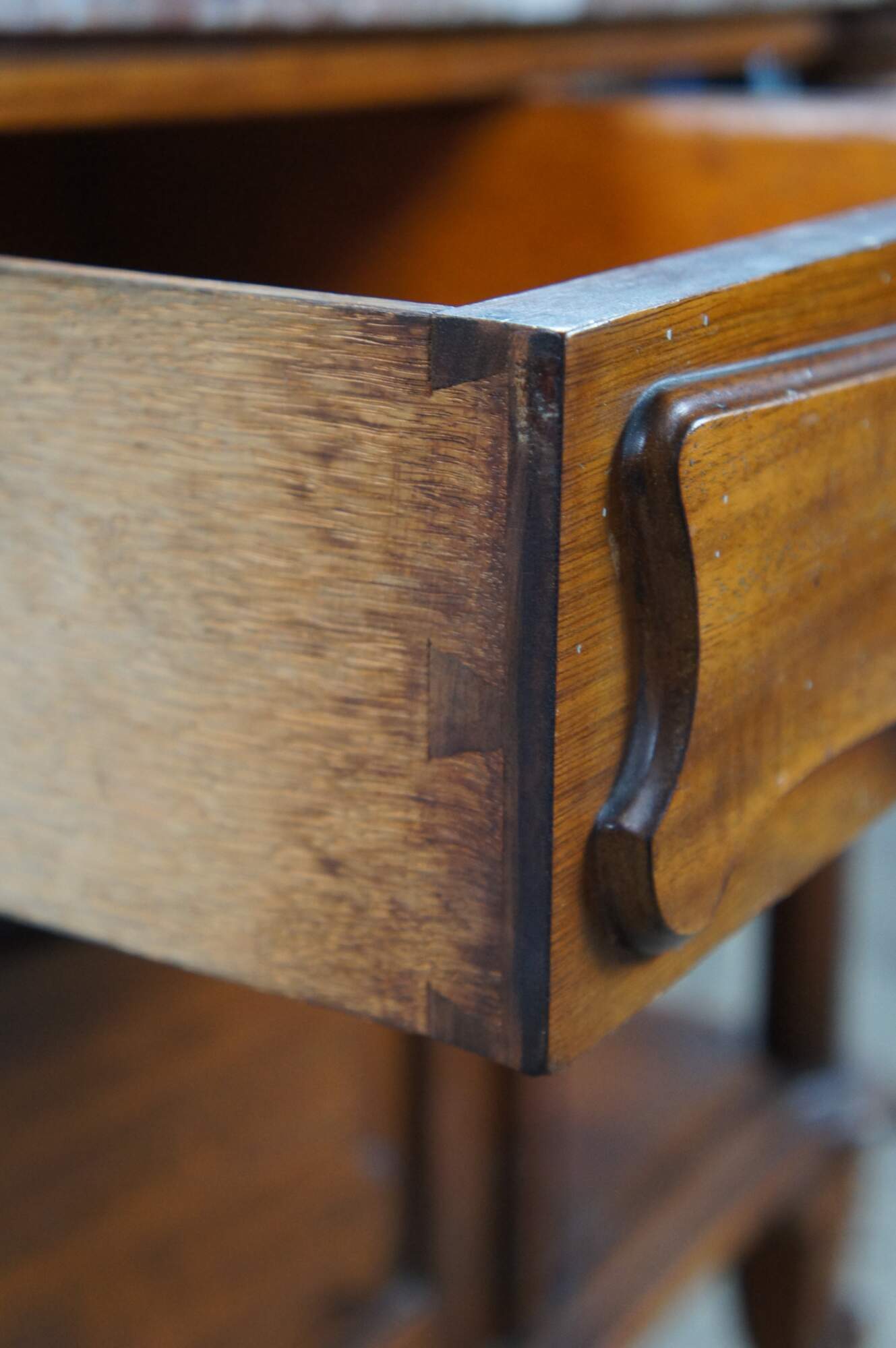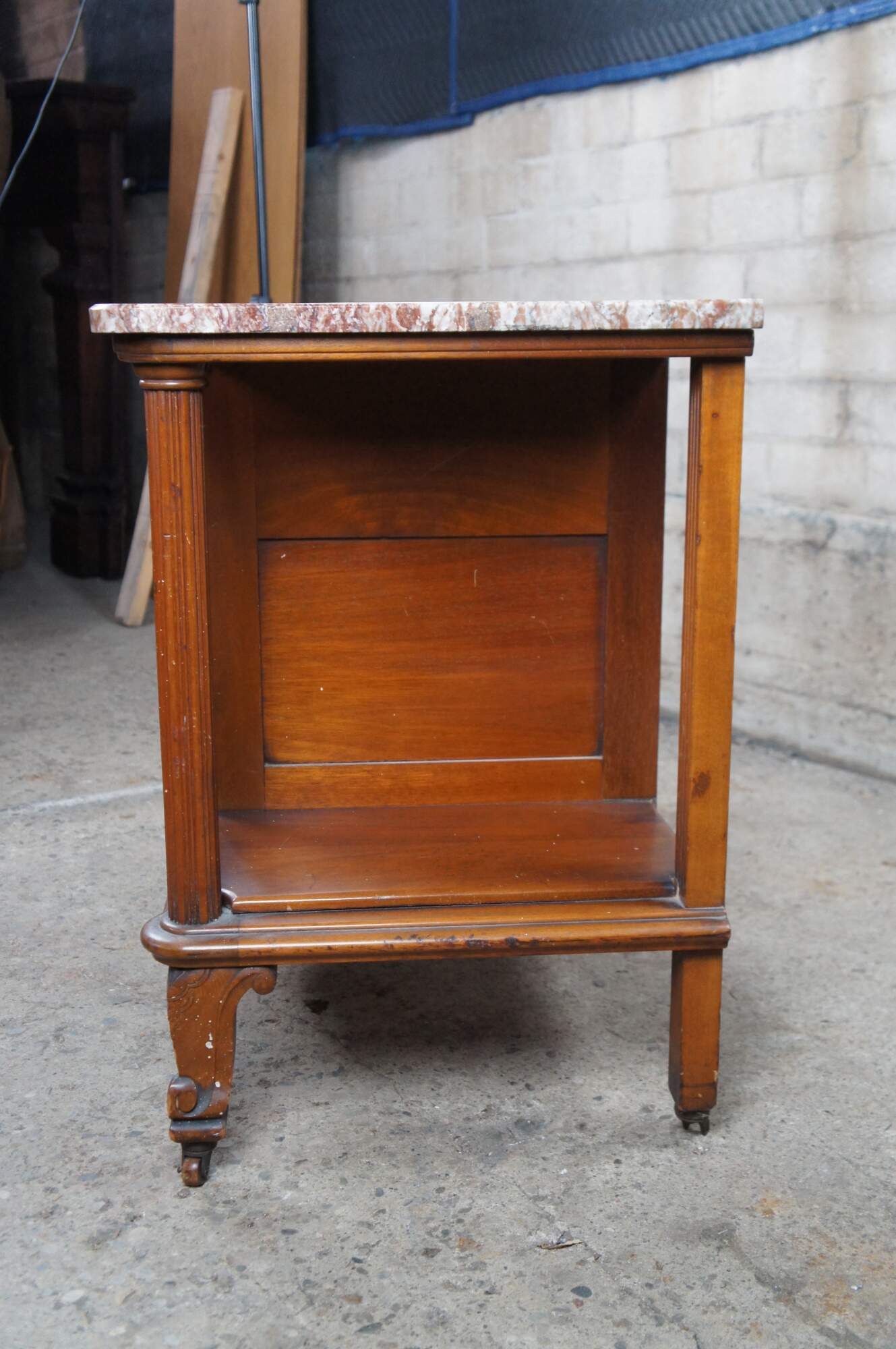 Antique Victorian marble top wash stand / server / console / buffet / sideboard / entry table. Made of walnut featuring upper drawer and lower cabinet with rouge marble top supported by reeded columns and cabriole style legs with castors.
