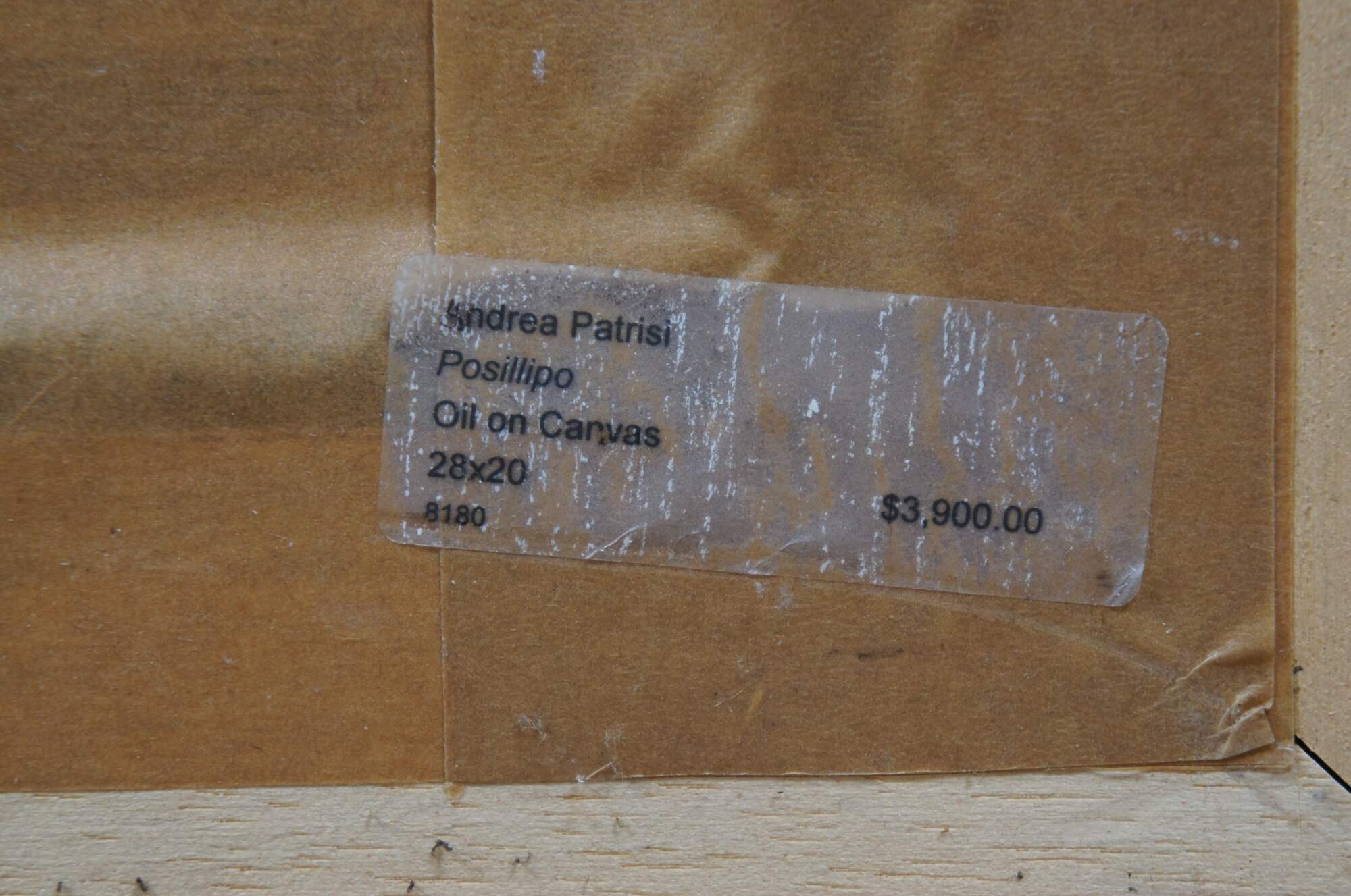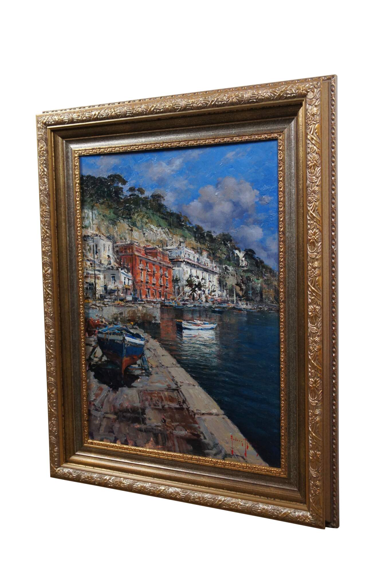 Late 20th century Italian seascape oil painting on board titled Posillipo by Andrea Patrisi, depicting a harbour view of the residential area of Posillipo on the Gulf of Naples. Signed in lower right corner. Signed and titled on reverse. Beveled gold frame.