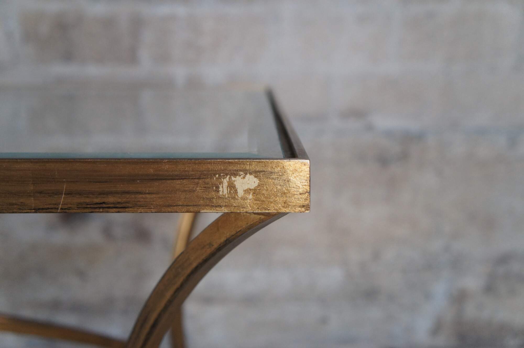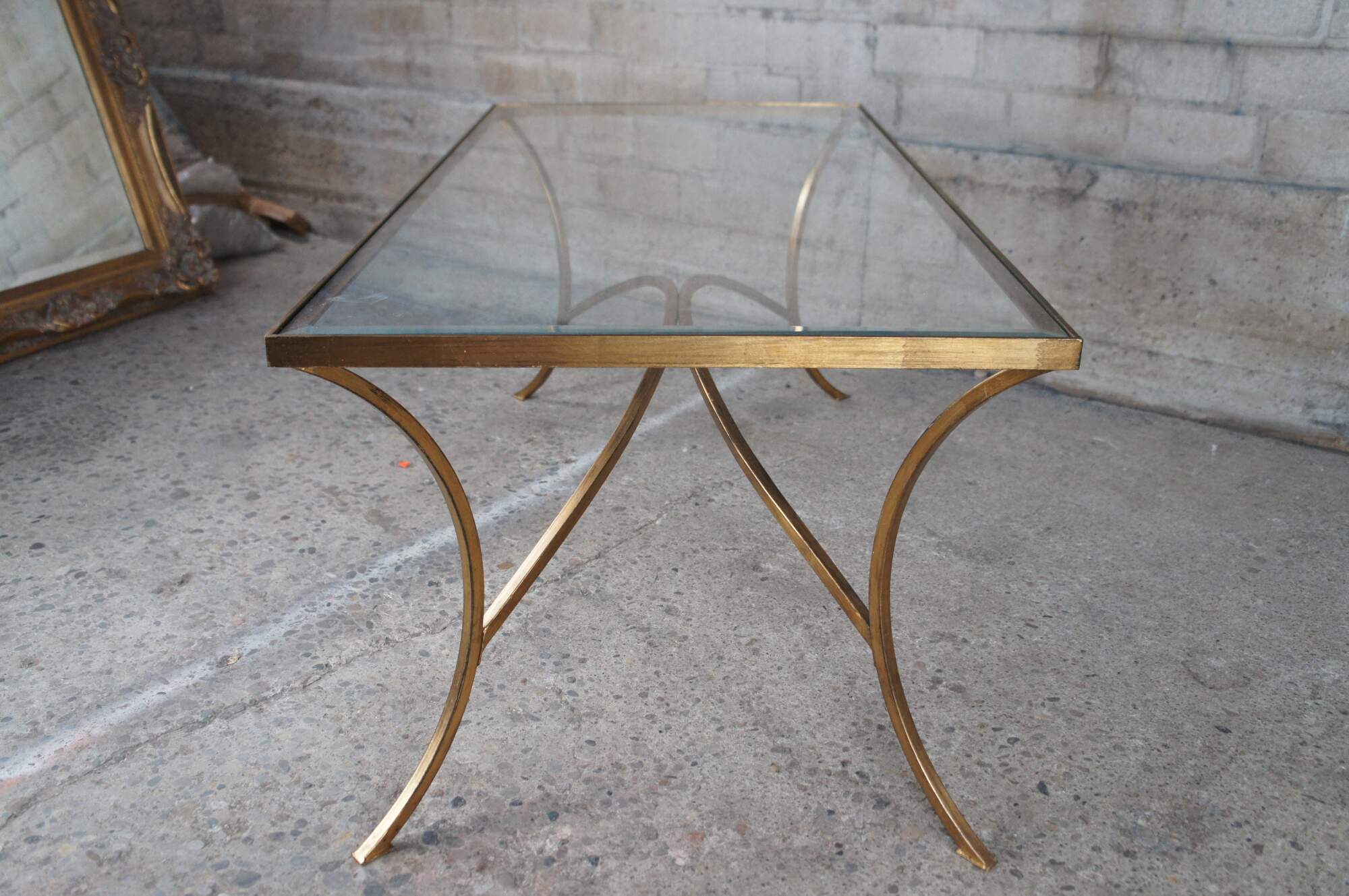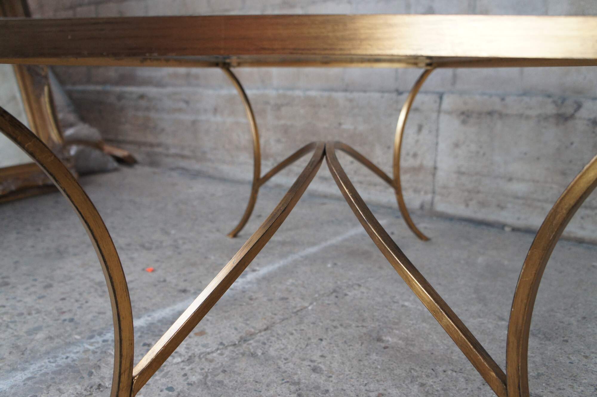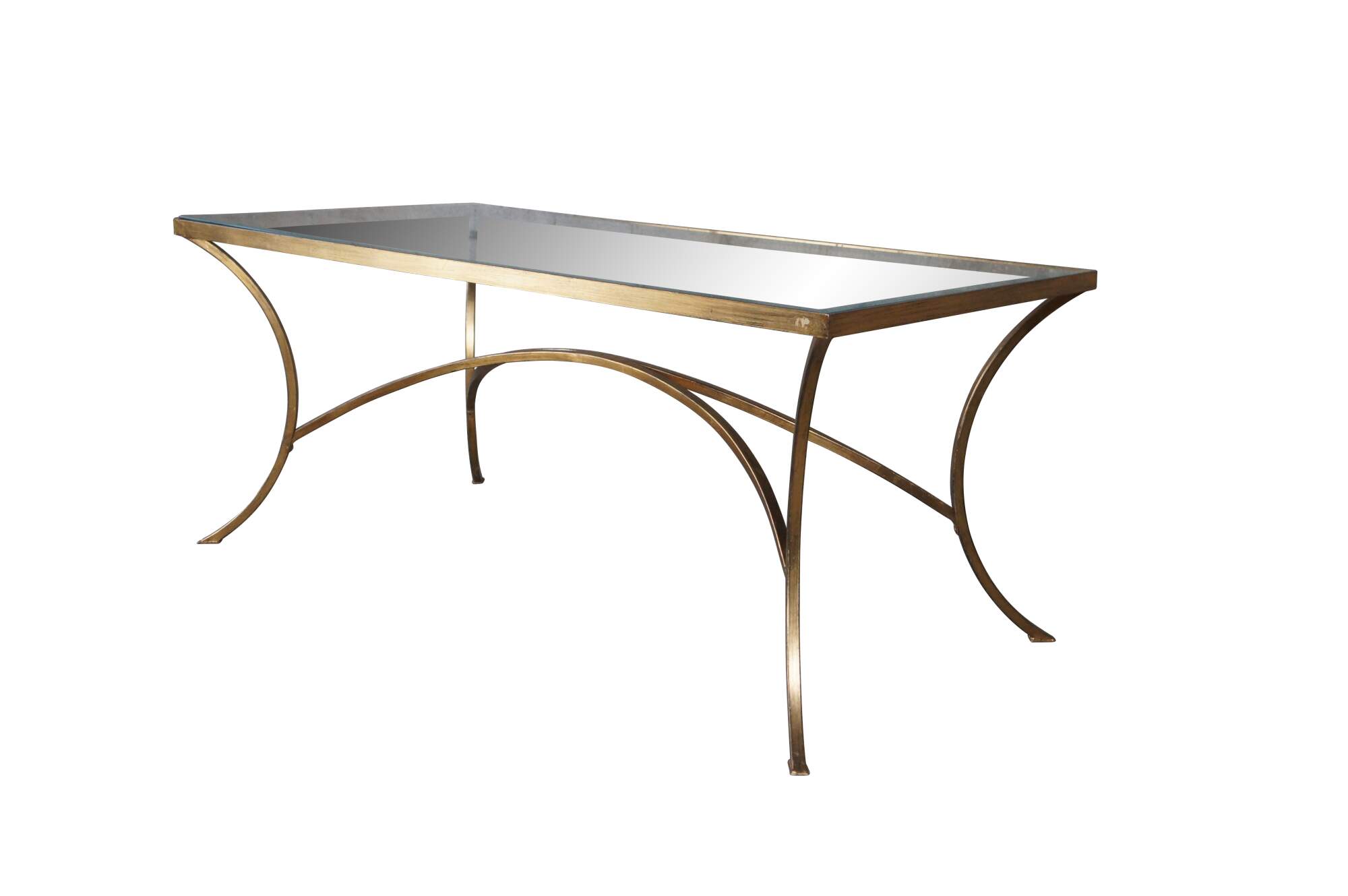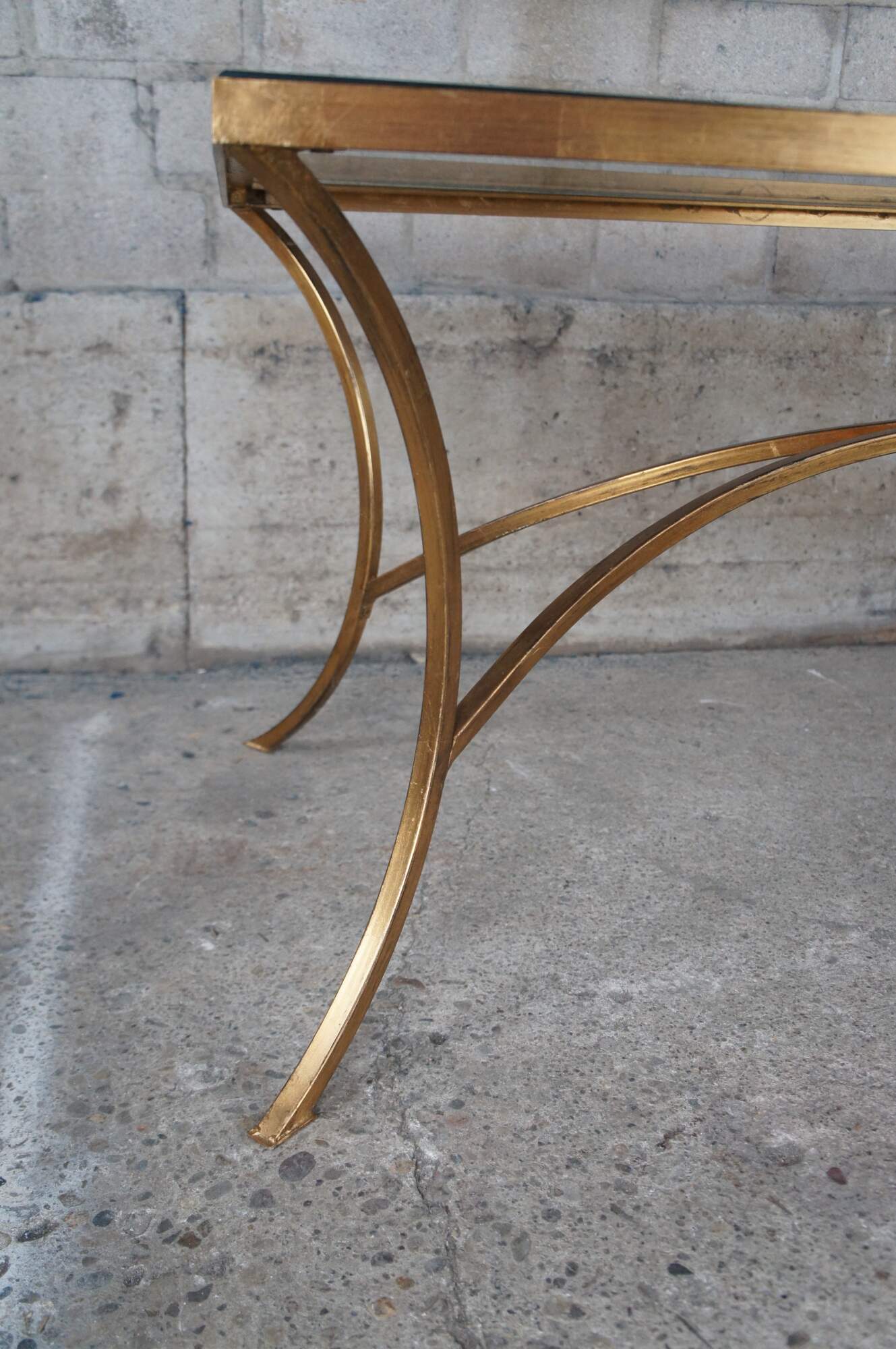 Vintage Uttermost Alayna modern coffee or tea table designed by Matthew Williams. Gracefully arched hand forged iron finished in heavily antiqued gold leaf. Top is clear beveled tempered glass.
