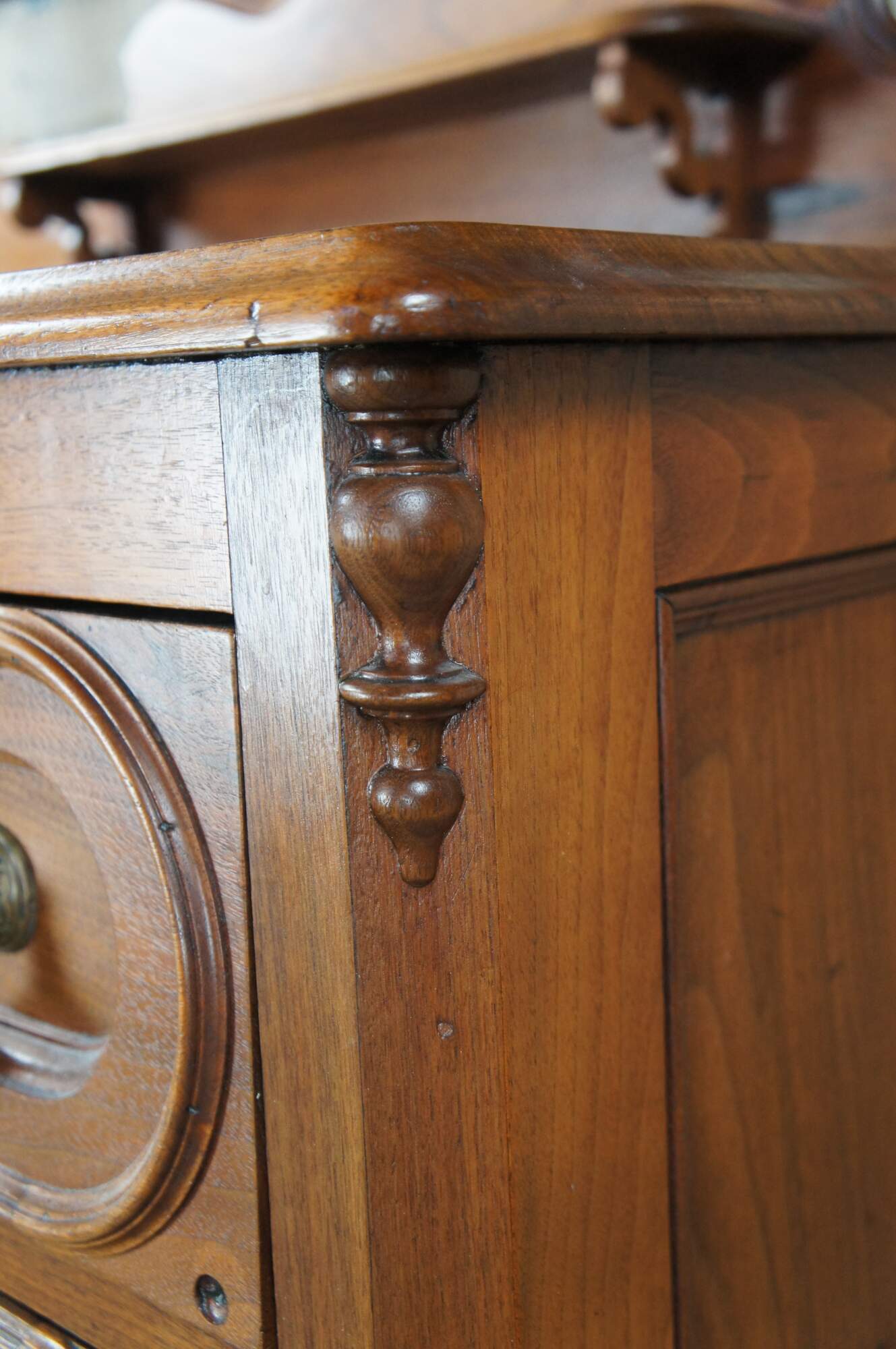 Antique Victorian chest of drawers / dresser. Made of walnut featuring three paneled drawers with brass / ebonized tear drop hardware and ornate serpentine backsplash with shelf.