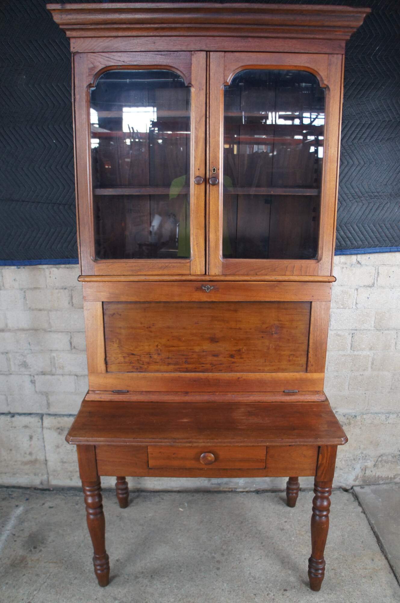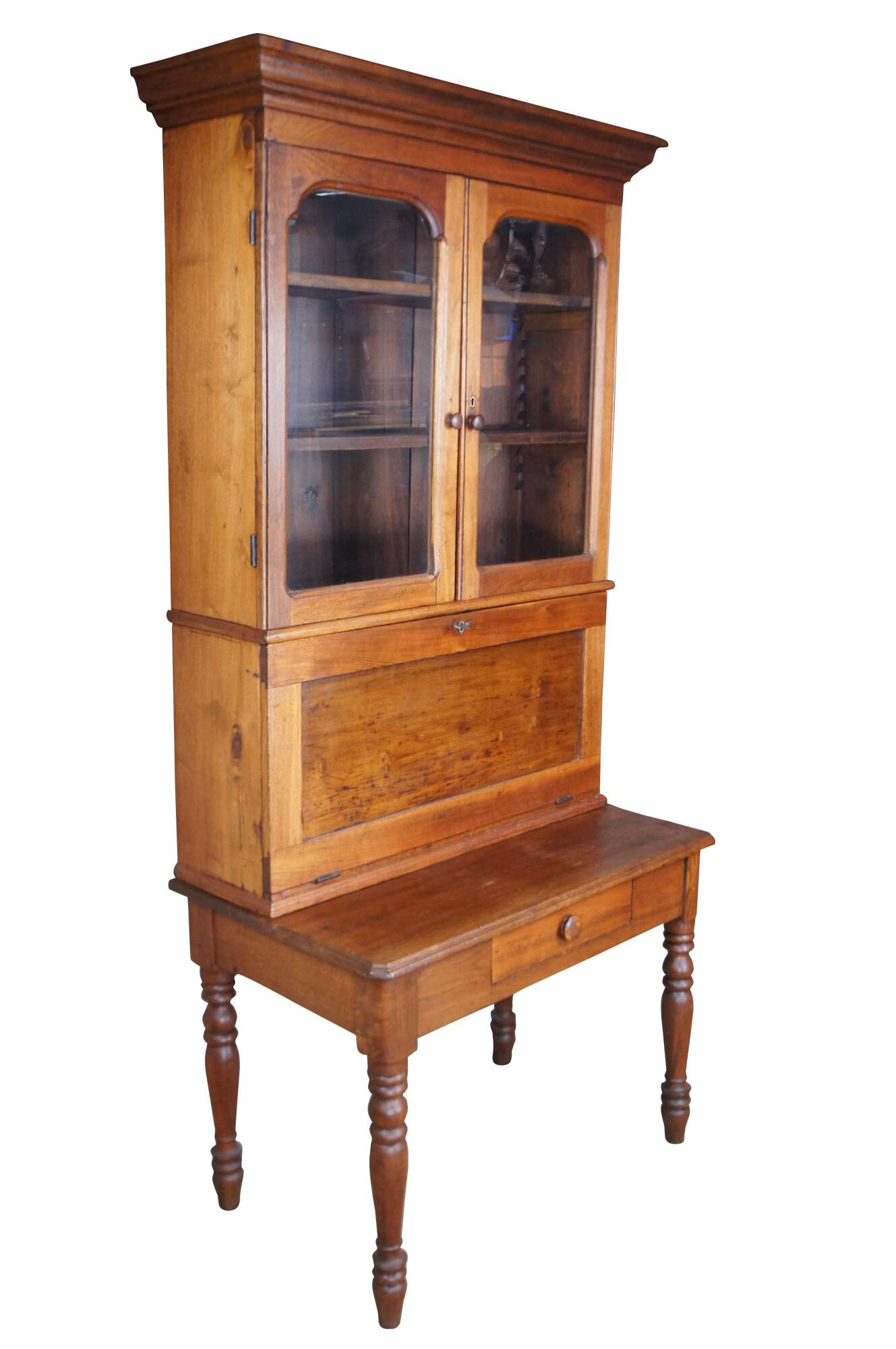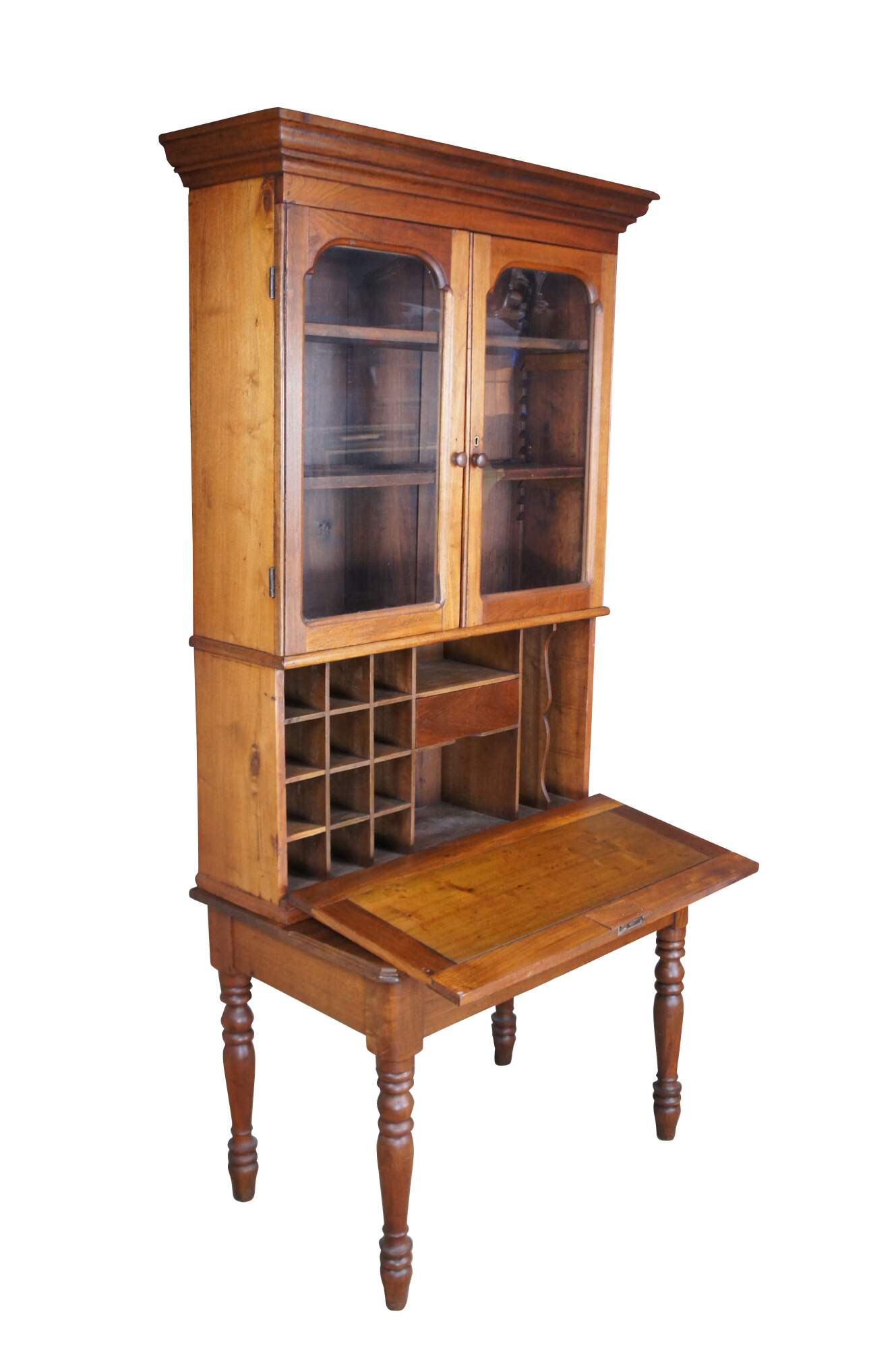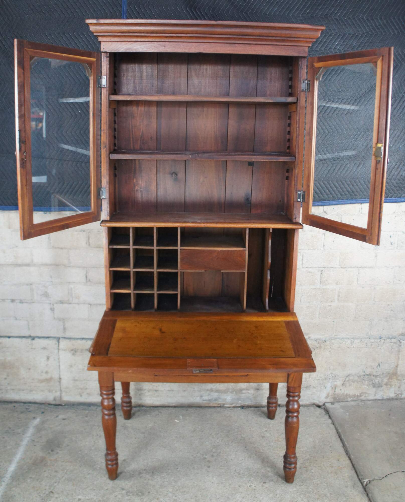 An equisite Early American Plantation, clerk or mail Desk, Circa mid 19th C.. This exceptional 2 piece desk features a lower desk with hand dovetailed drawer over four hand turned legs. The hutch portion showcases a large drop or fall front opening to several pigeon holes and a centrally located drawer. Above the secretary is a two door glass display with two adjustable shelves. A truly remarkable timless cabinet with veratilty and charm.