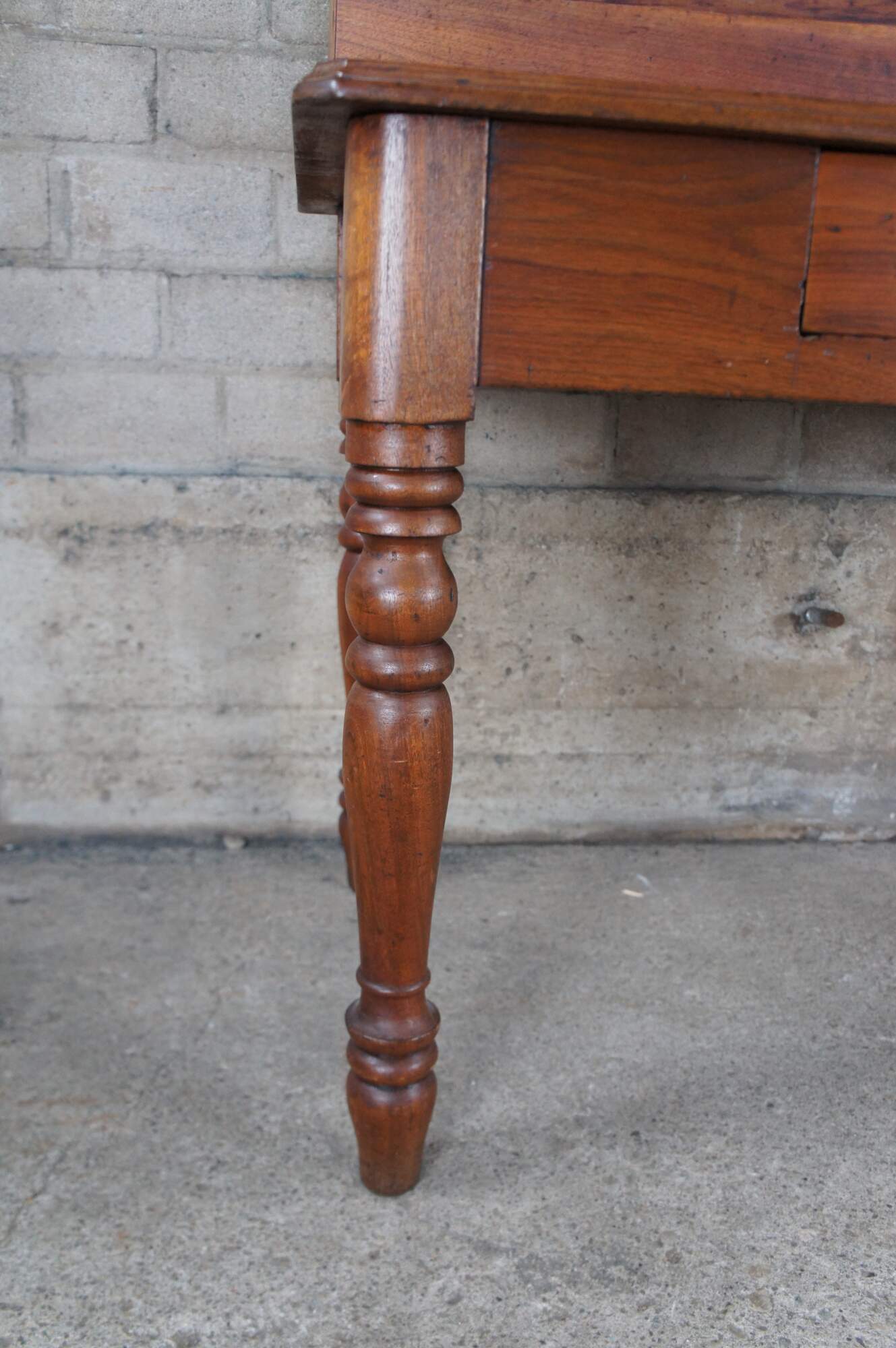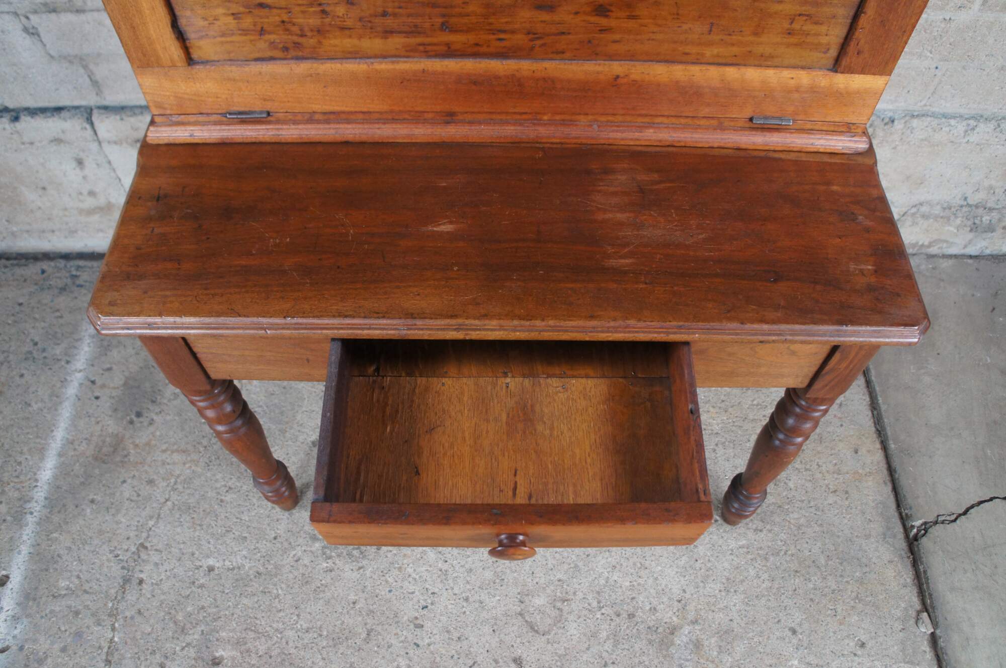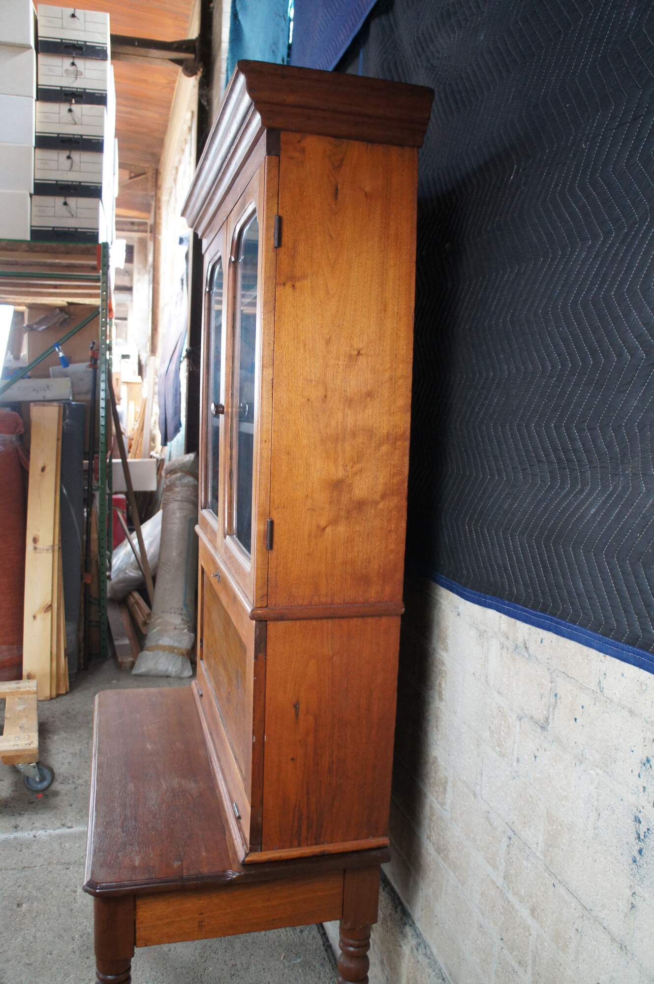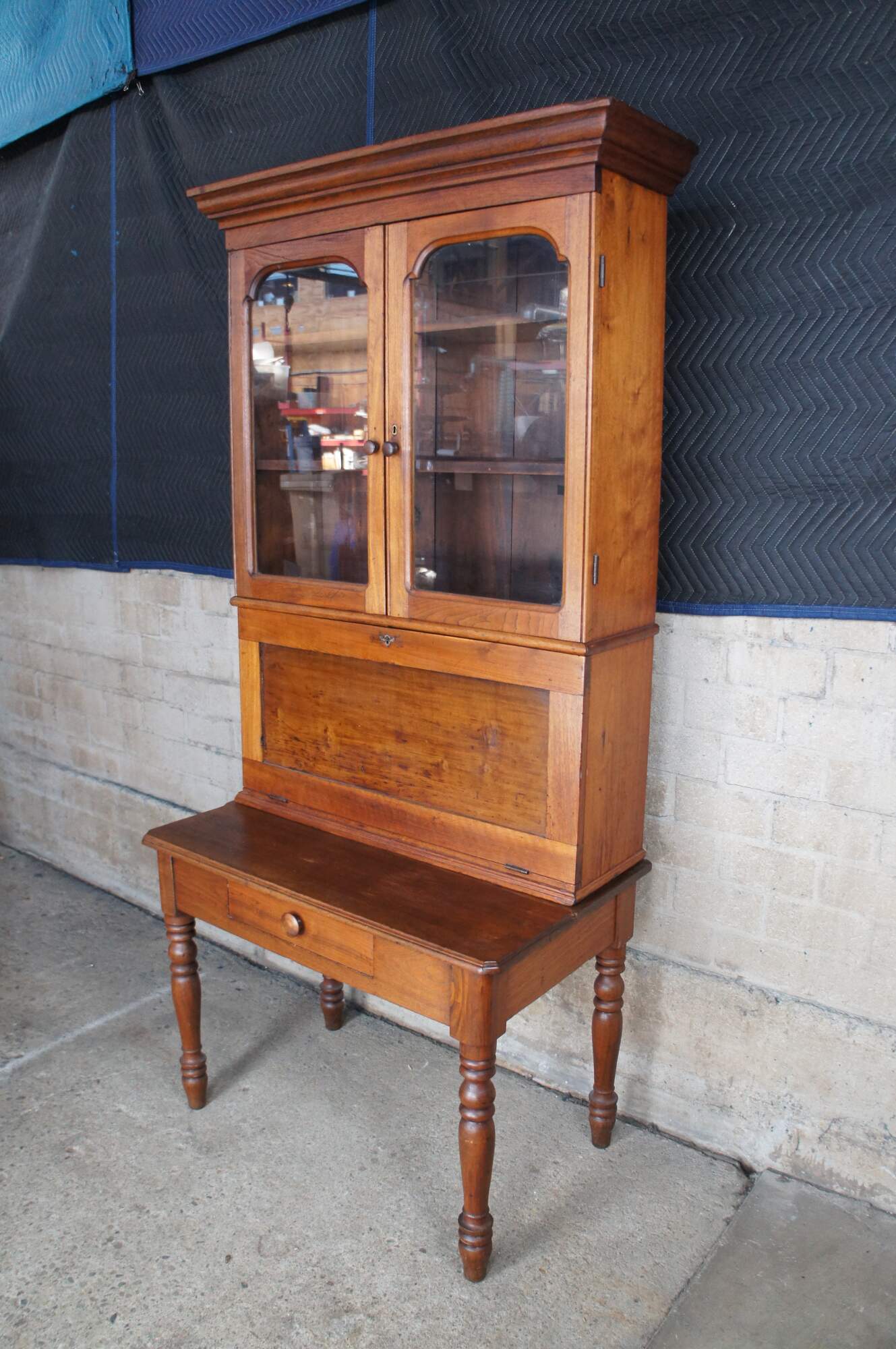 An equisite Early American Plantation, clerk or mail Desk, Circa mid 19th C.. This exceptional 2 piece desk features a lower desk with hand dovetailed drawer over four hand turned legs. The hutch portion showcases a large drop or fall front opening to several pigeon holes and a centrally located drawer. Above the secretary is a two door glass display with two adjustable shelves. A truly remarkable timless cabinet with veratilty and charm.
