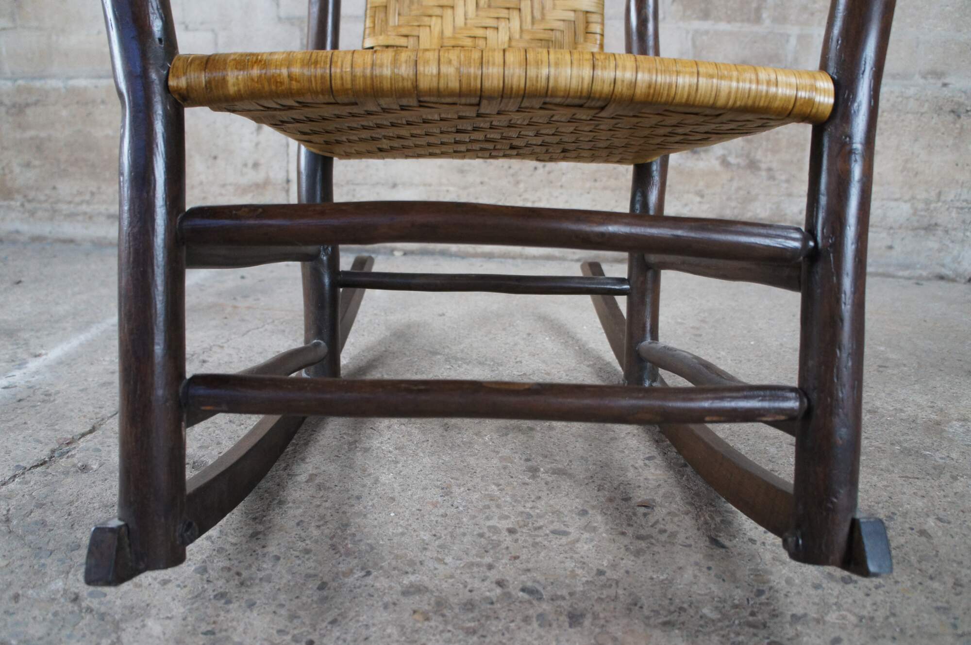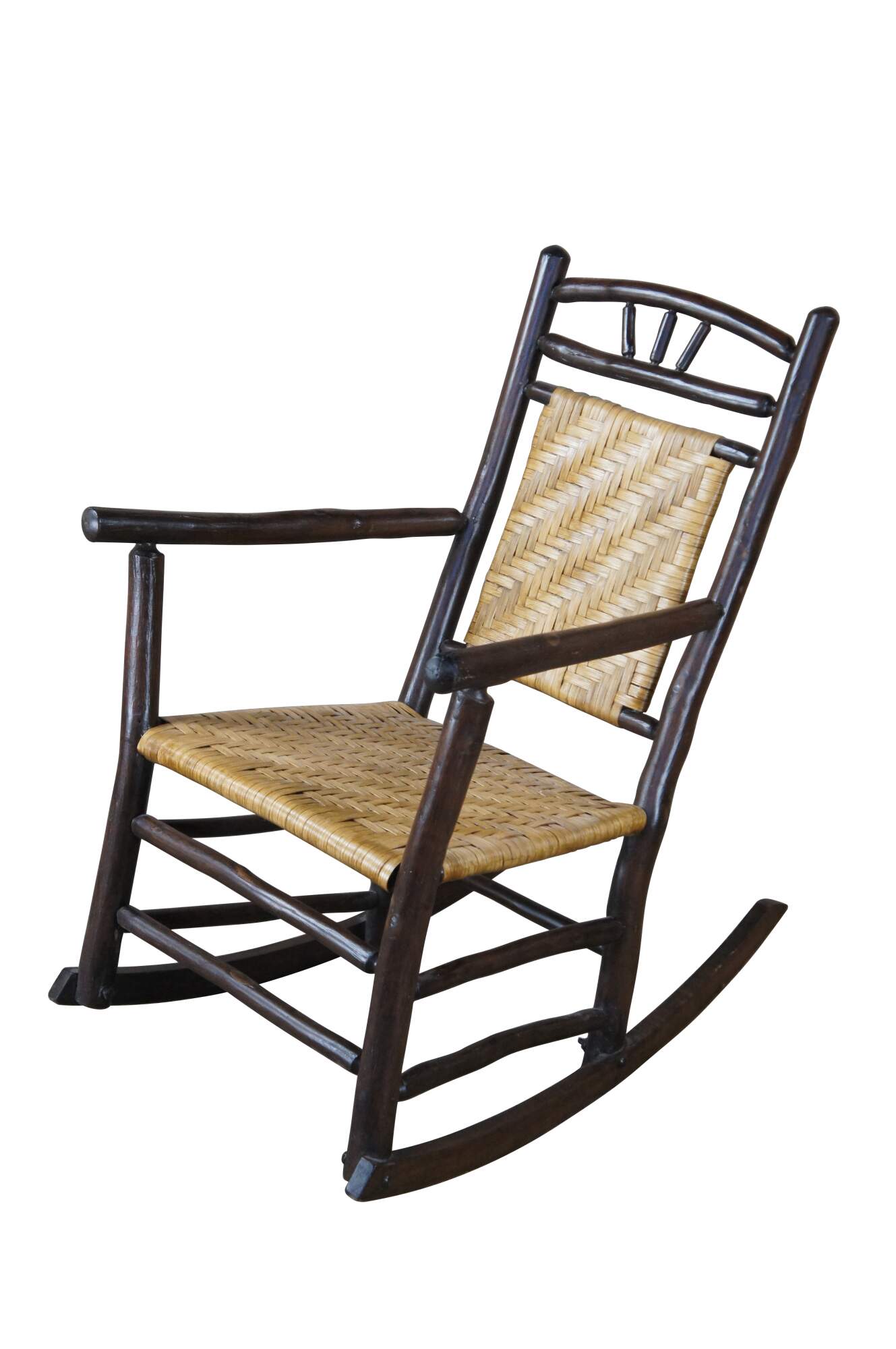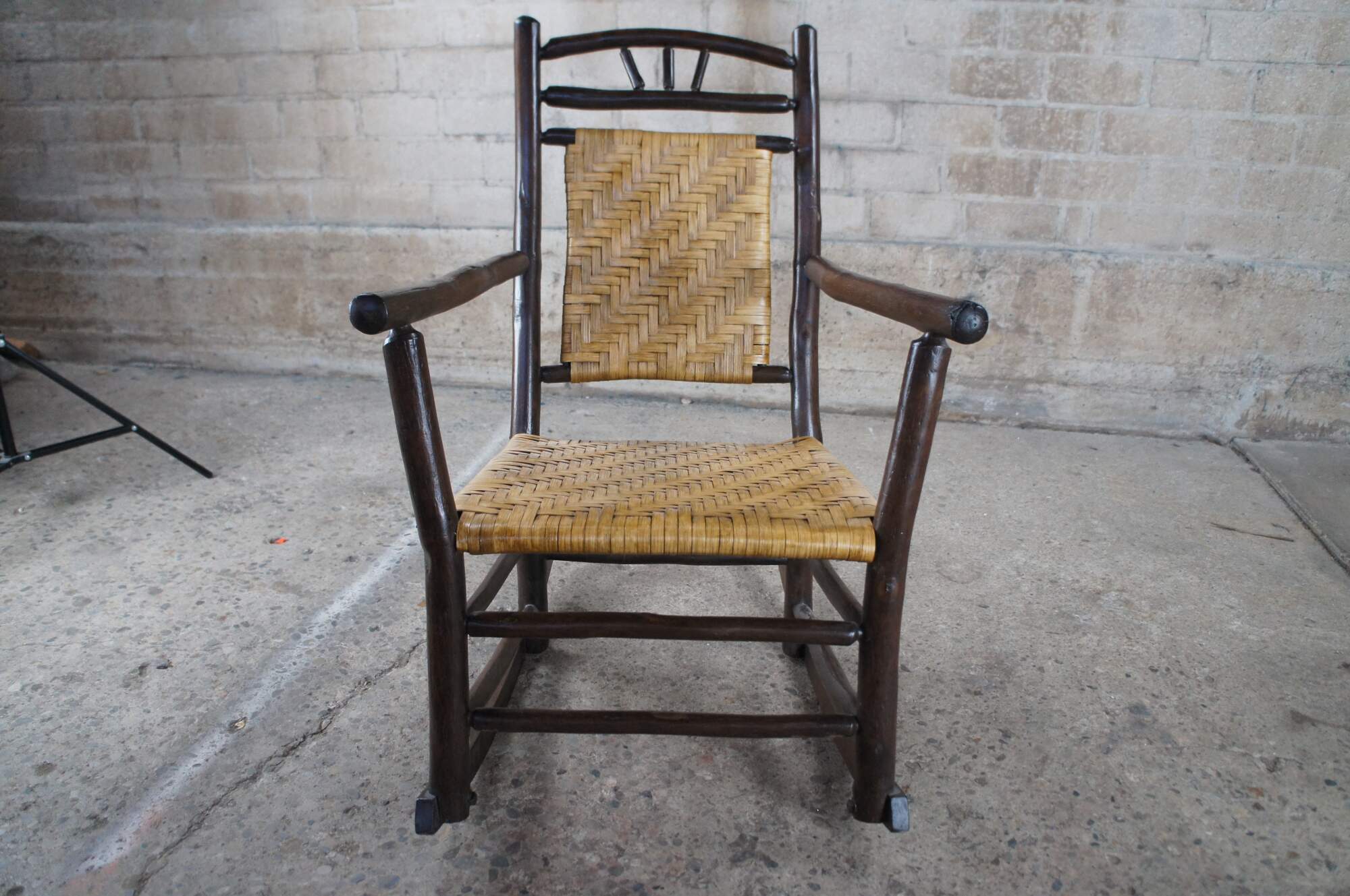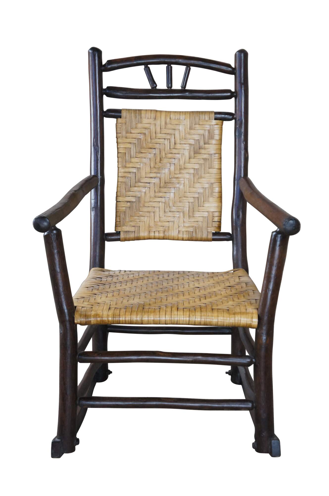 Rocking armchair by Old Hickory Furniture Company of Martinsville, Indiana. Features a primitive Adirondack style with flared arms and rattan seat.