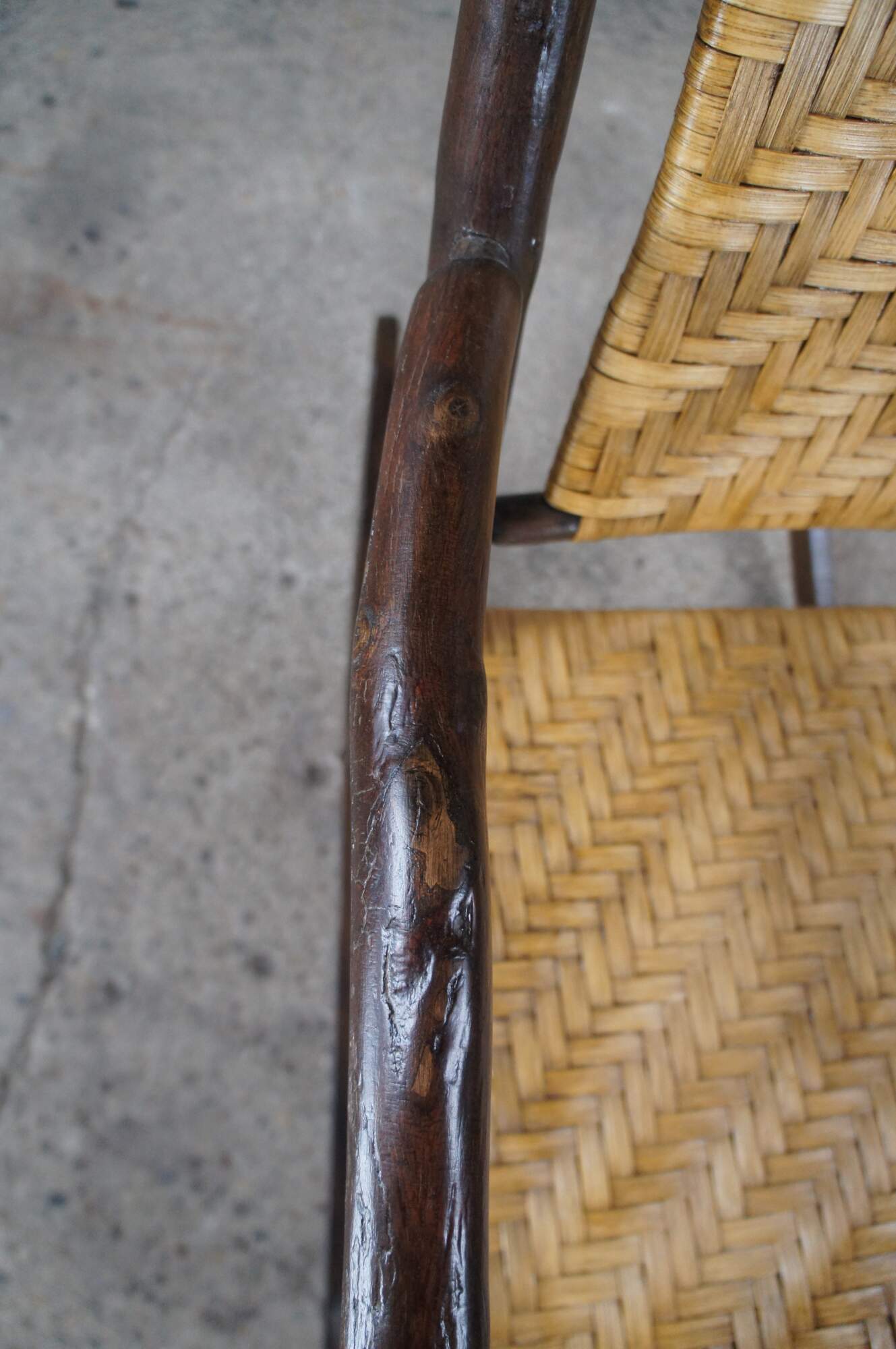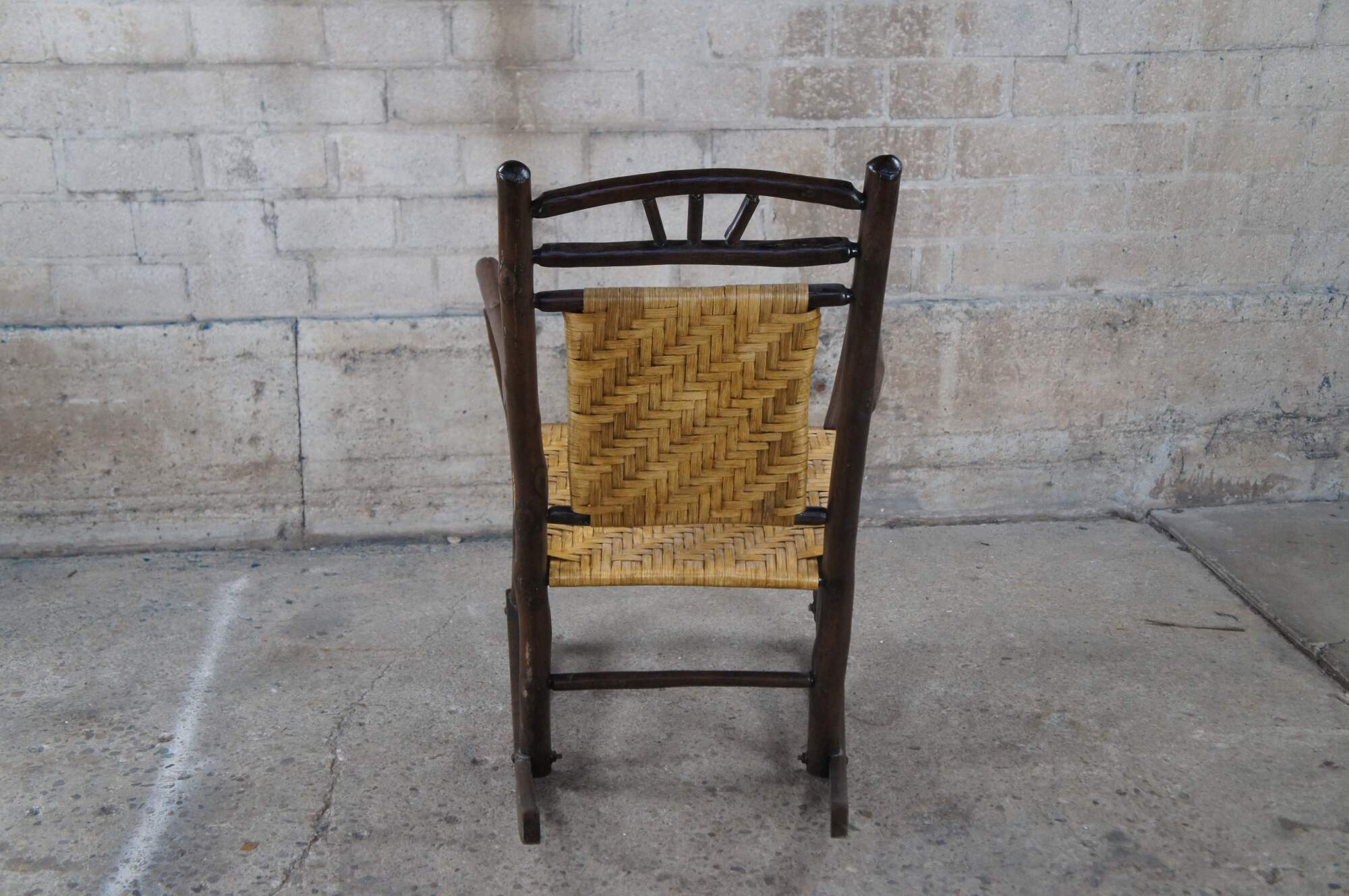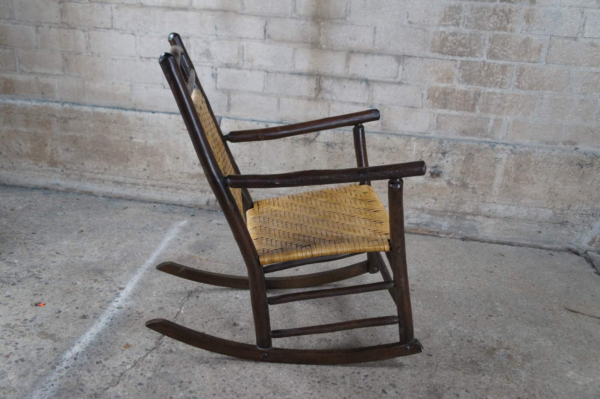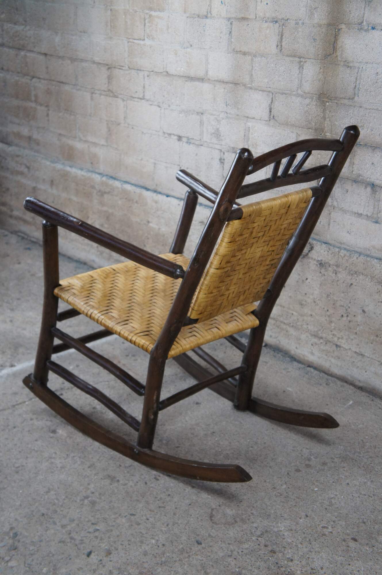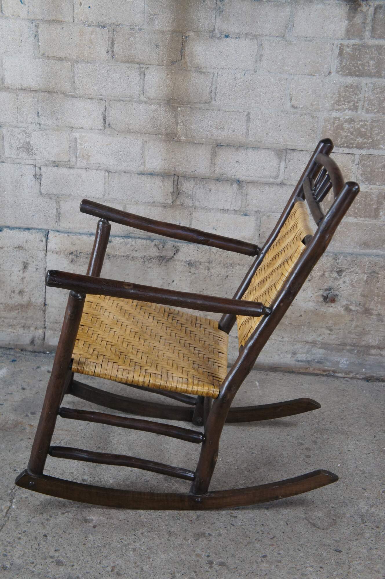 Rocking armchair by Old Hickory Furniture Company of Martinsville, Indiana. Features a primitive Adirondack style with flared arms and rattan seat.