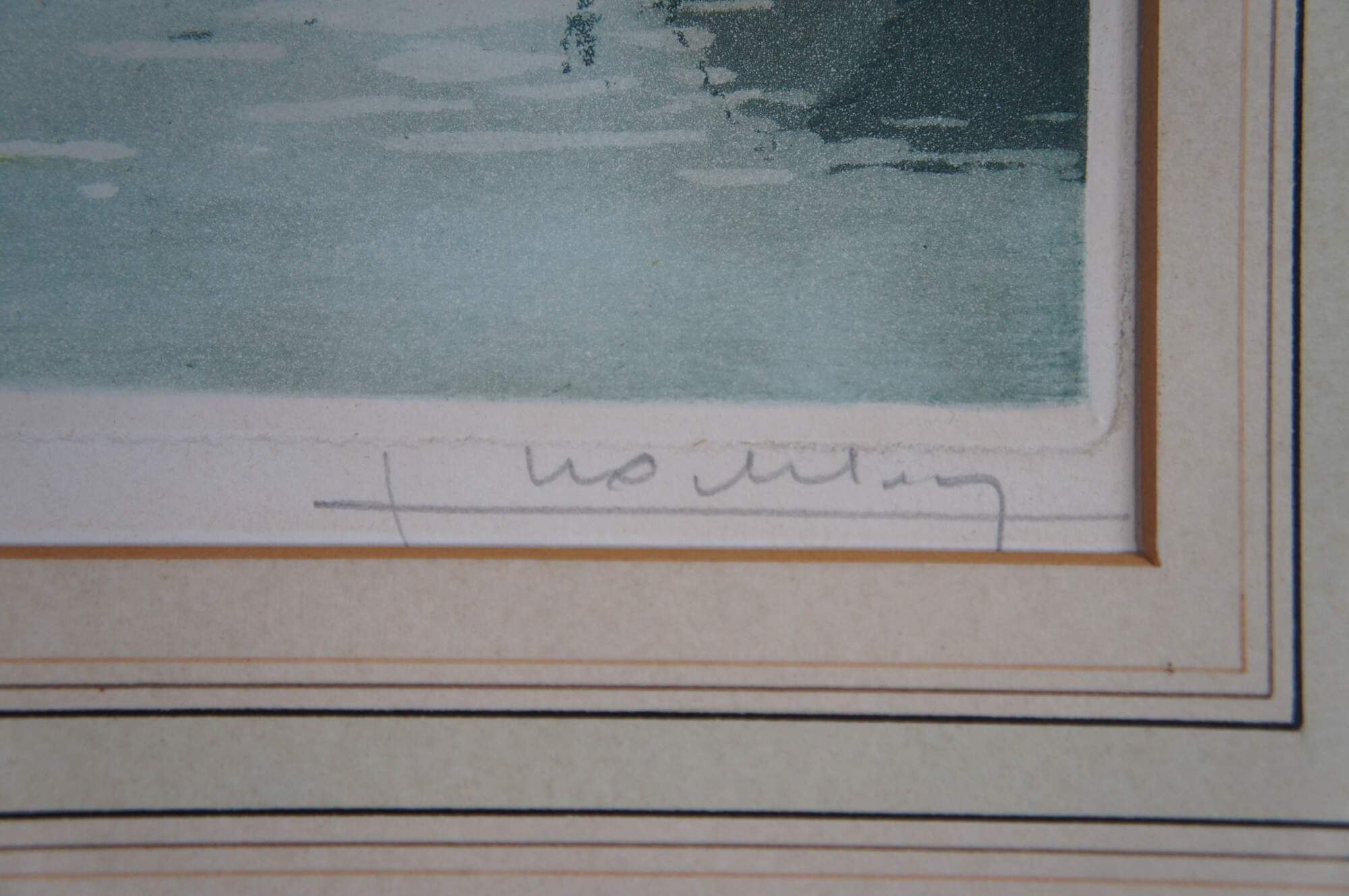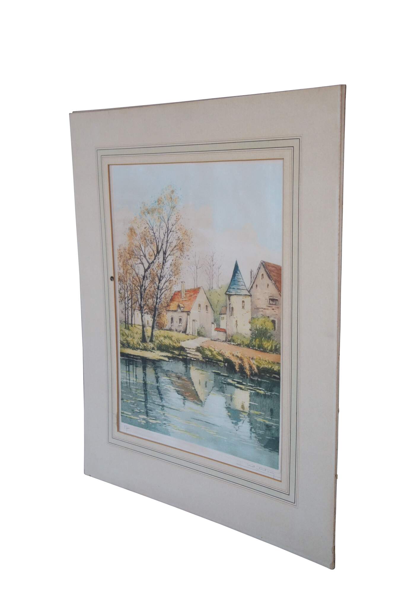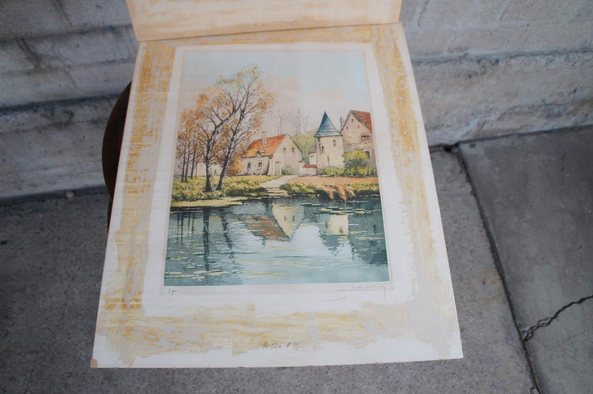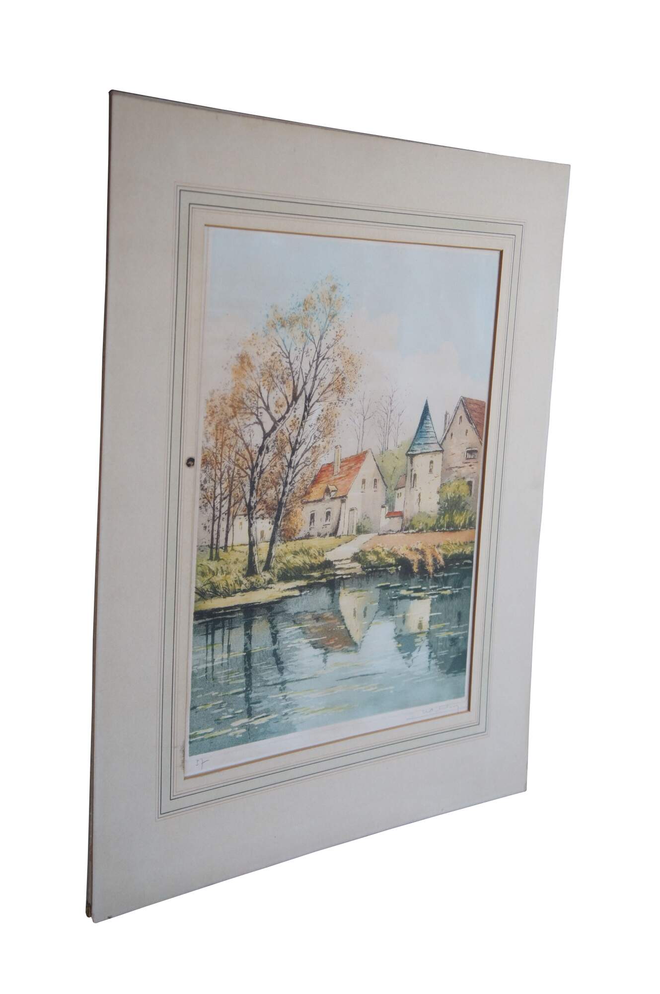 Hand Signed German Etching. Features a European fall landscape showing famrhouse besies a river or lake. Signed in pencil lower right