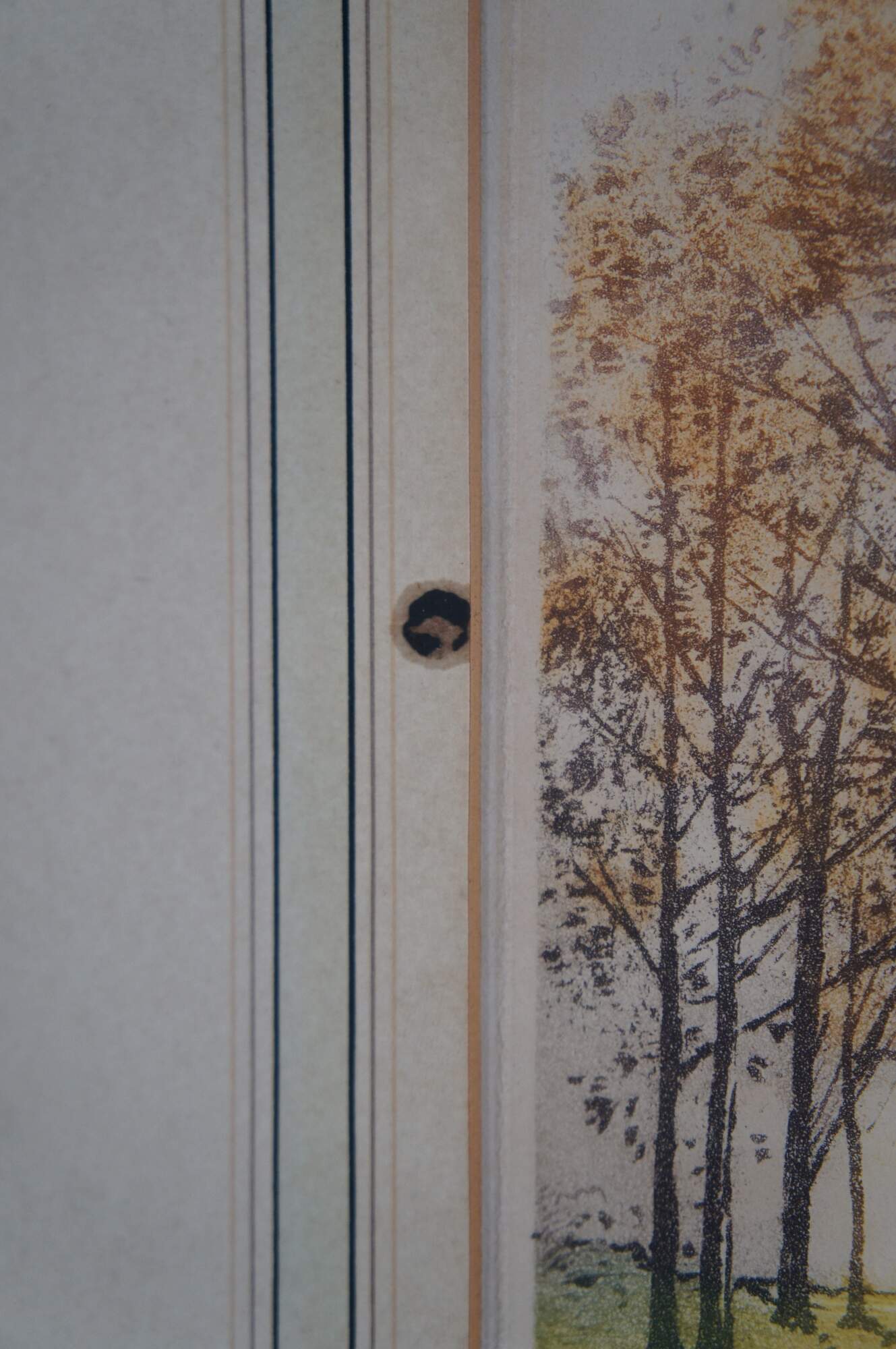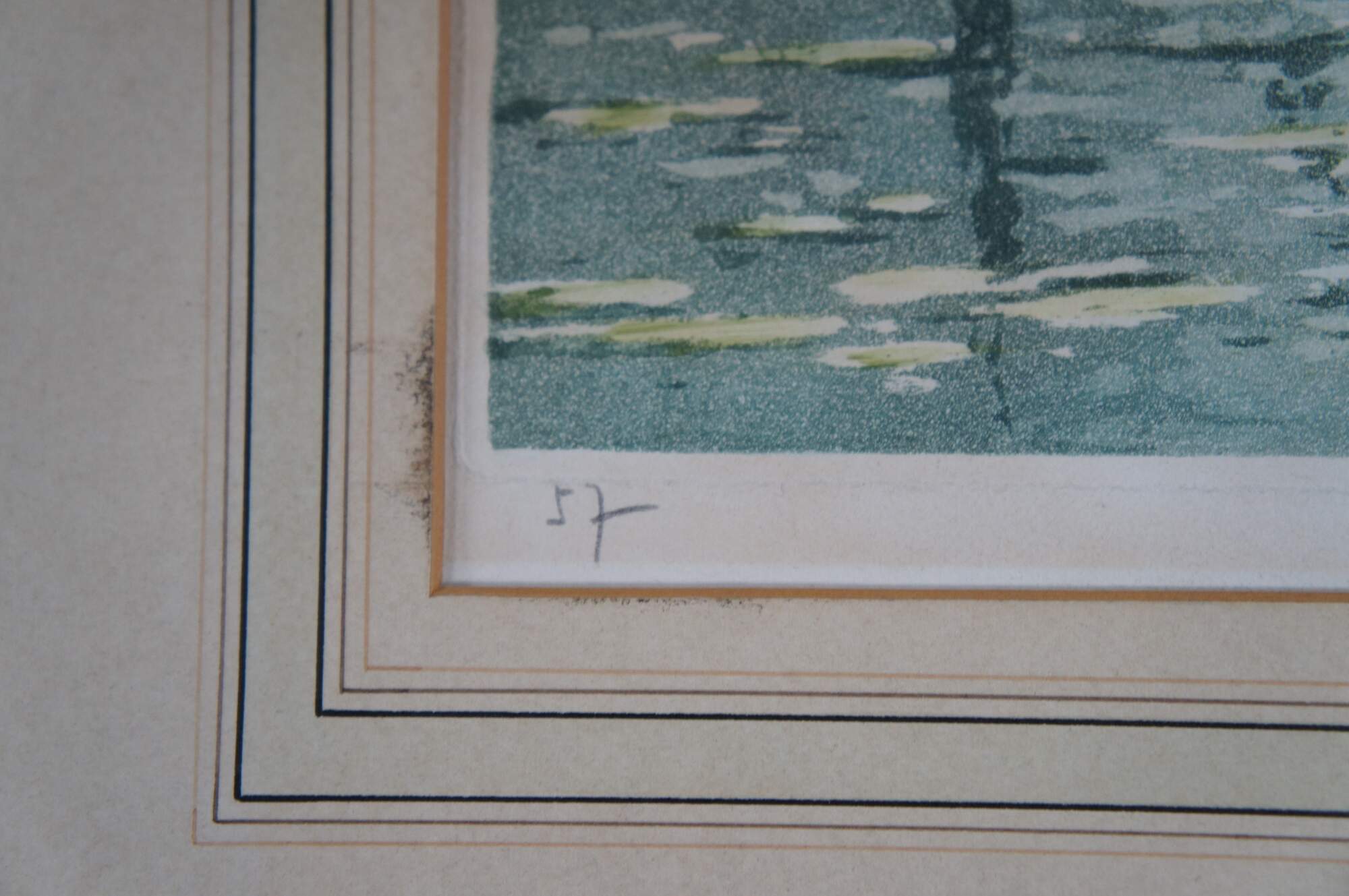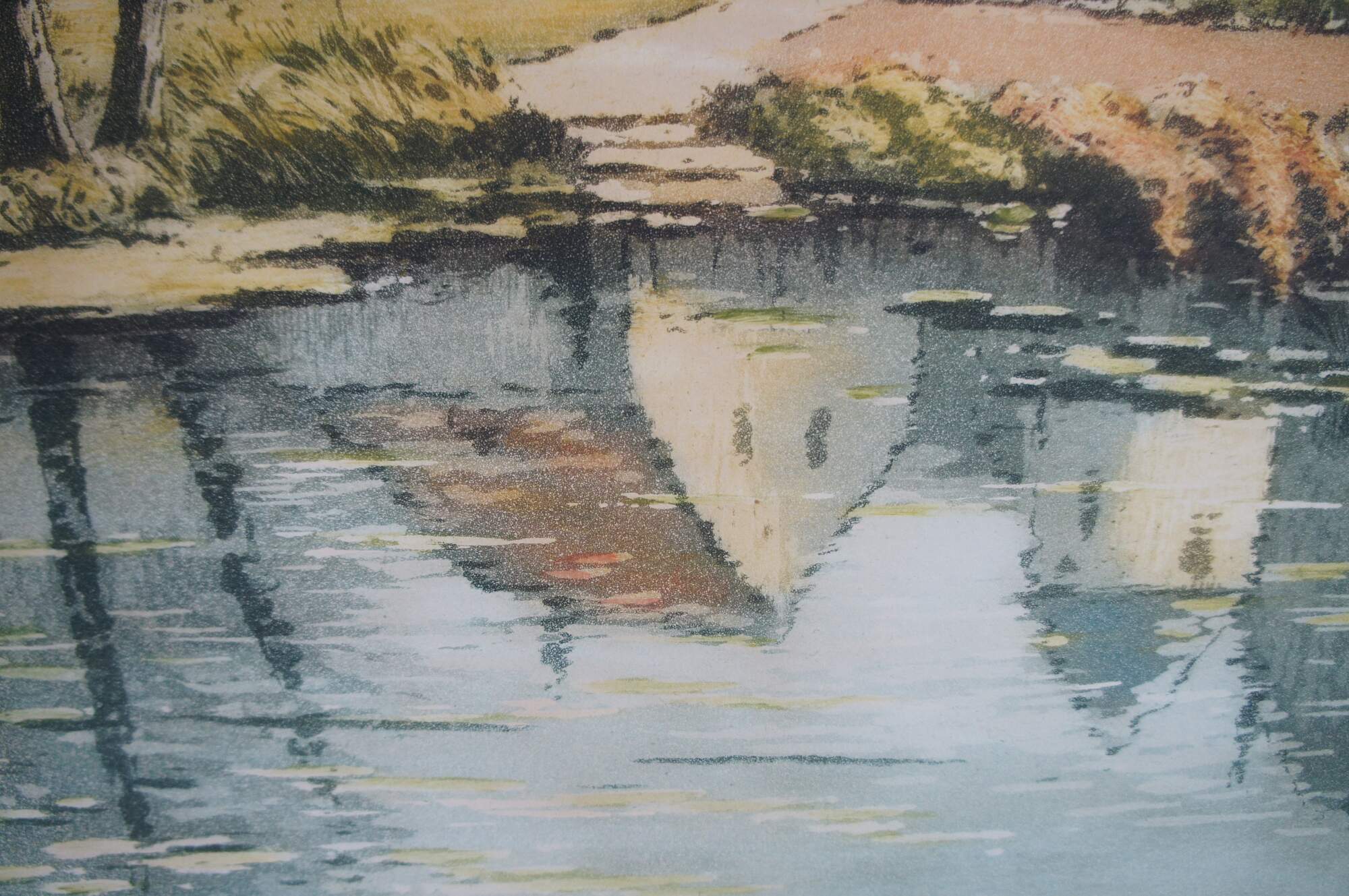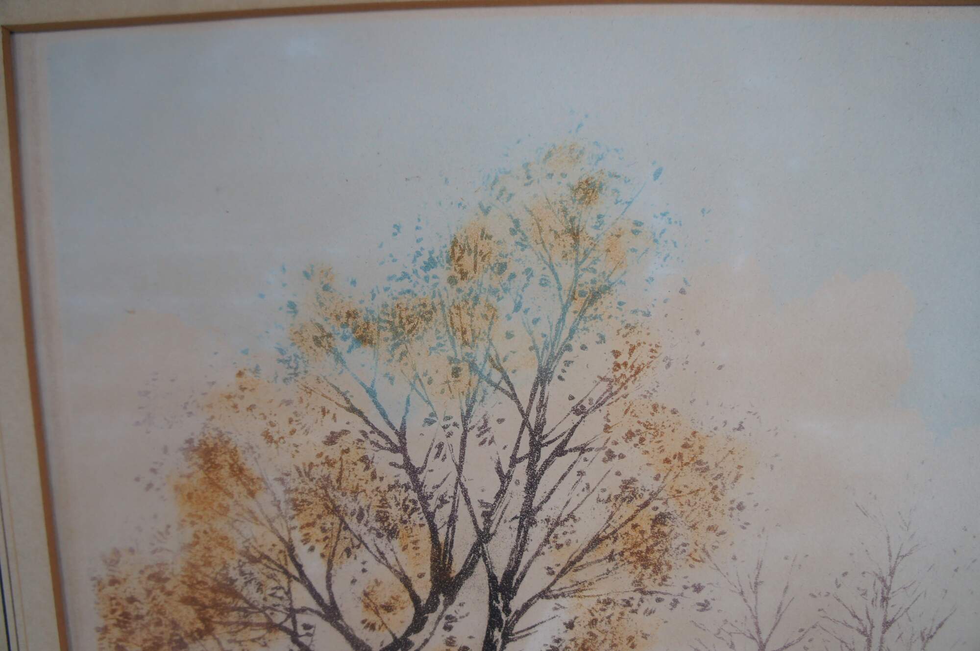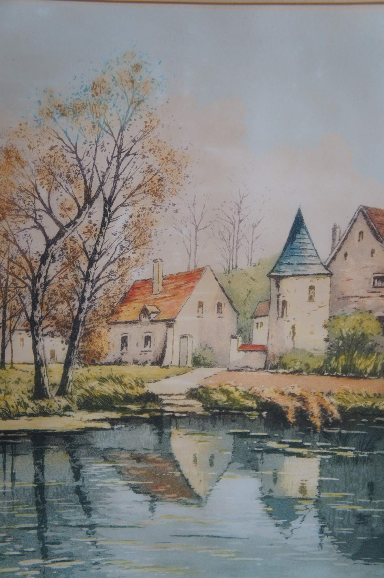 Hand Signed German Etching. Features a European fall landscape showing famrhouse besies a river or lake. Signed in pencil lower right