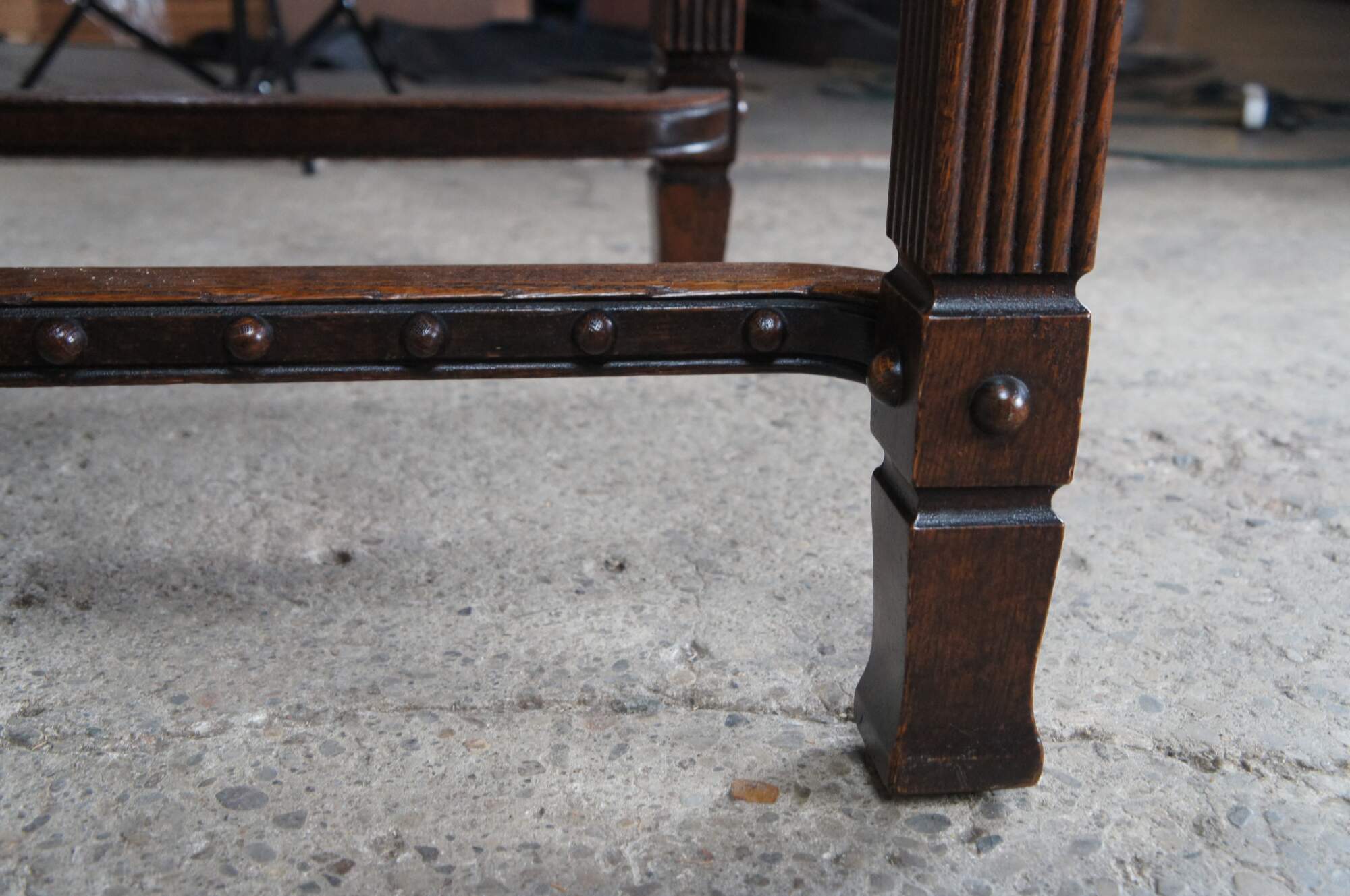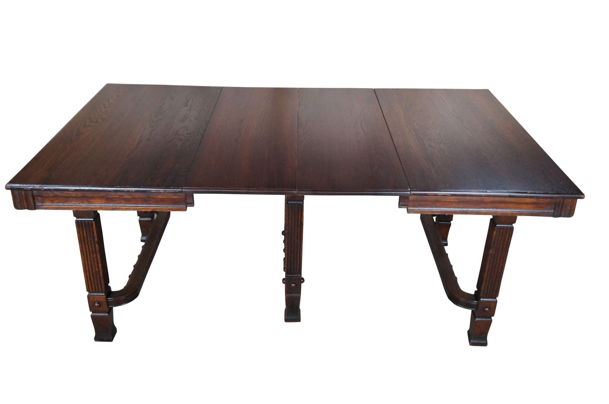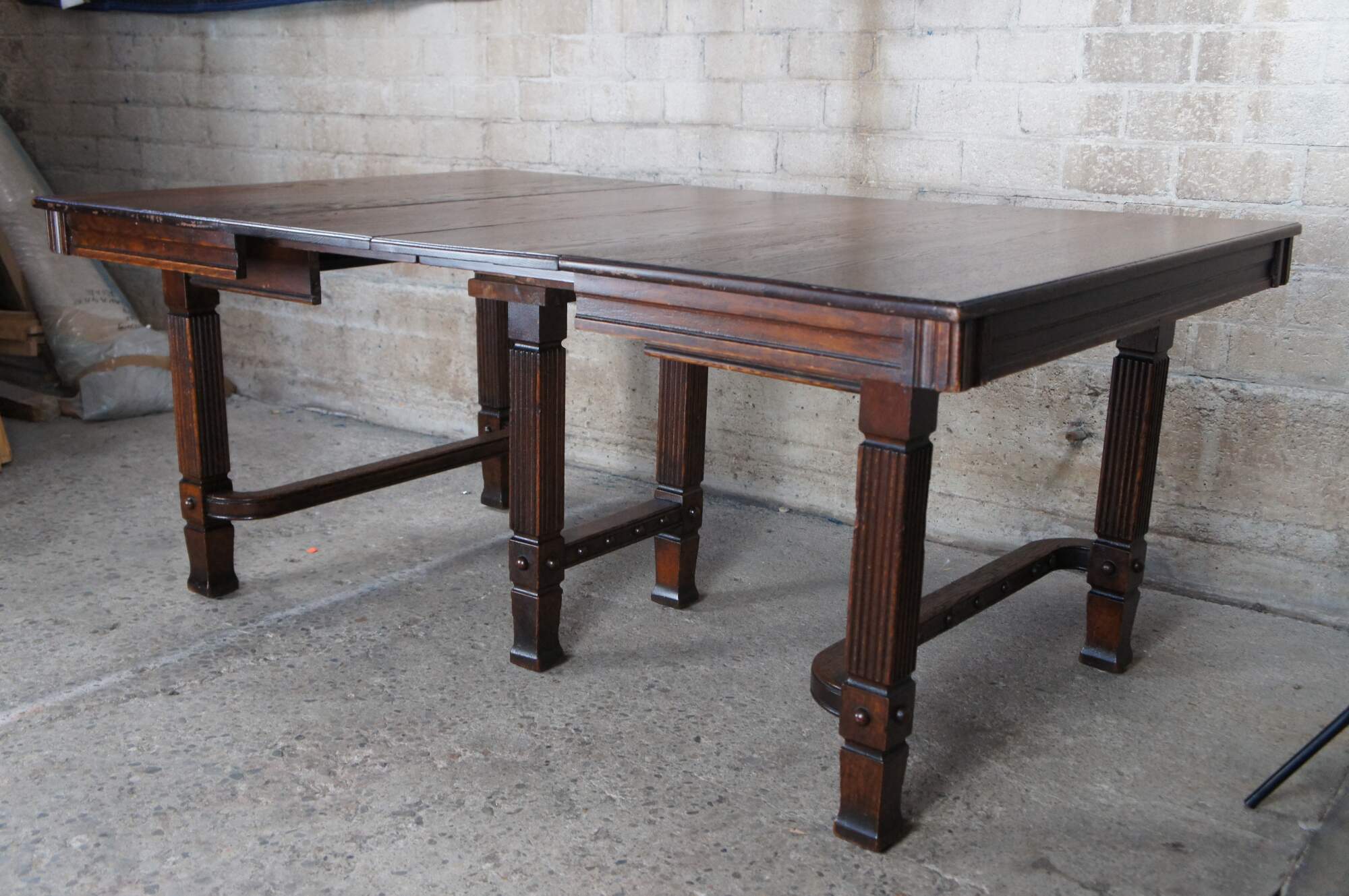 Late Victorian extendable Oak Dining / Breakfast table. Features oak construction with thick square fluted legs connected by contoured stretchers with convex orbs. The table extends with two leaves and has a central pedestal leg that can be removed when not in use.
