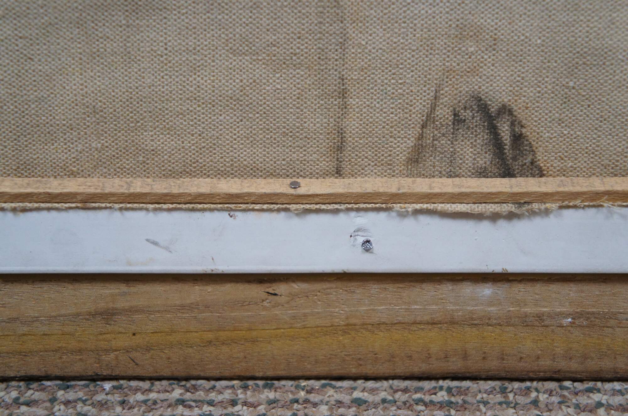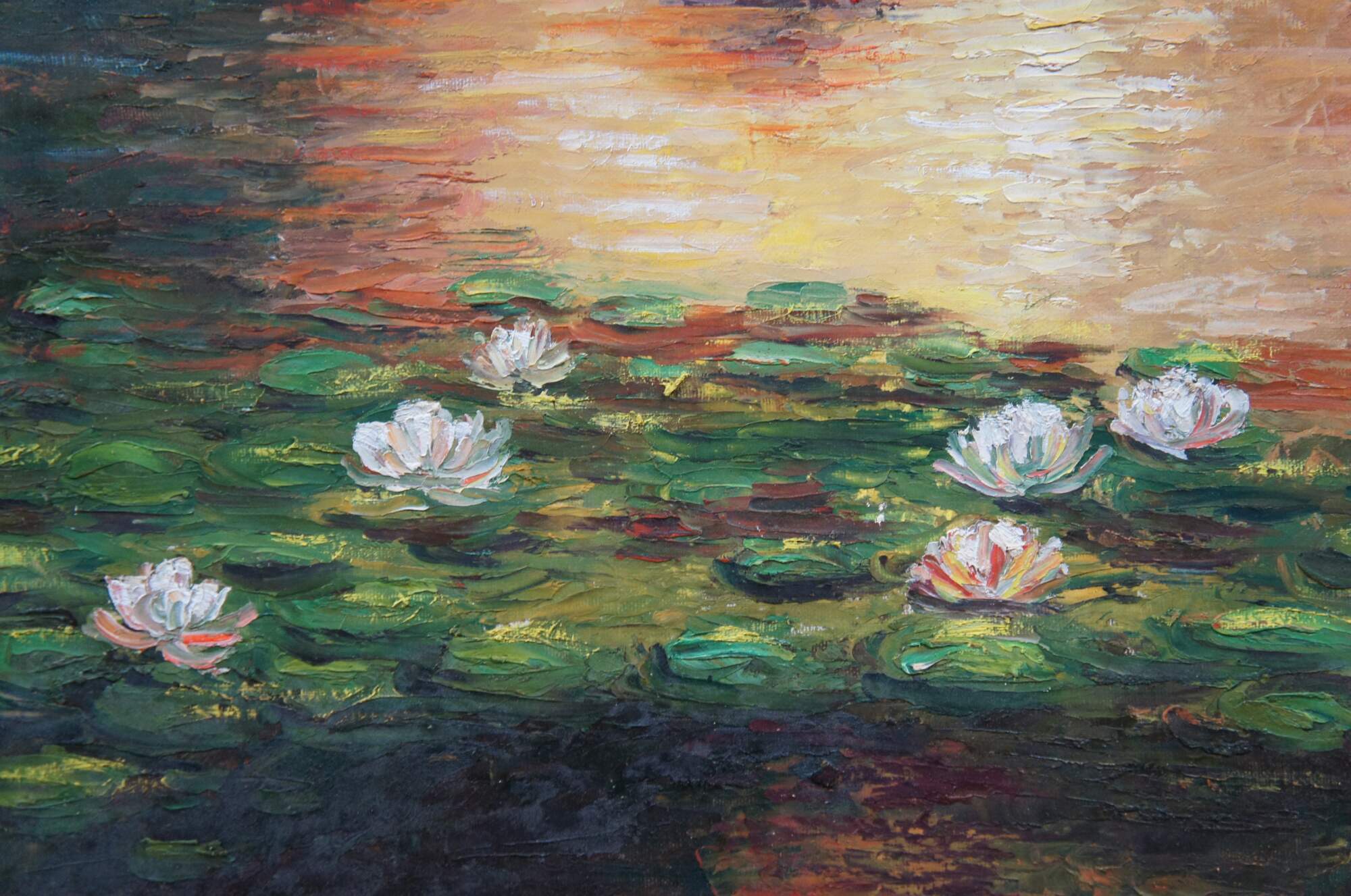 Vintage 20th century oil painting on canvas of a pond lit by an orange sunset full of pink and white water lilies / green lily pads. Beveled gold frame with foliate corners and white linen inner border.