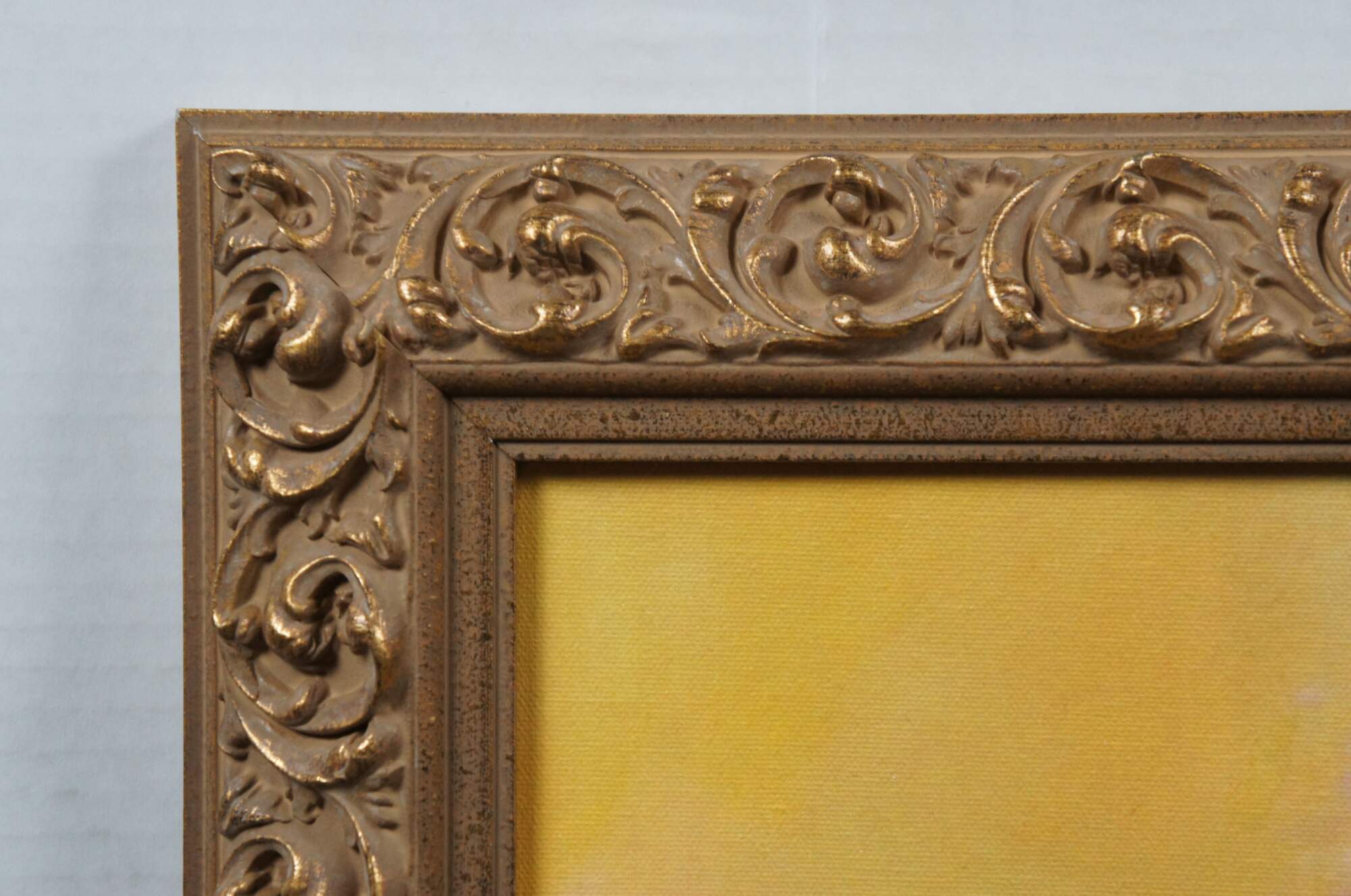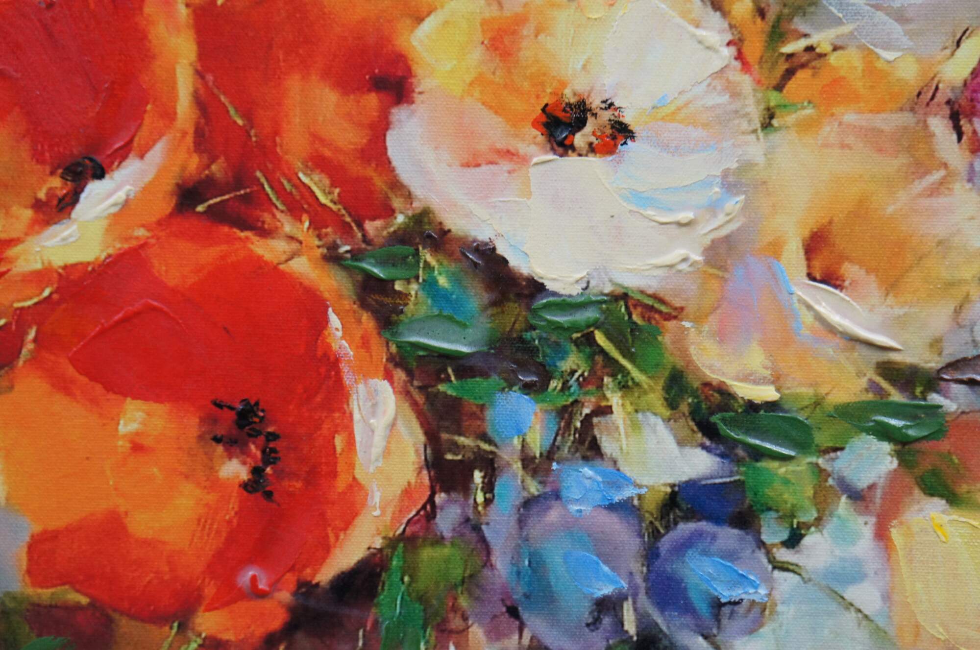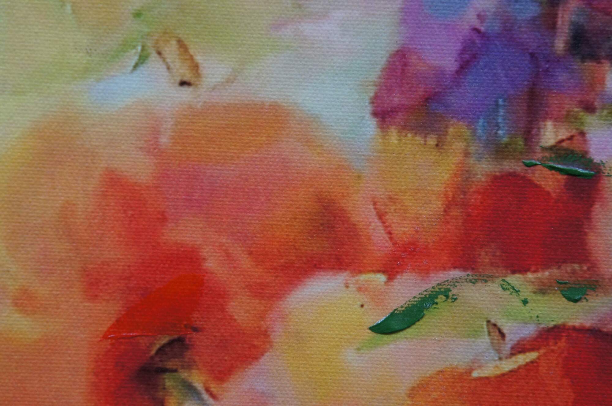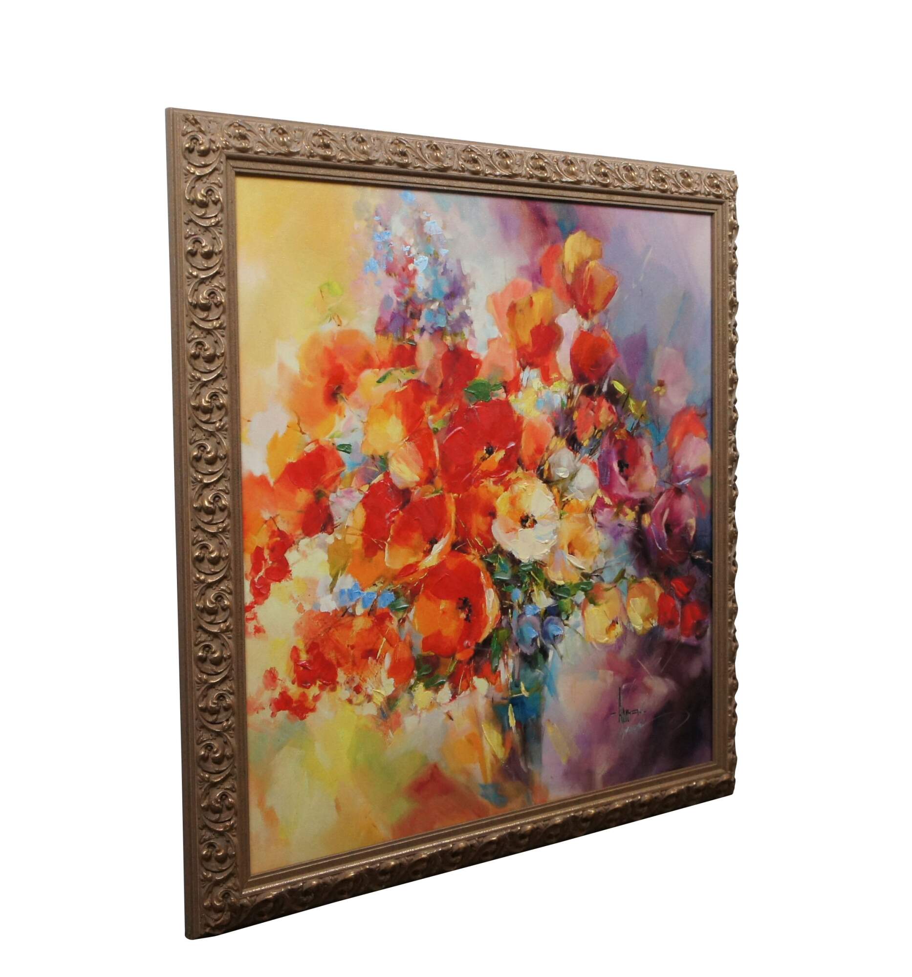 Limited edition hand embellished giclee print on canvas of "Bright Moment 2" by Anna Razumovskaya - depicts a bouquet of poppies and other flowers in a vanishing vase on a mottled yellow and purple background. Signed in lower right corner. Foliate carved gilt wood frame.