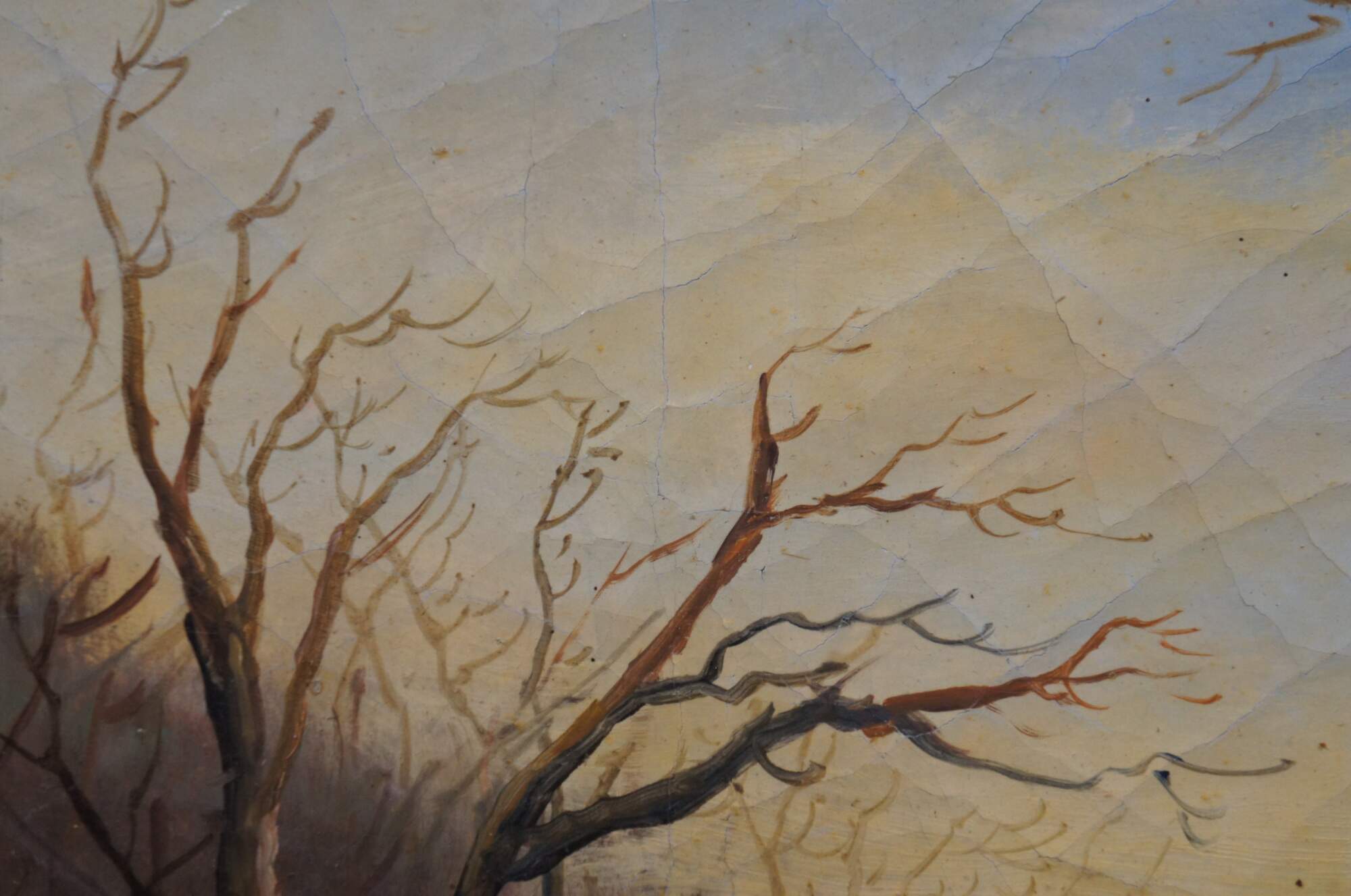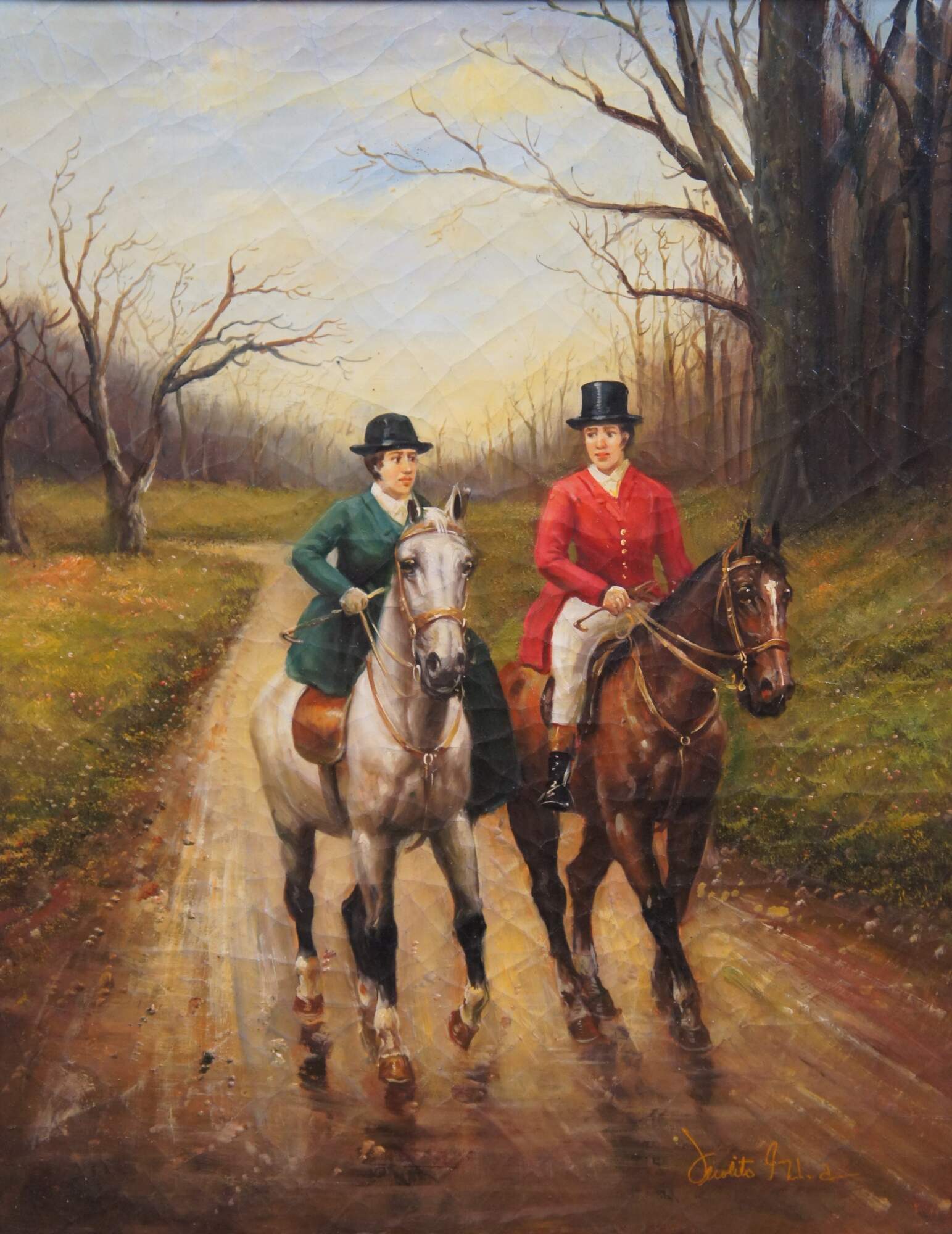 Vintage 20th century landscape oil painting on linen after "Homewards" by John Sanderson-Wells, depicting a pair of figures in English riding habits, riding their horses down an autumn road. Scalloped and foliate gold frame.