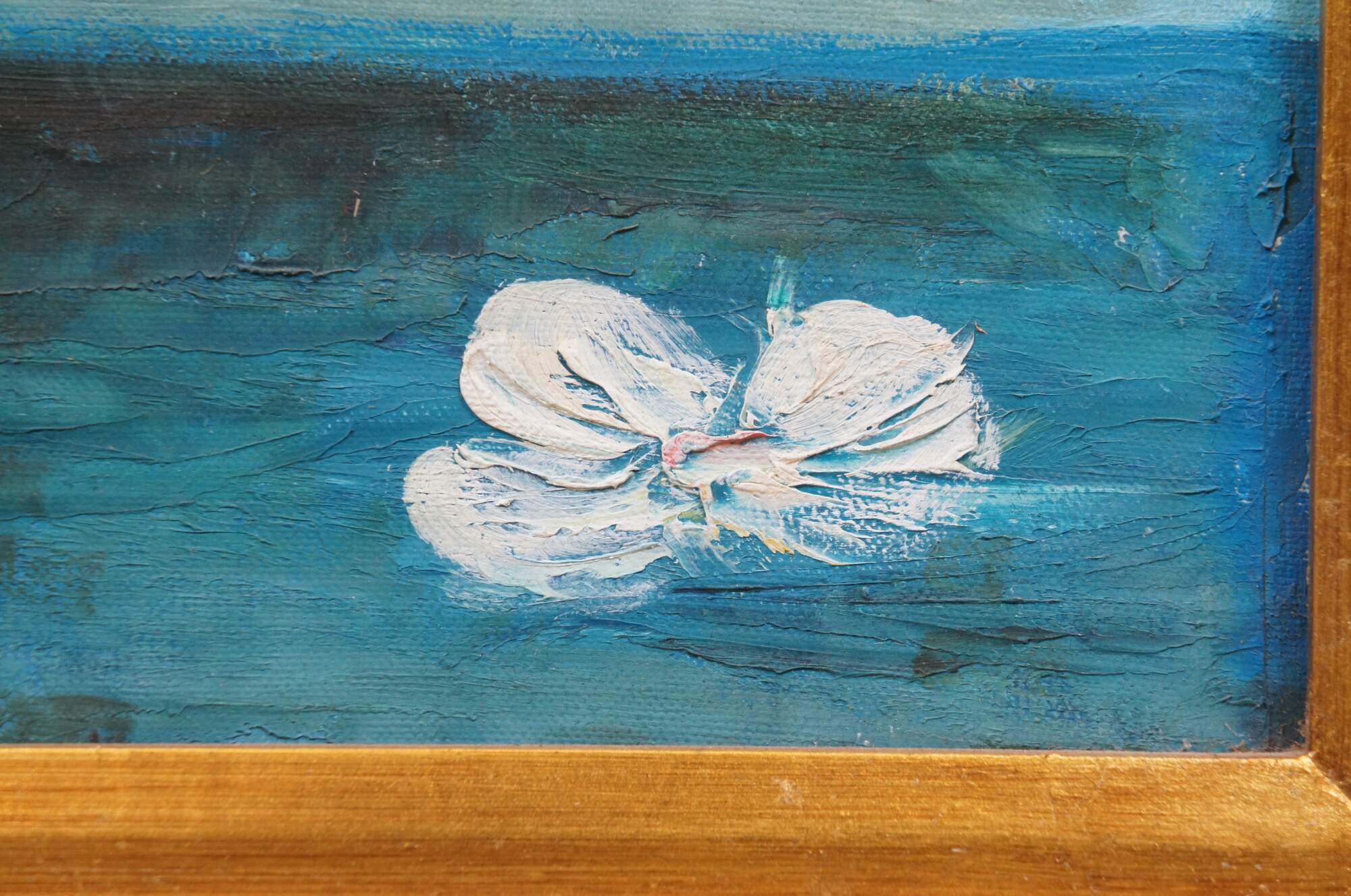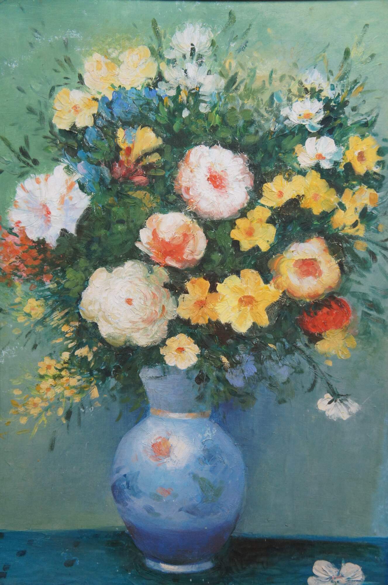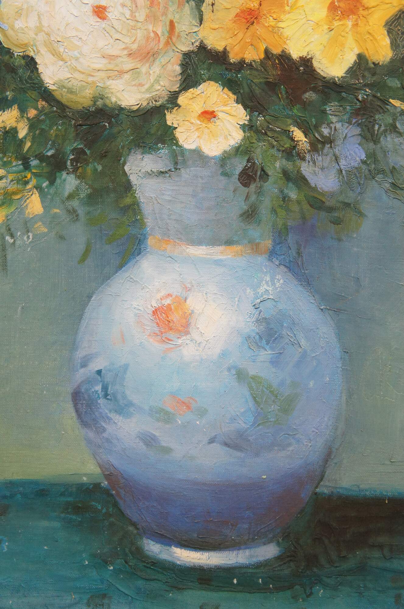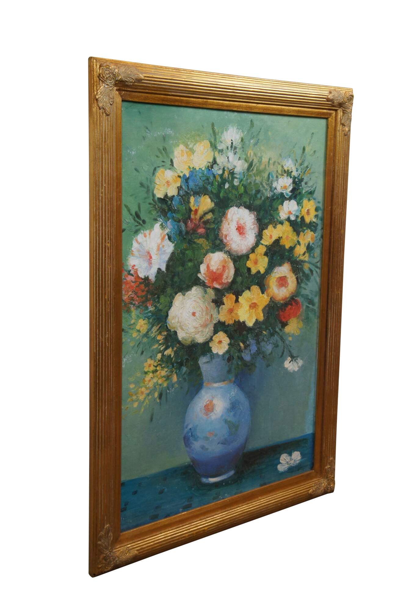 Vintage 20th century still life oil painting on canvas depicting a bouquet of flowers in a blue painted vase with a blue and green background. Greeove gold frame with carved rose corners.