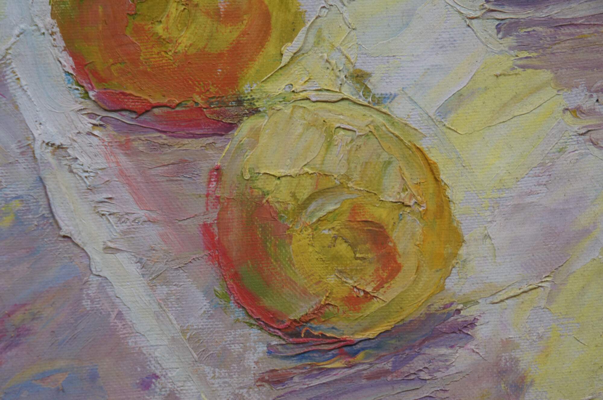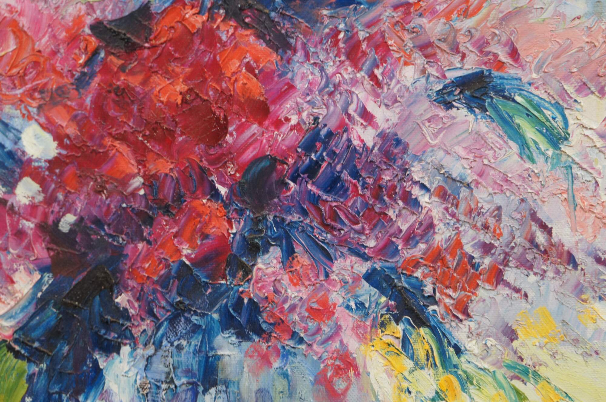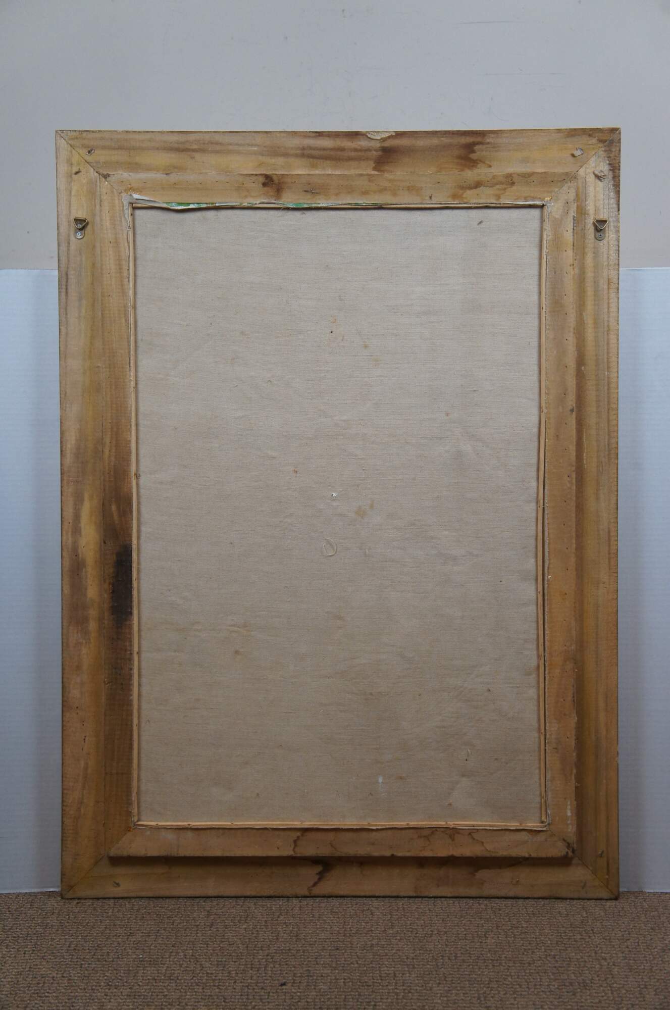 Large vintage 20th century still life oil painting on canvas depicting a vase of pink and purple lilacs, sitting on a cloth covered table next to several oranges / peaches and two frame photos, in the slanting sunlight of a nearby bay window with a waterway and green trees beyond. Gilt and black lacquer frame with carved foliate corners.