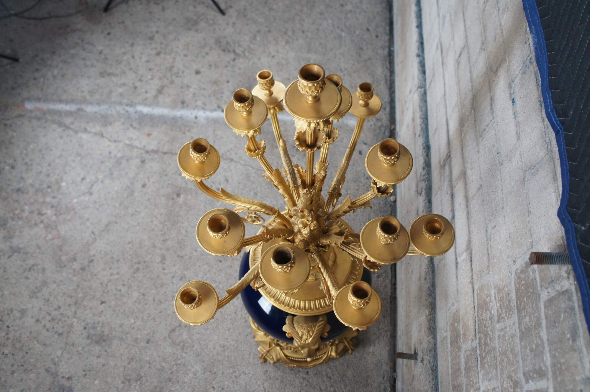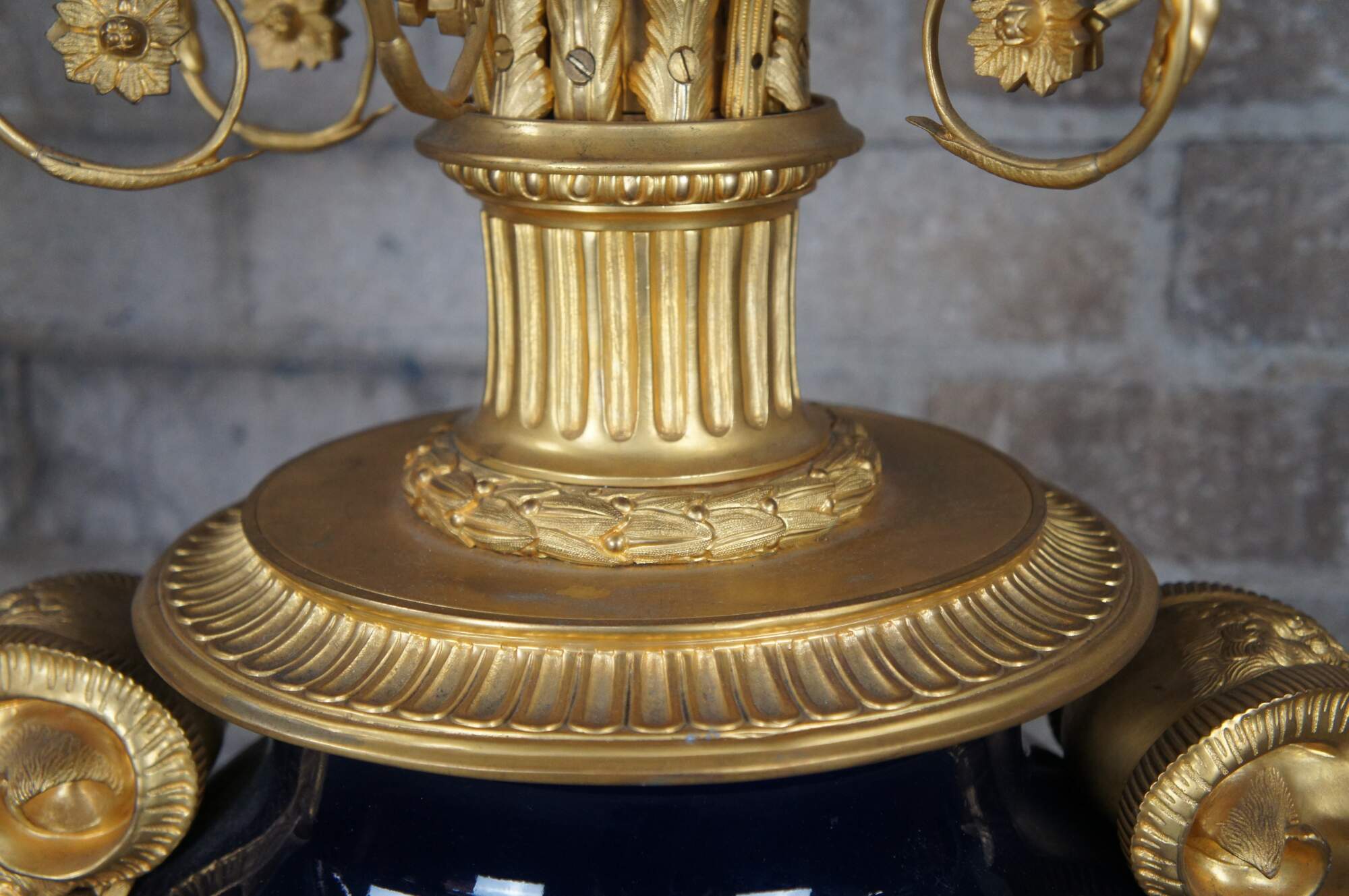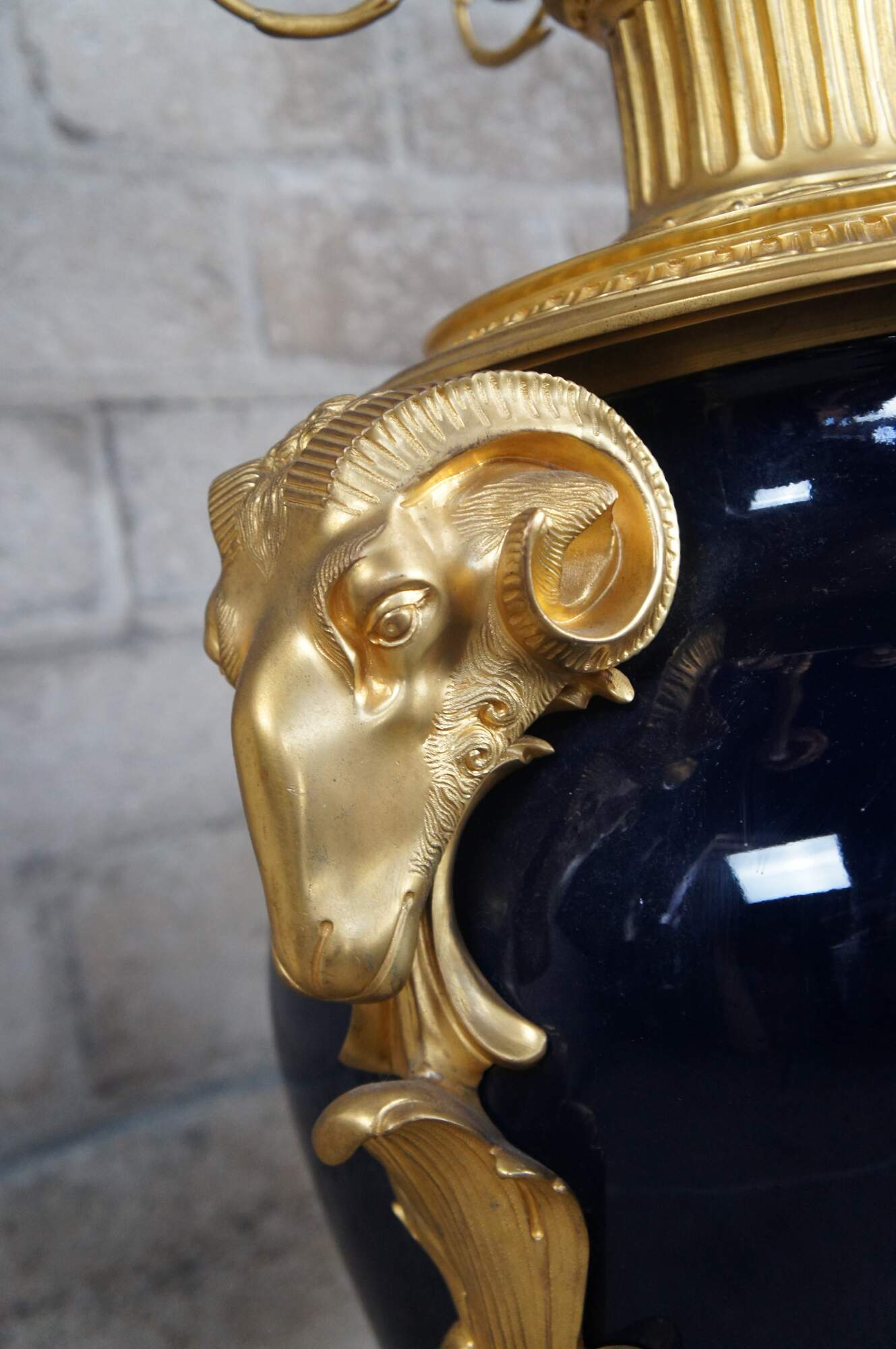 An elaborate monumental French Louis XVI / Napoleon III Sevres Style palace vase and candelabra by Eric Stepniewski. Features a cobalt blue porcelain urn wrapped in low relief chiseled 24k gold brass foliate with figural rams mounted at the center. The top of the vase showcases a beautifully branched candelabra. A stately addition to any space.