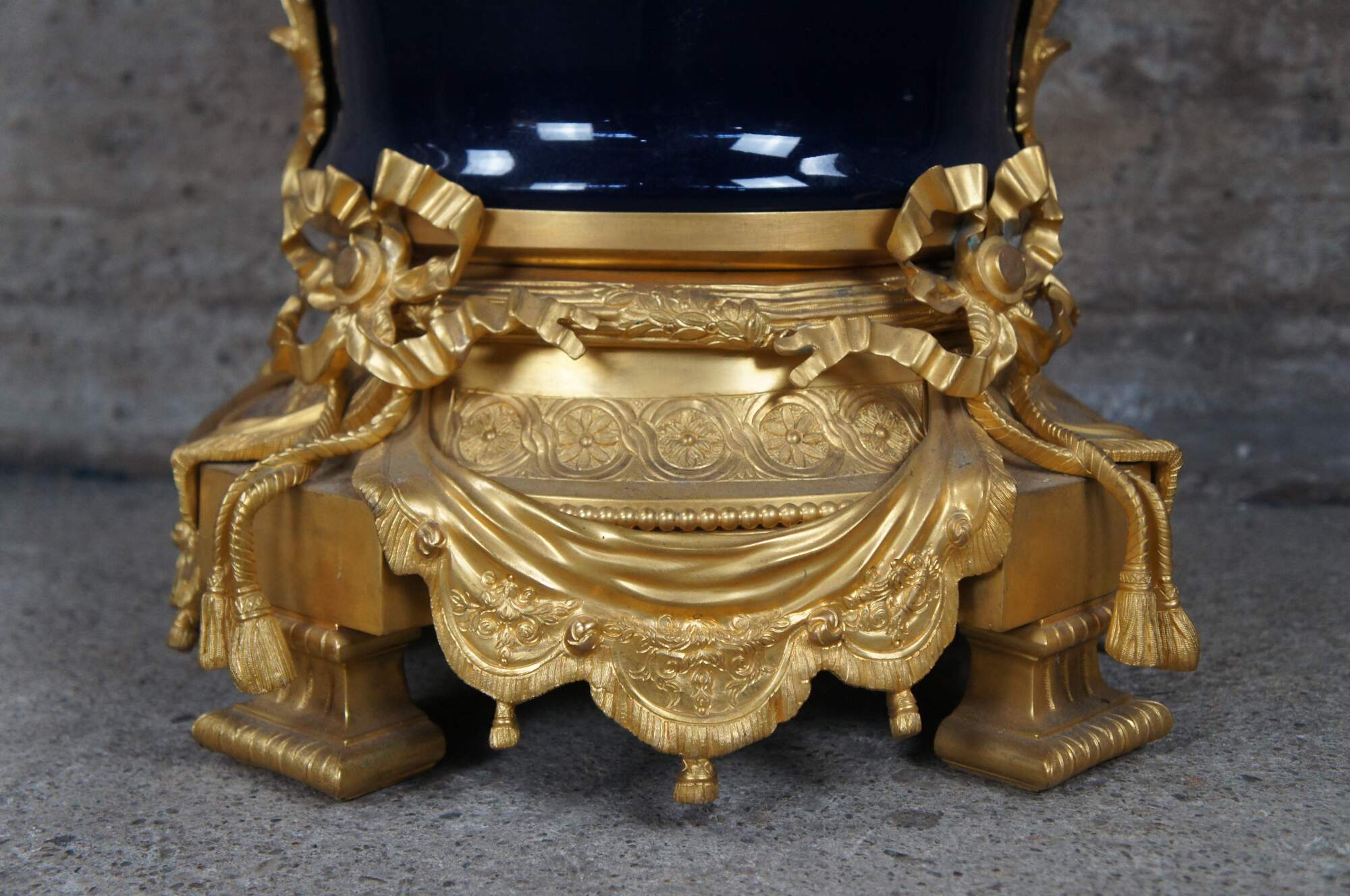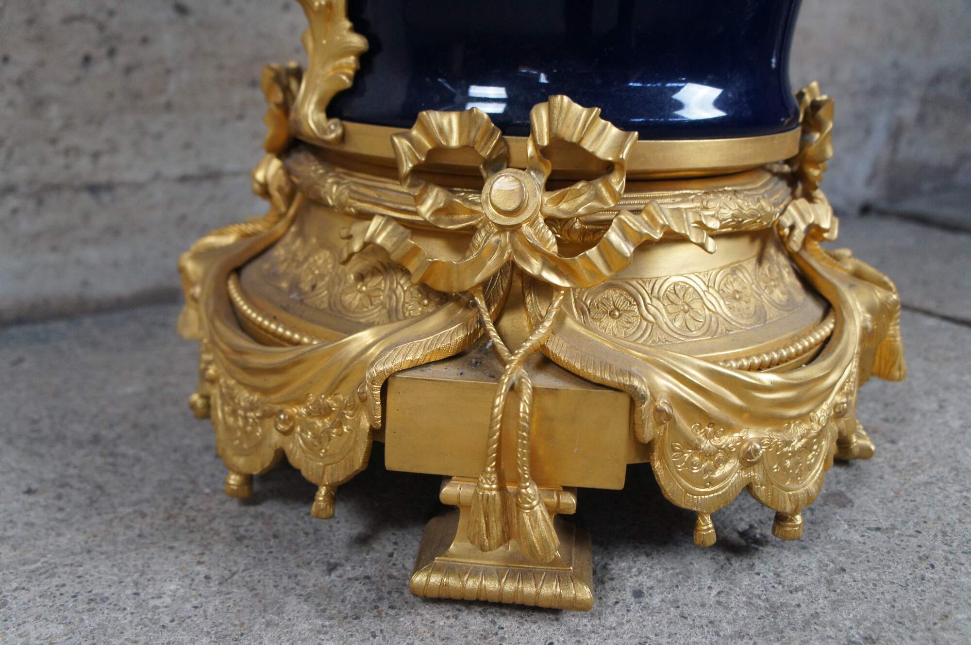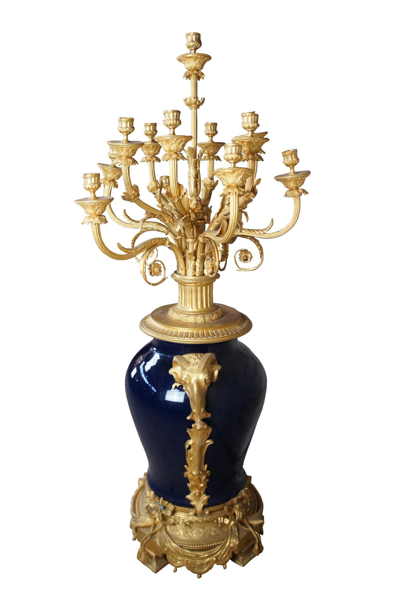 An elaborate monumental French Louis XVI / Napoleon III Sevres Style palace vase and candelabra by Eric Stepniewski. Features a cobalt blue porcelain urn wrapped in low relief chiseled 24k gold brass foliate with figural rams mounted at the center. The top of the vase showcases a beautifully branched candelabra. A stately addition to any space.