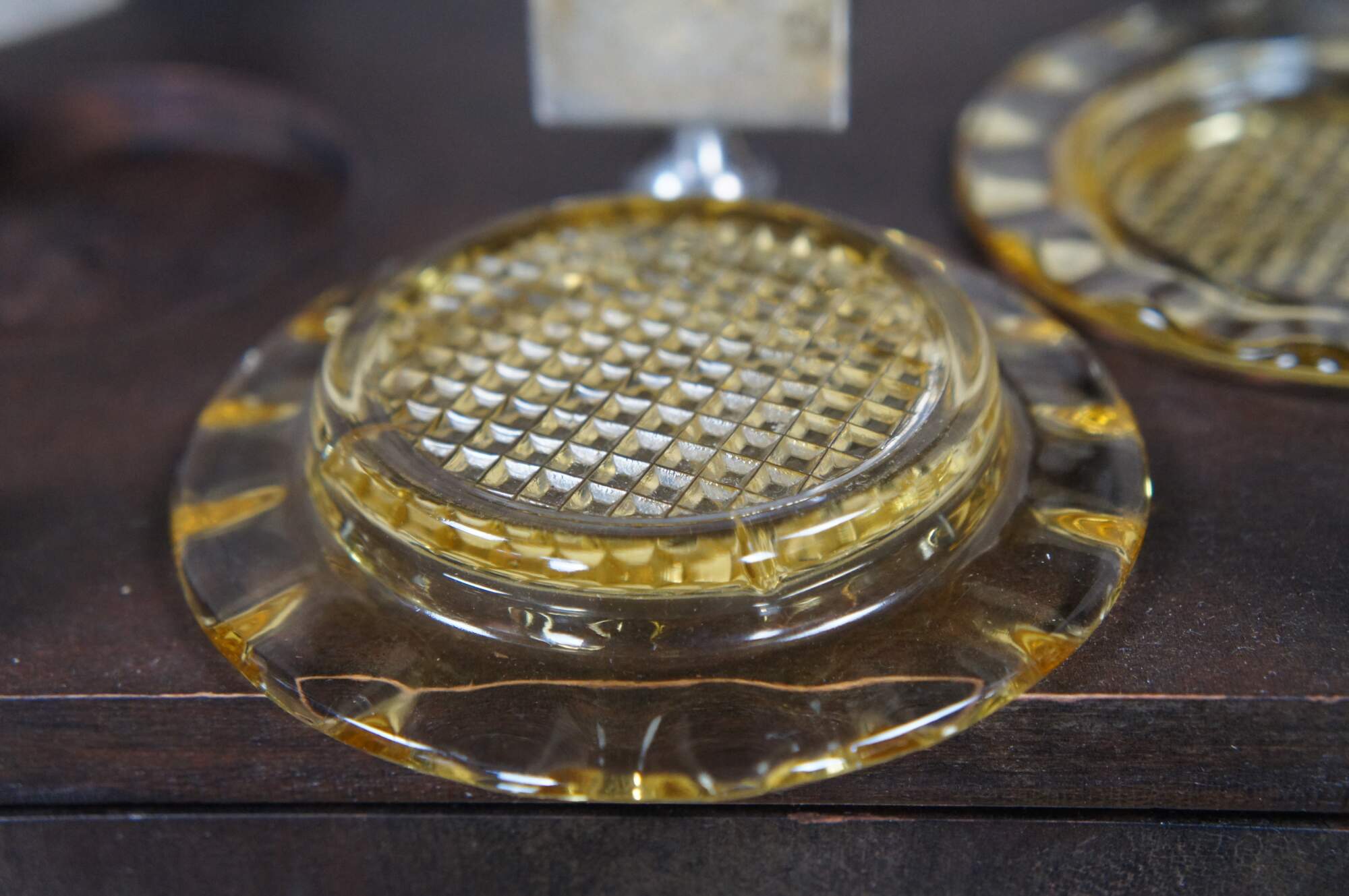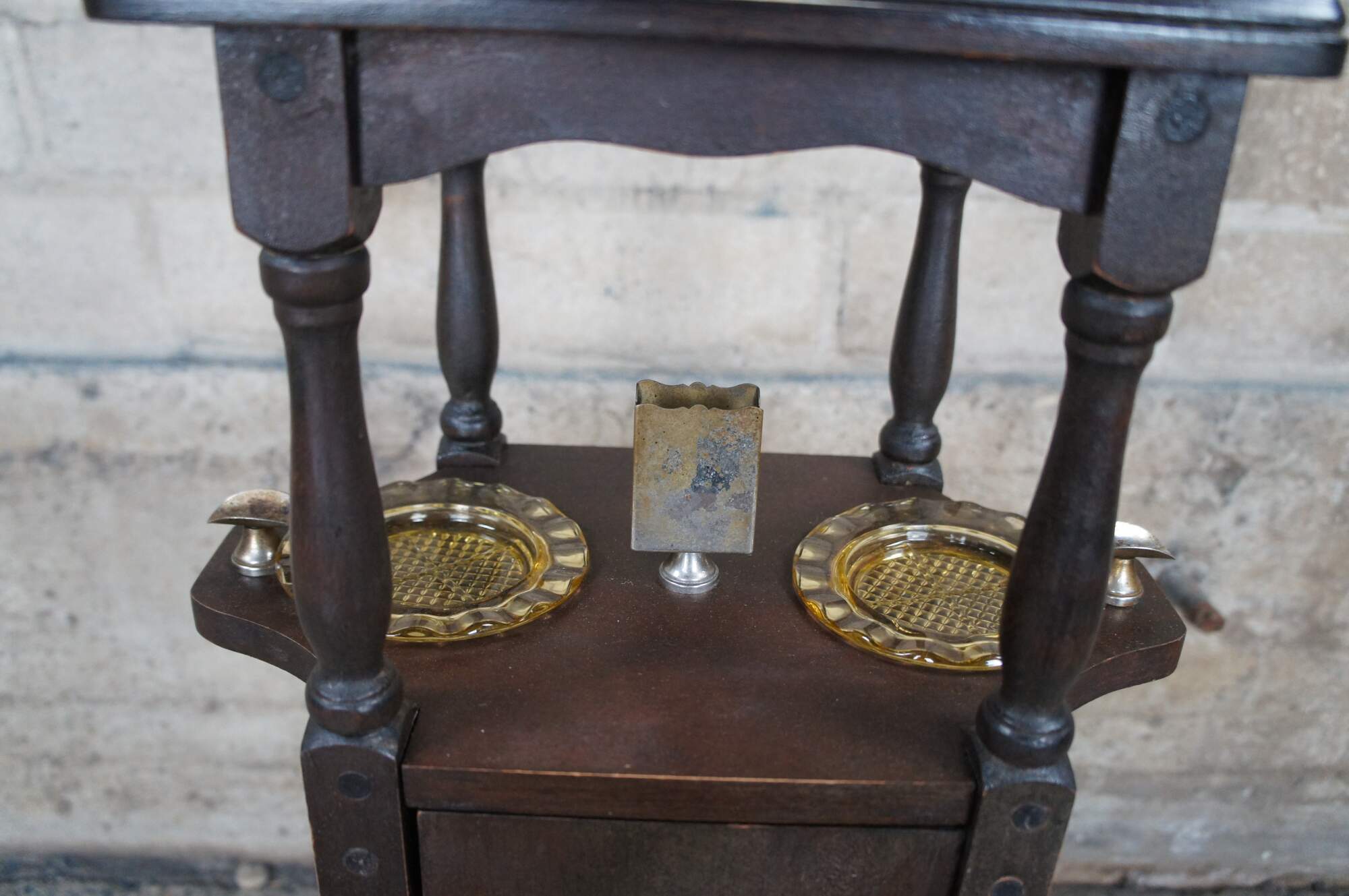 A quaint smoke stand by H.T. Cushman, circa early 20th century. Features wooden construction with turned pots, 2 central glass ashtrays, a strike pad and lower humidor cabinet.