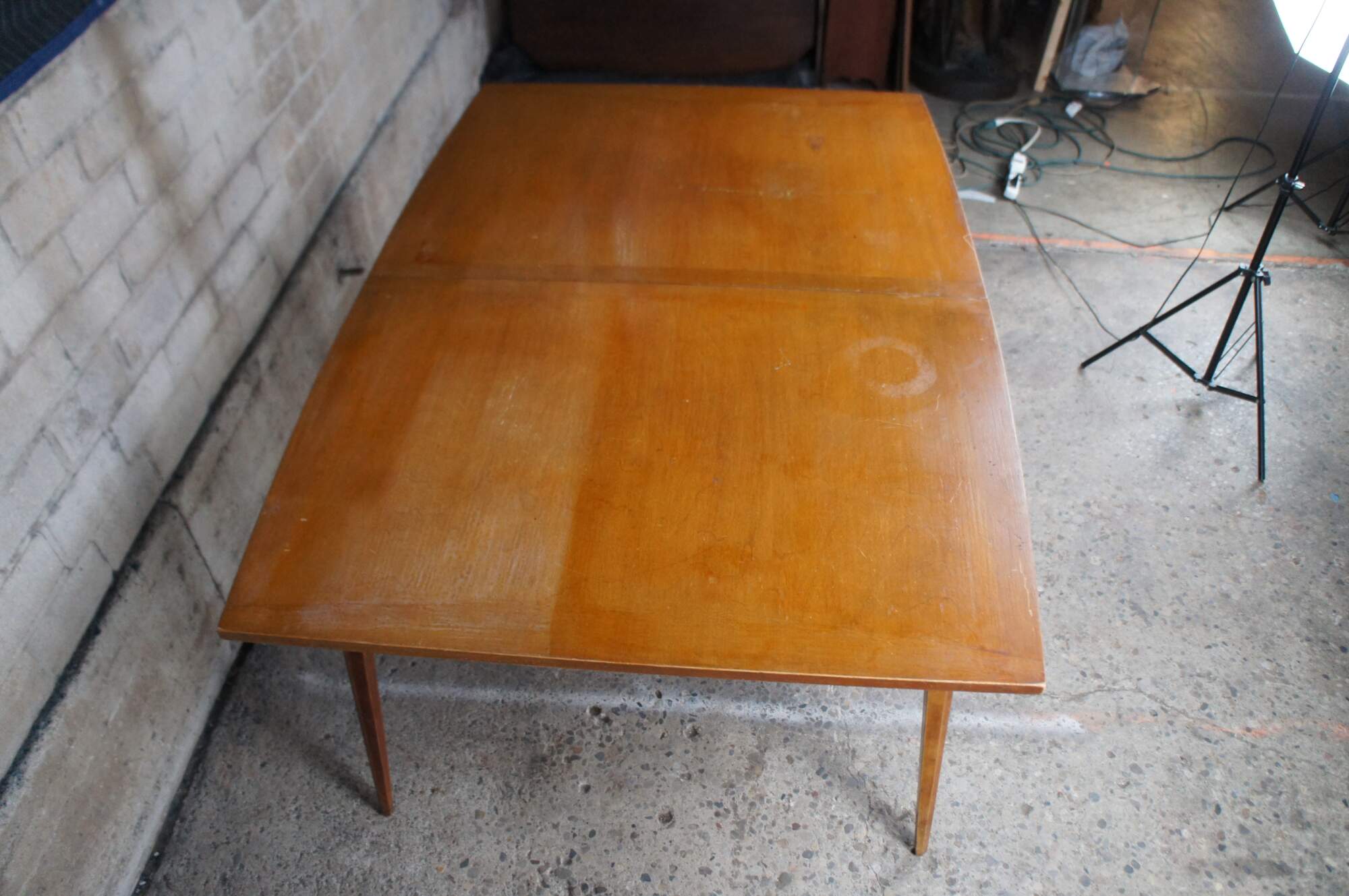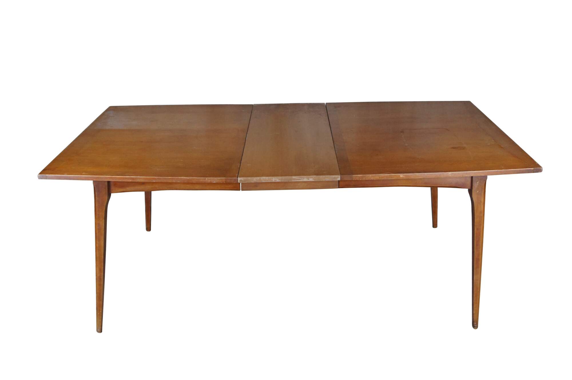 Heywood Wakefield American Maple Dining Table. Features a rectangular form with tapered sides and square tapered legs. Includes two leaves for extension.