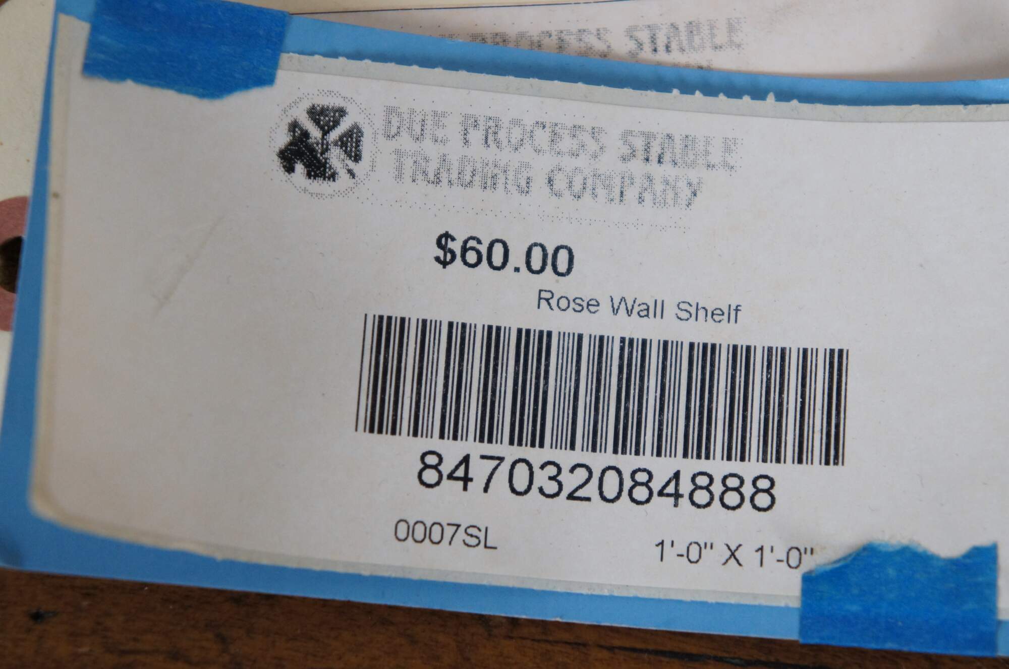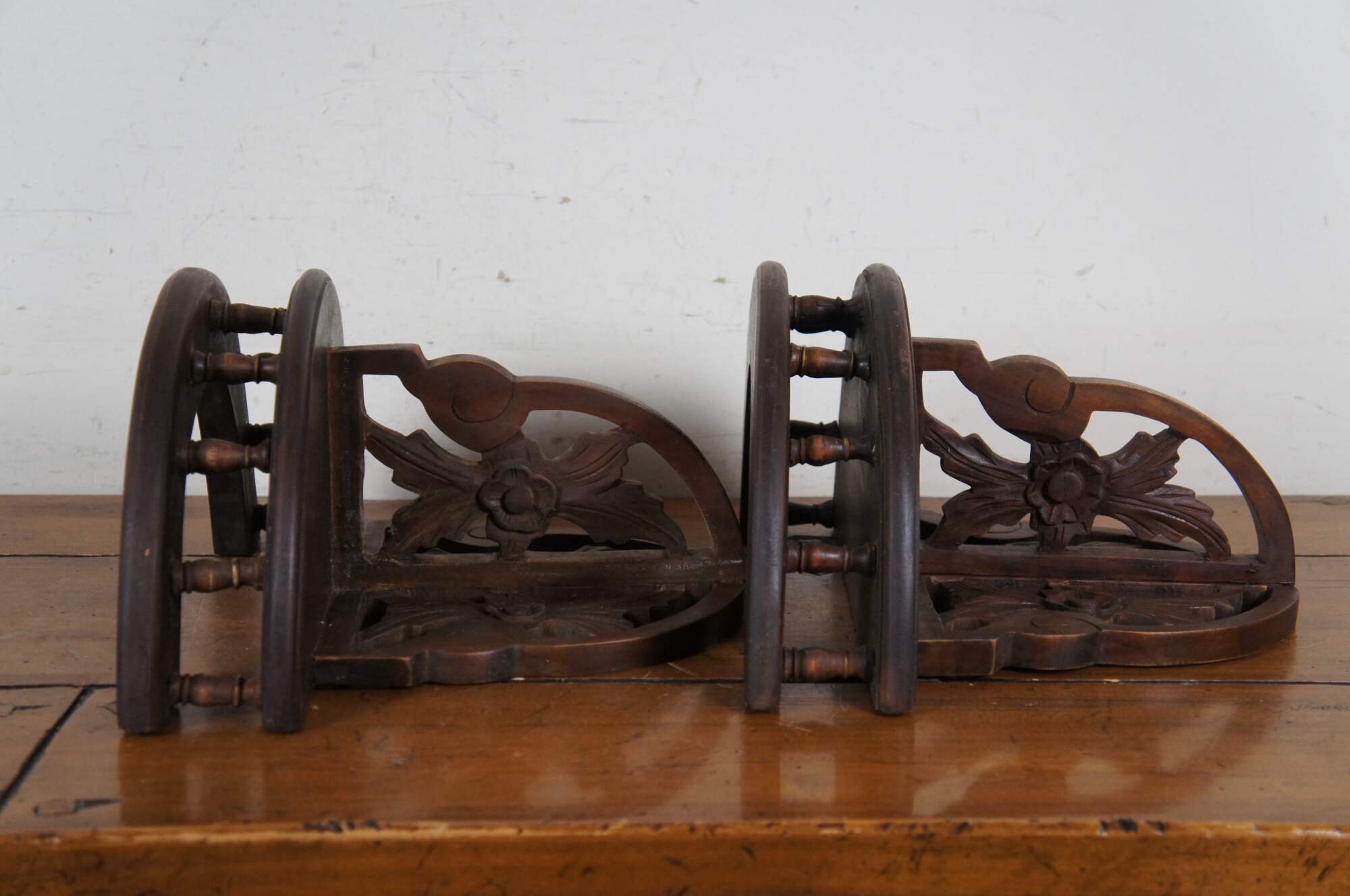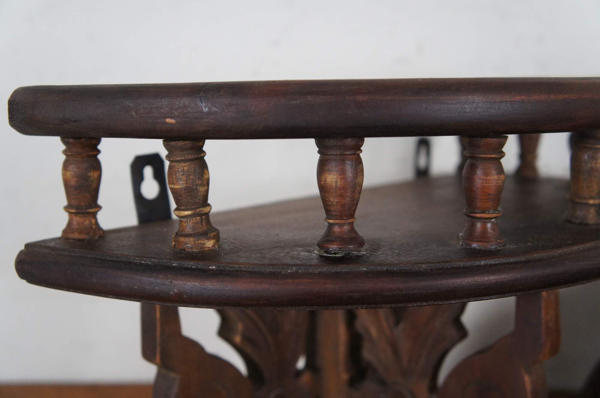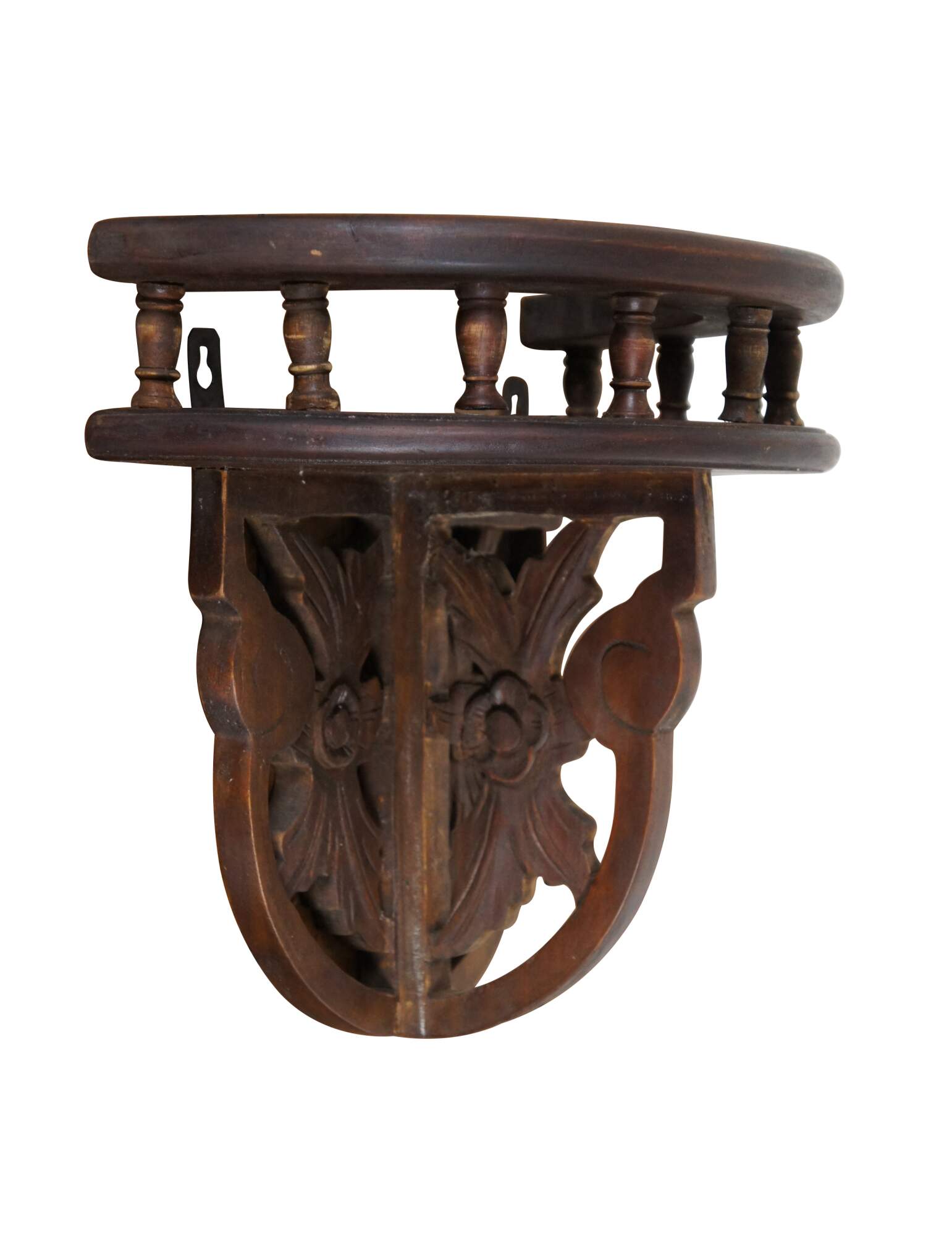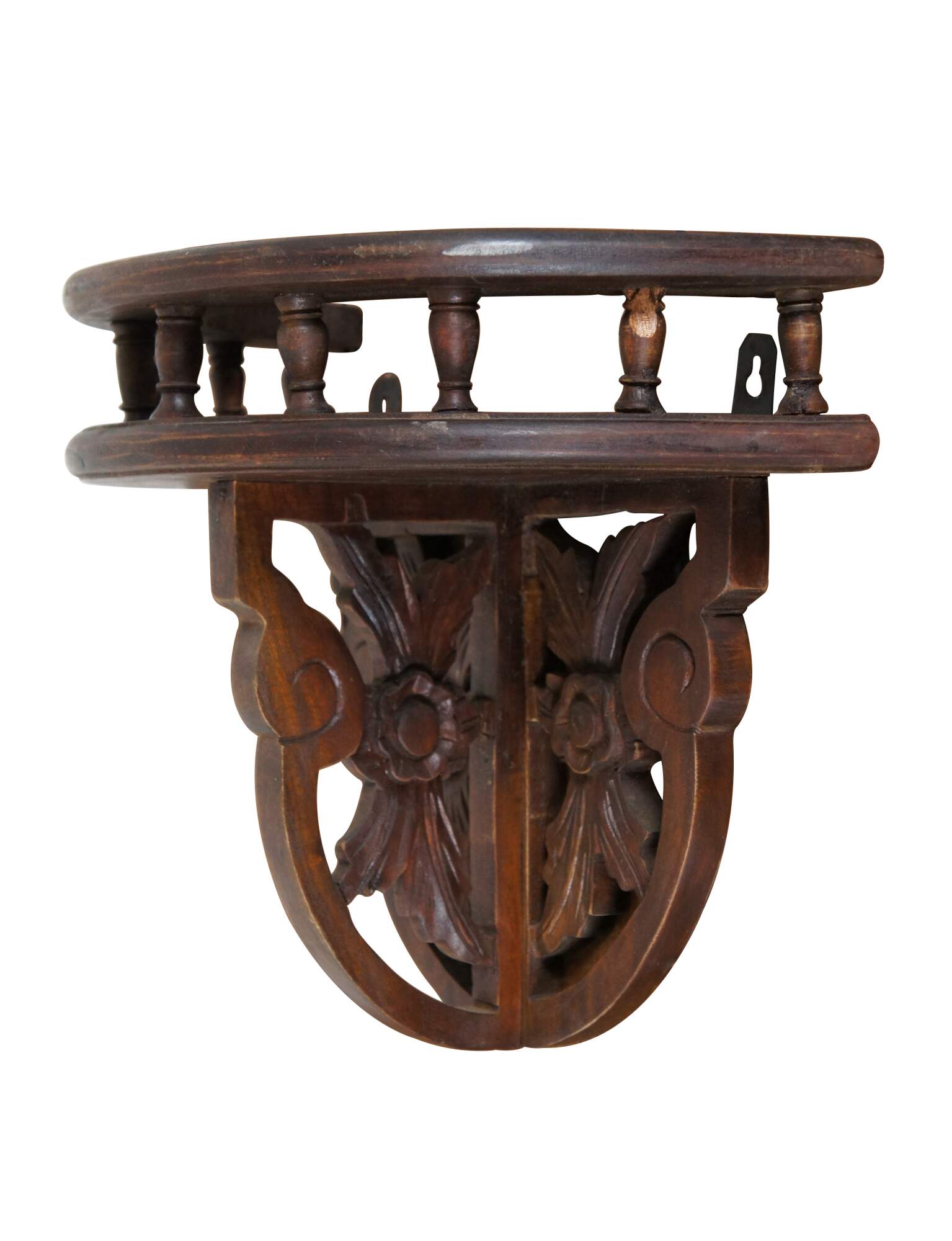 Pair of antique carved mahogany wall shelf brackets / sconces featuring demilune tops with spindle gallery edge supported on a bracket of pierced / carved roses and leaves.