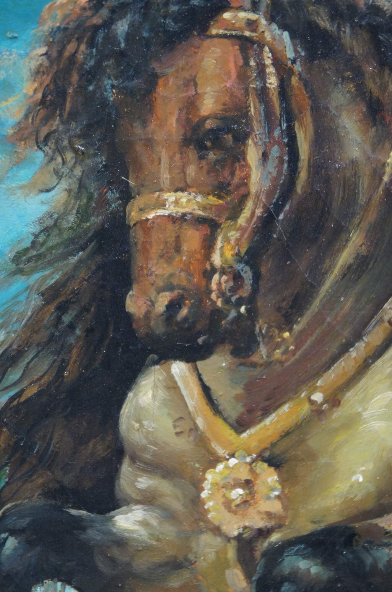 Late 20th century oil painting on linen after the "Equestrian Portrait of Prince Balthasar Charles" or "Infante Baltasar Carlos on Horseback" by Diego Valazquez. Depicts the young Prince of Asturias, Balthasar Charles seated on a round, leaping horse or pony. Molded frame with scalloped corners and betailed bevels with a gold finish.