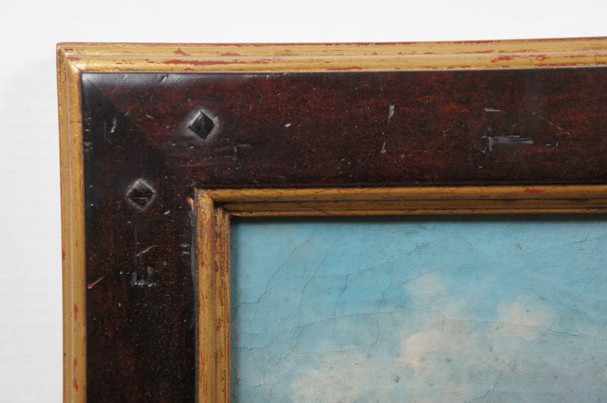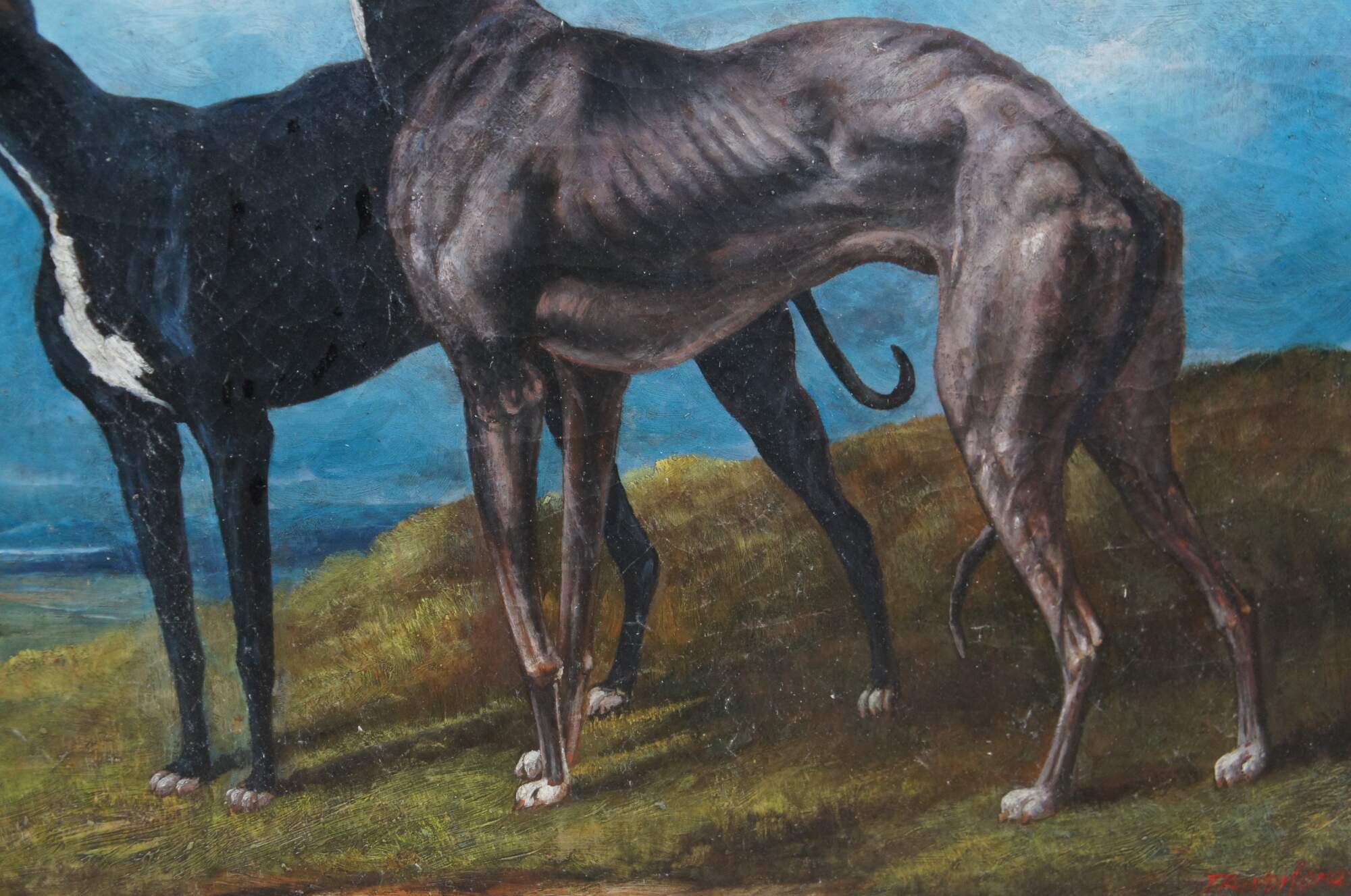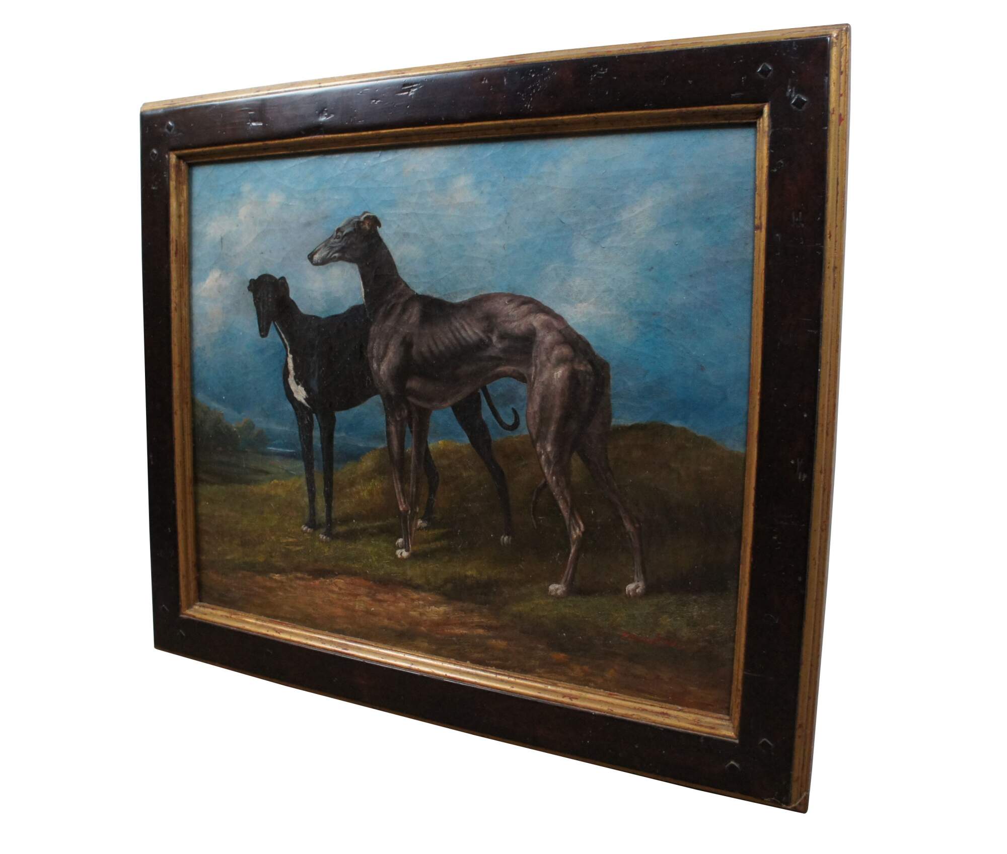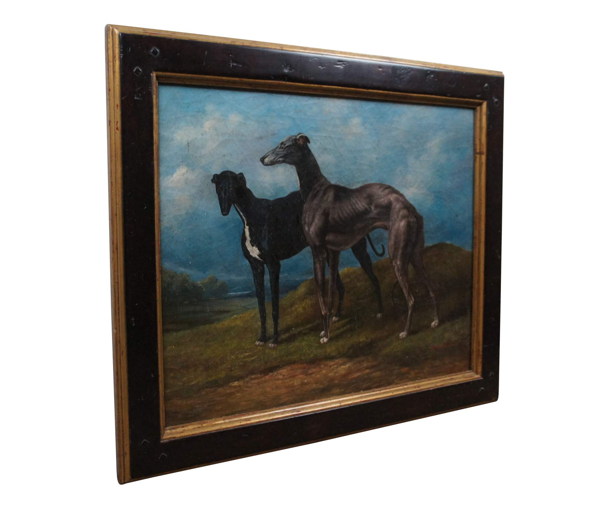 Late 20th century oil painting on canvas after "Greyhounds in a Landscape" by Henri D'Ainecy, Comte de Montpezat. Depicts a pair of greyhounds in a simple hilly landscape. Reproduced by the Trevor James Company. Dark wood frame with gold edges.