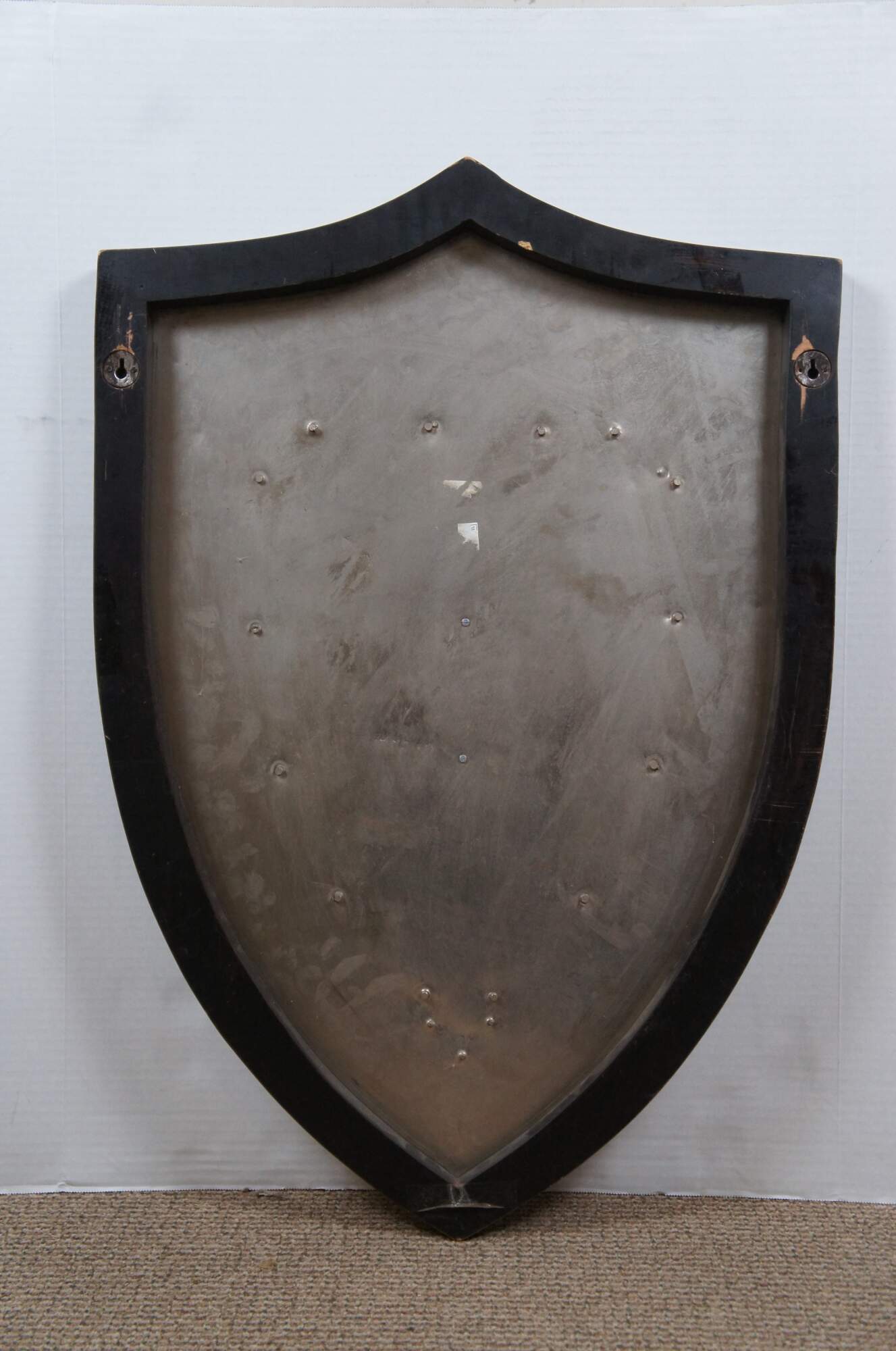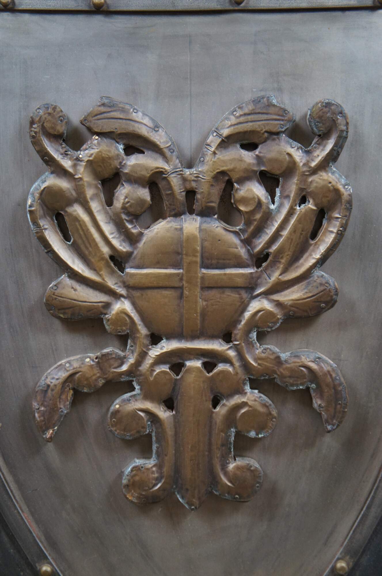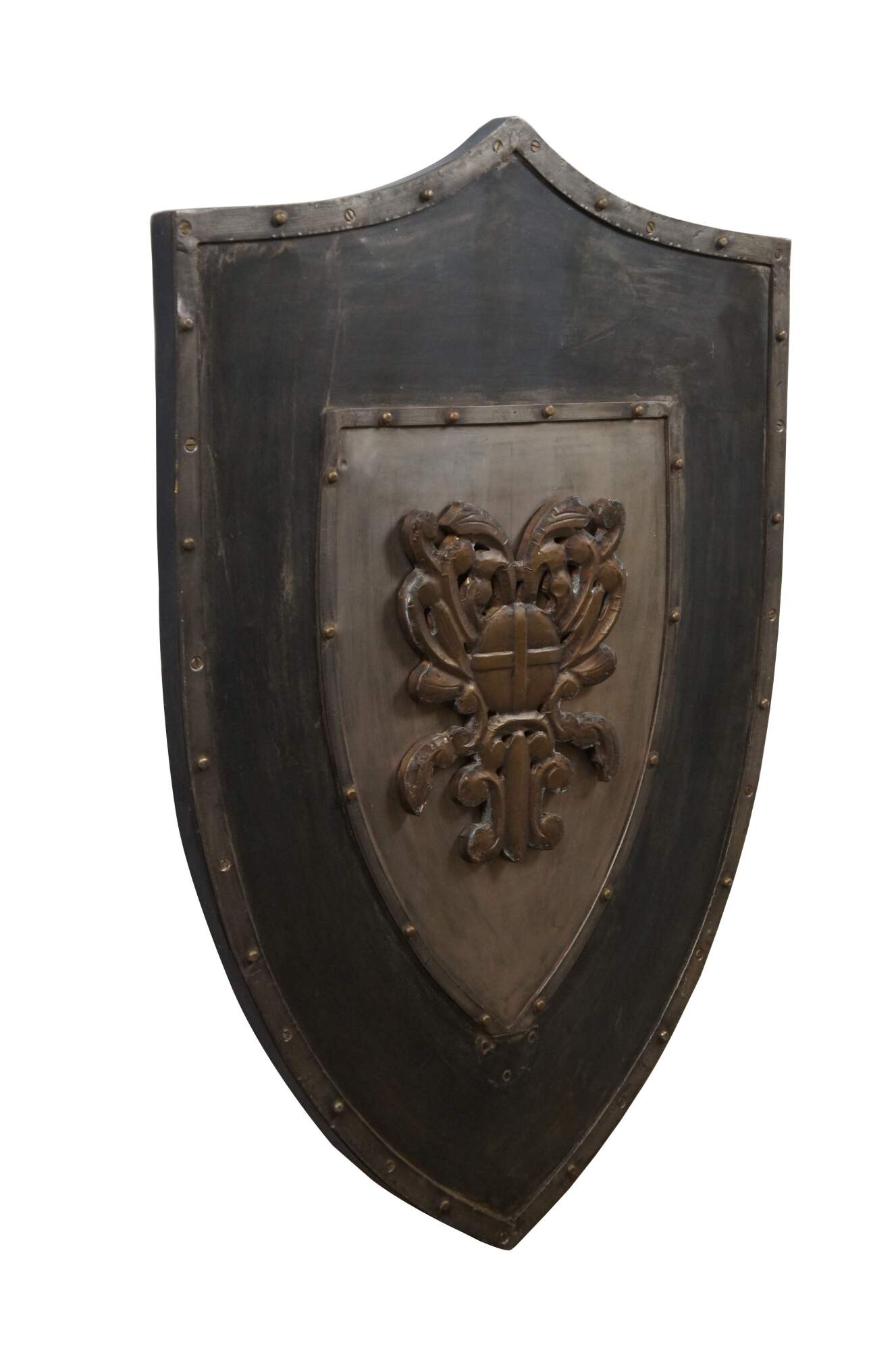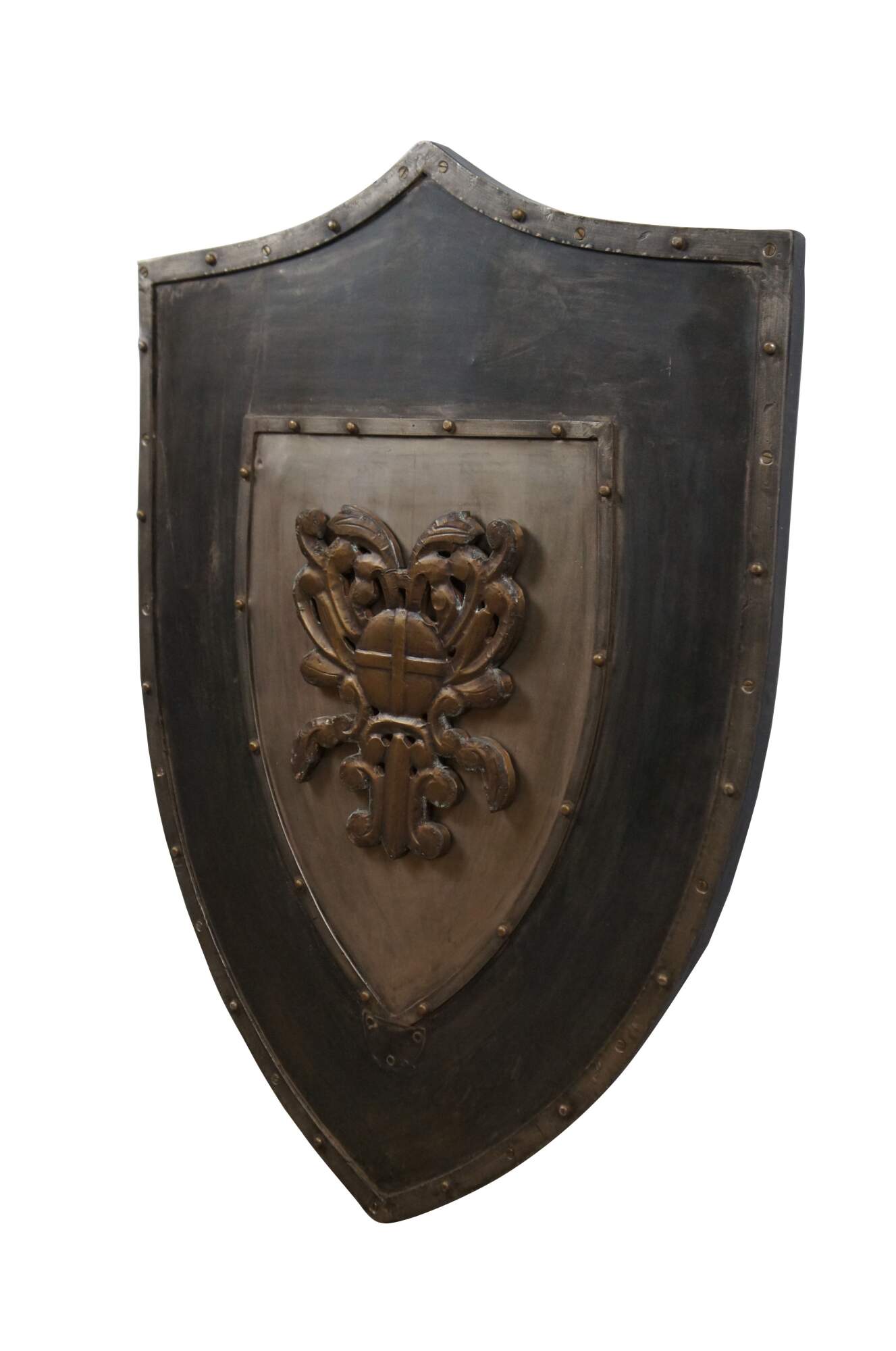 Late 20th century wall hanging shield - traditional shield shape crafted in dark patinaed metal on a wood base, with riveted boders around a central brass colored motif resembling a coat of arms with swirling folaite design around a royal orb. Two recessed hooks for display.