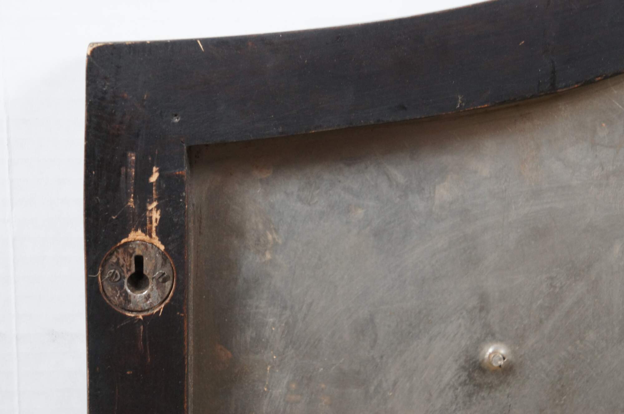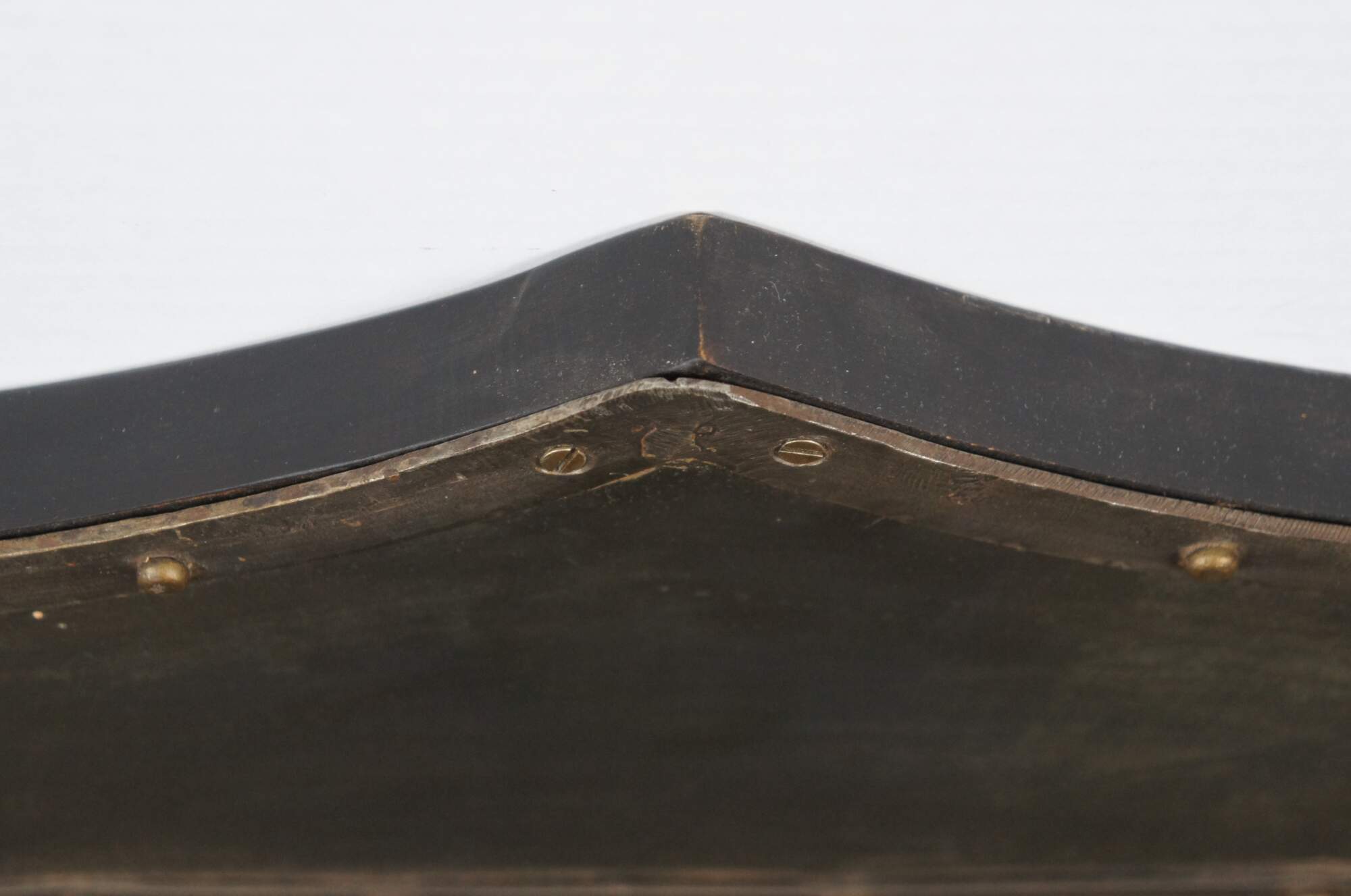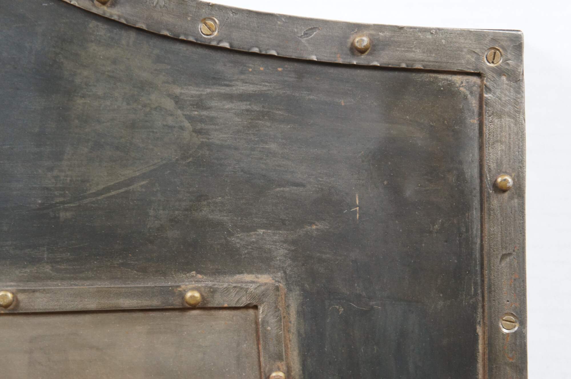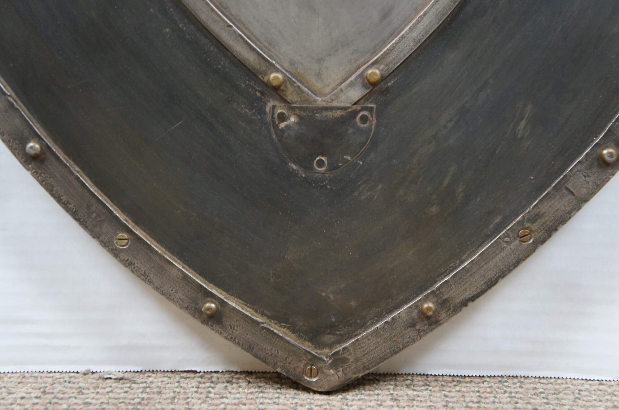 Late 20th century wall hanging shield - traditional shield shape crafted in dark patinaed metal on a wood base, with riveted boders around a central brass colored motif resembling a coat of arms with swirling folaite design around a royal orb. Two recessed hooks for display.