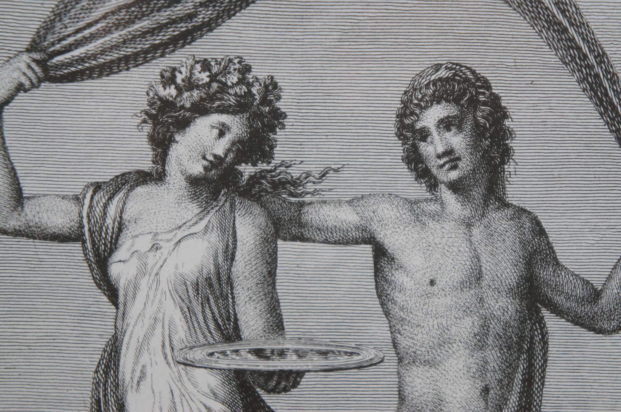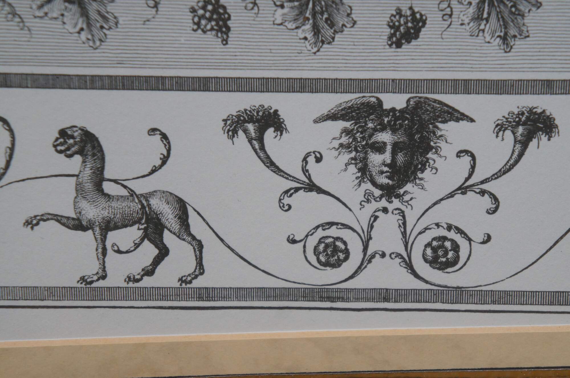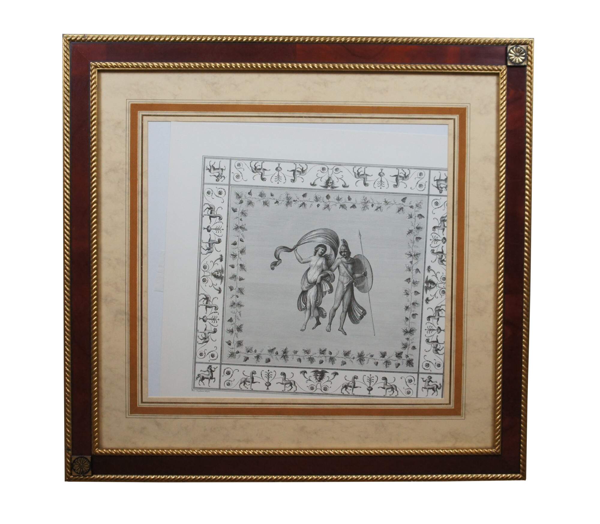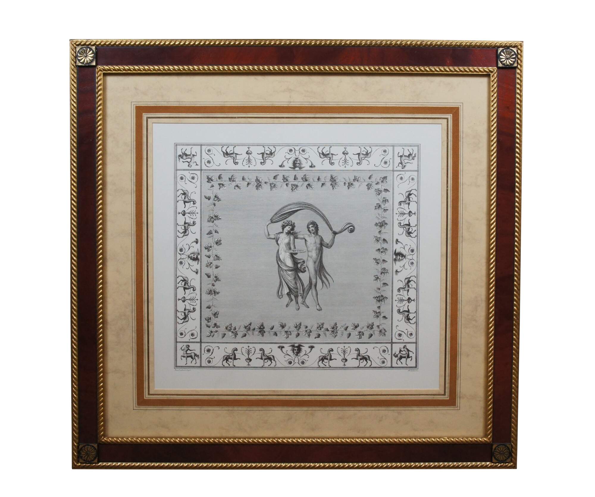 Pair of late 20th century reproduction lithograph prints after etchings originally by Franciszek Smuglewicz and printed by Marco Carloni in the late 18th century. They depict pairs of classical Greek / Roman figures, possibly gods/goddesses, framed with vines and a foliate trimmed motif of animals and grotesque faces. Mahogany frame with gold painted rope twist and rosette corner details. Liberal Marini, Rio de Janeiro Brazil.