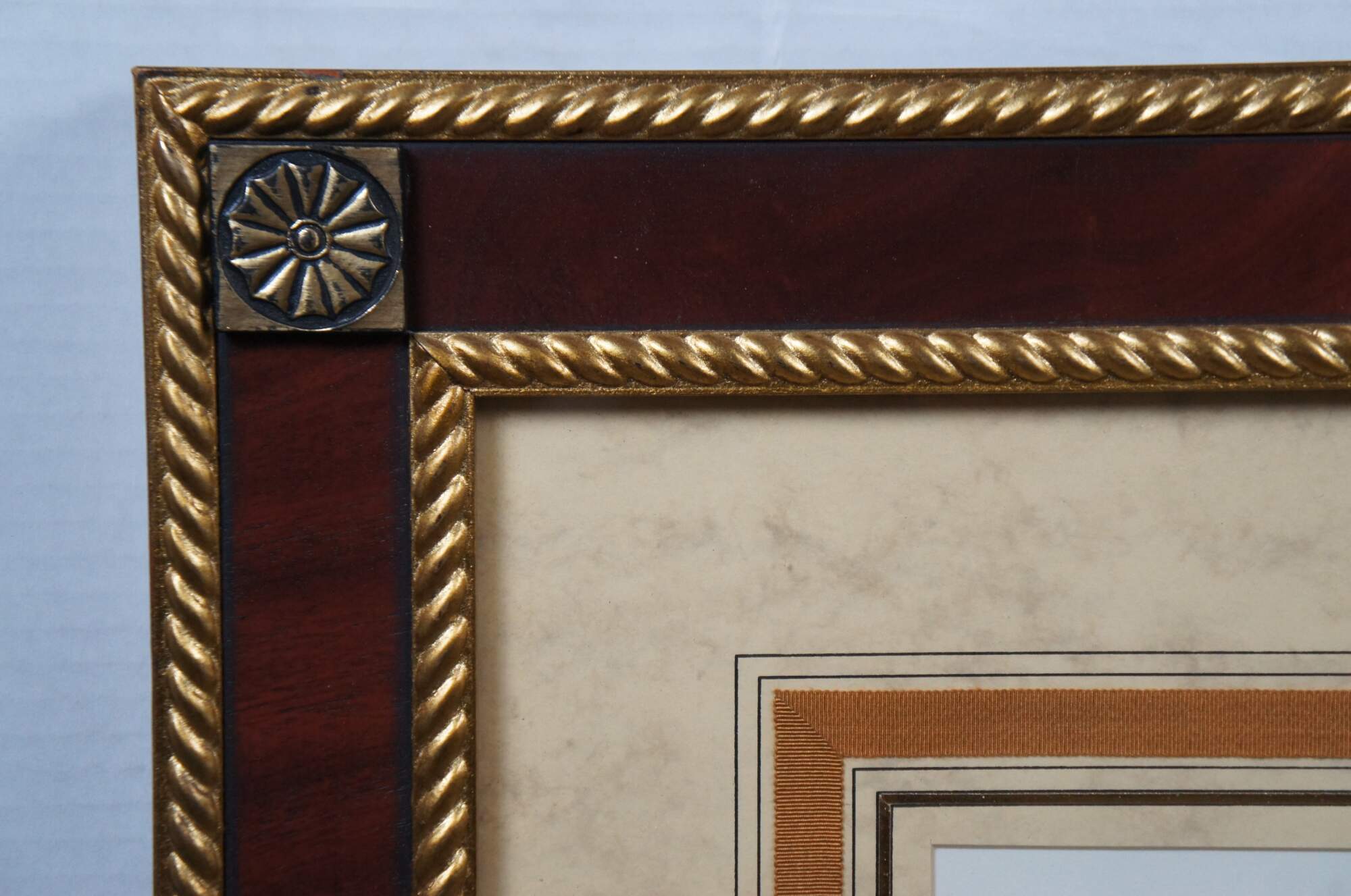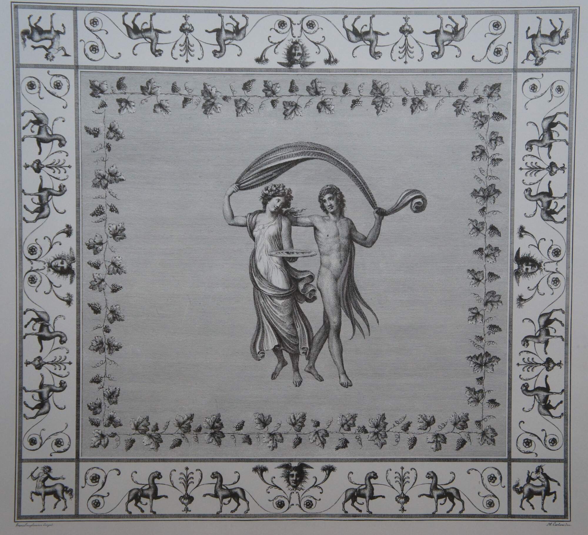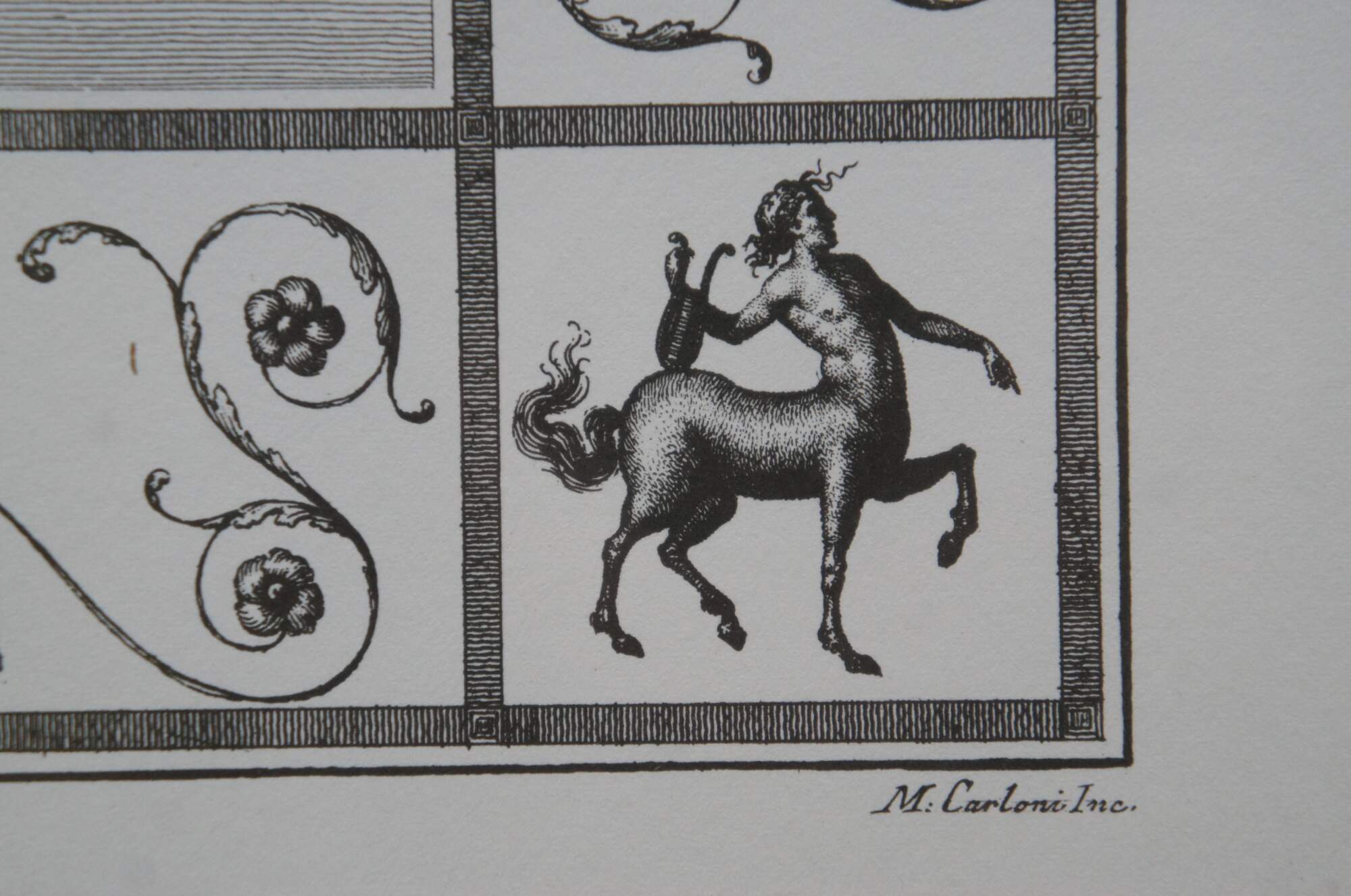 Pair of late 20th century reproduction lithograph prints after etchings originally by Franciszek Smuglewicz and printed by Marco Carloni in the late 18th century. They depict pairs of classical Greek / Roman figures, possibly gods/goddesses, framed with vines and a foliate trimmed motif of animals and grotesque faces. Mahogany frame with gold painted rope twist and rosette corner details. Liberal Marini, Rio de Janeiro Brazil.
