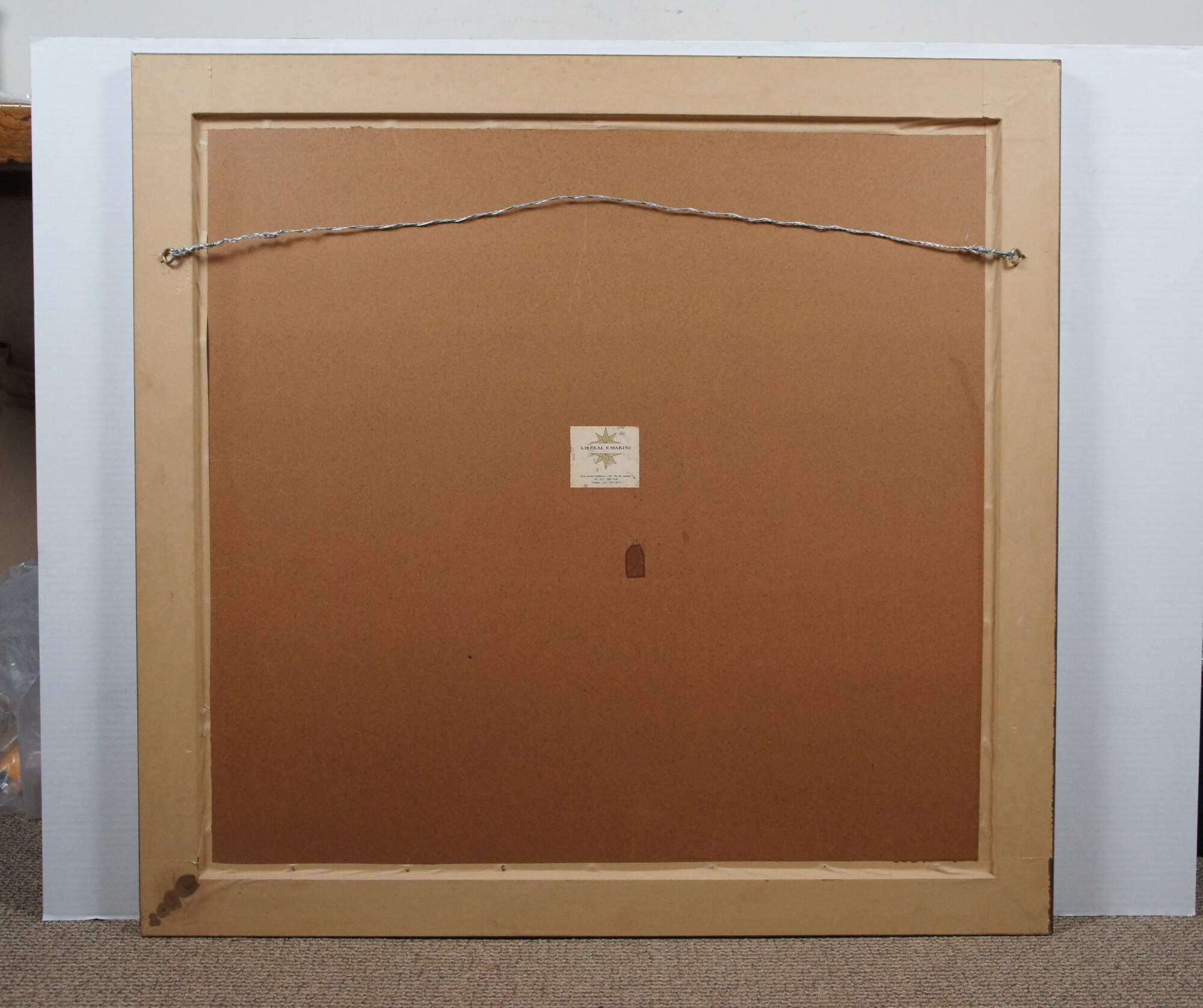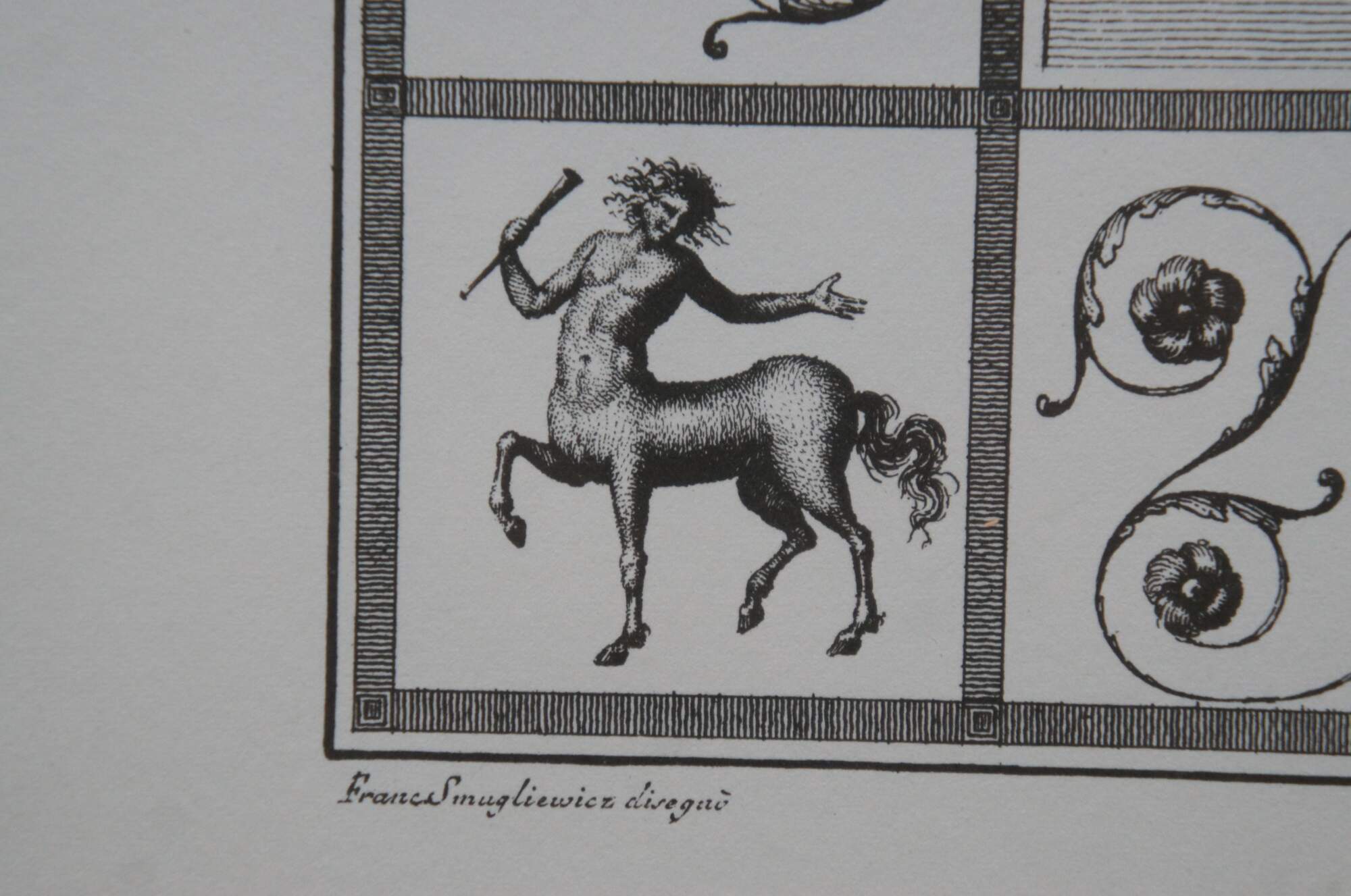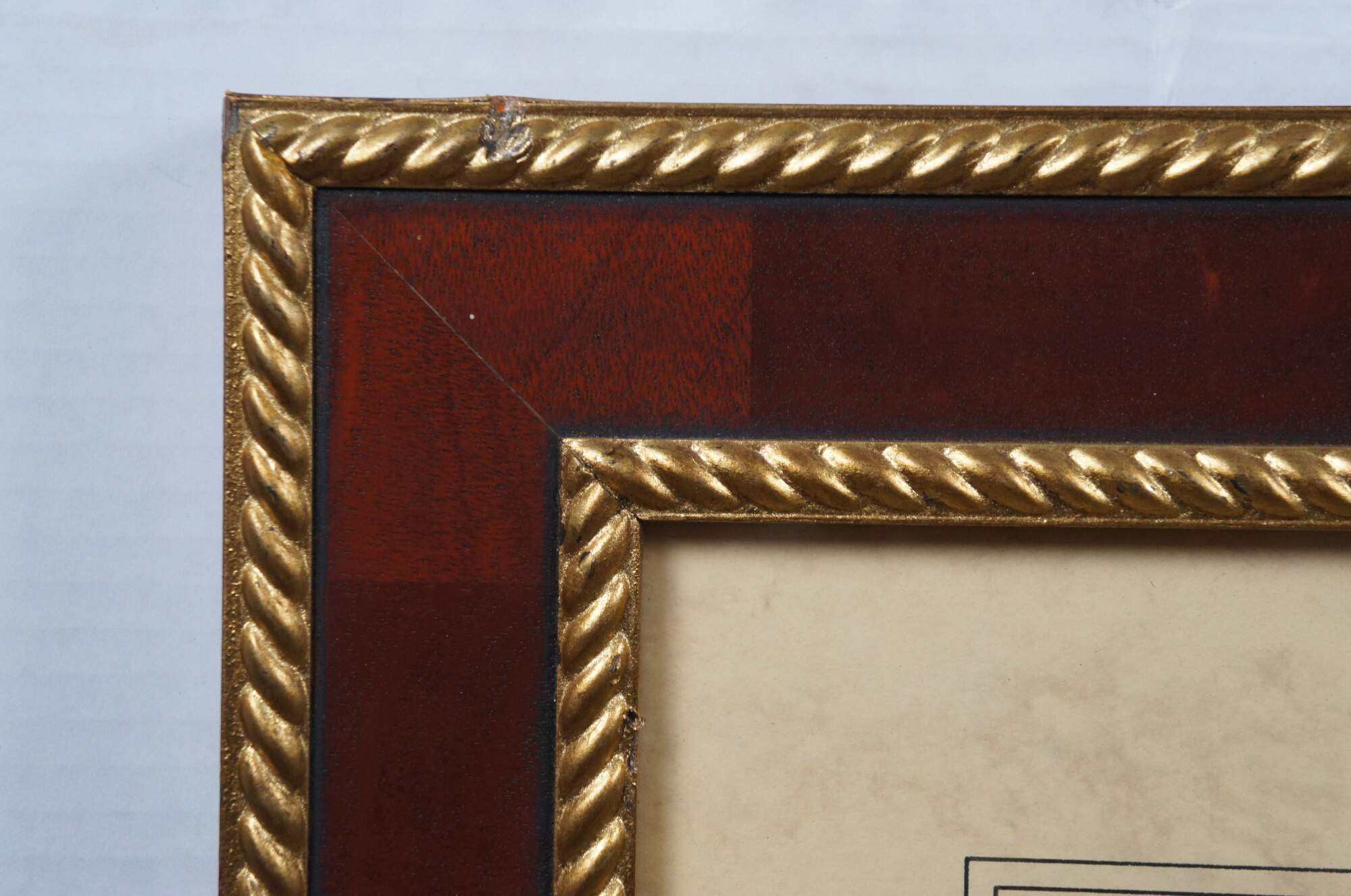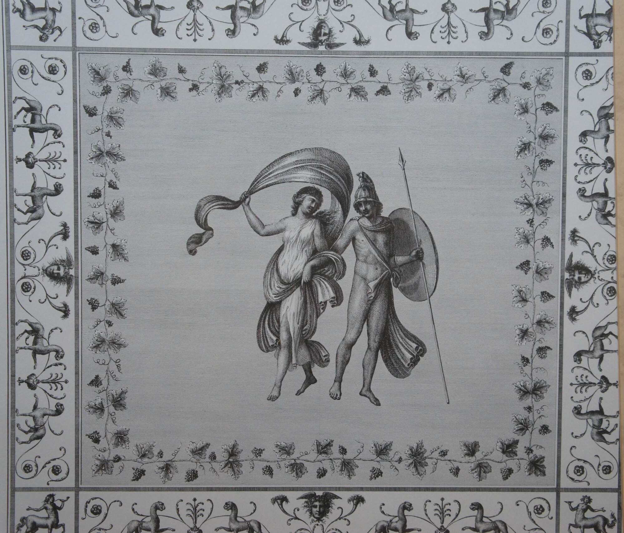 Pair of late 20th century reproduction lithograph prints after etchings originally by Franciszek Smuglewicz and printed by Marco Carloni in the late 18th century. They depict pairs of classical Greek / Roman figures, possibly gods/goddesses, framed with vines and a foliate trimmed motif of animals and grotesque faces. Mahogany frame with gold painted rope twist and rosette corner details. Liberal Marini, Rio de Janeiro Brazil.