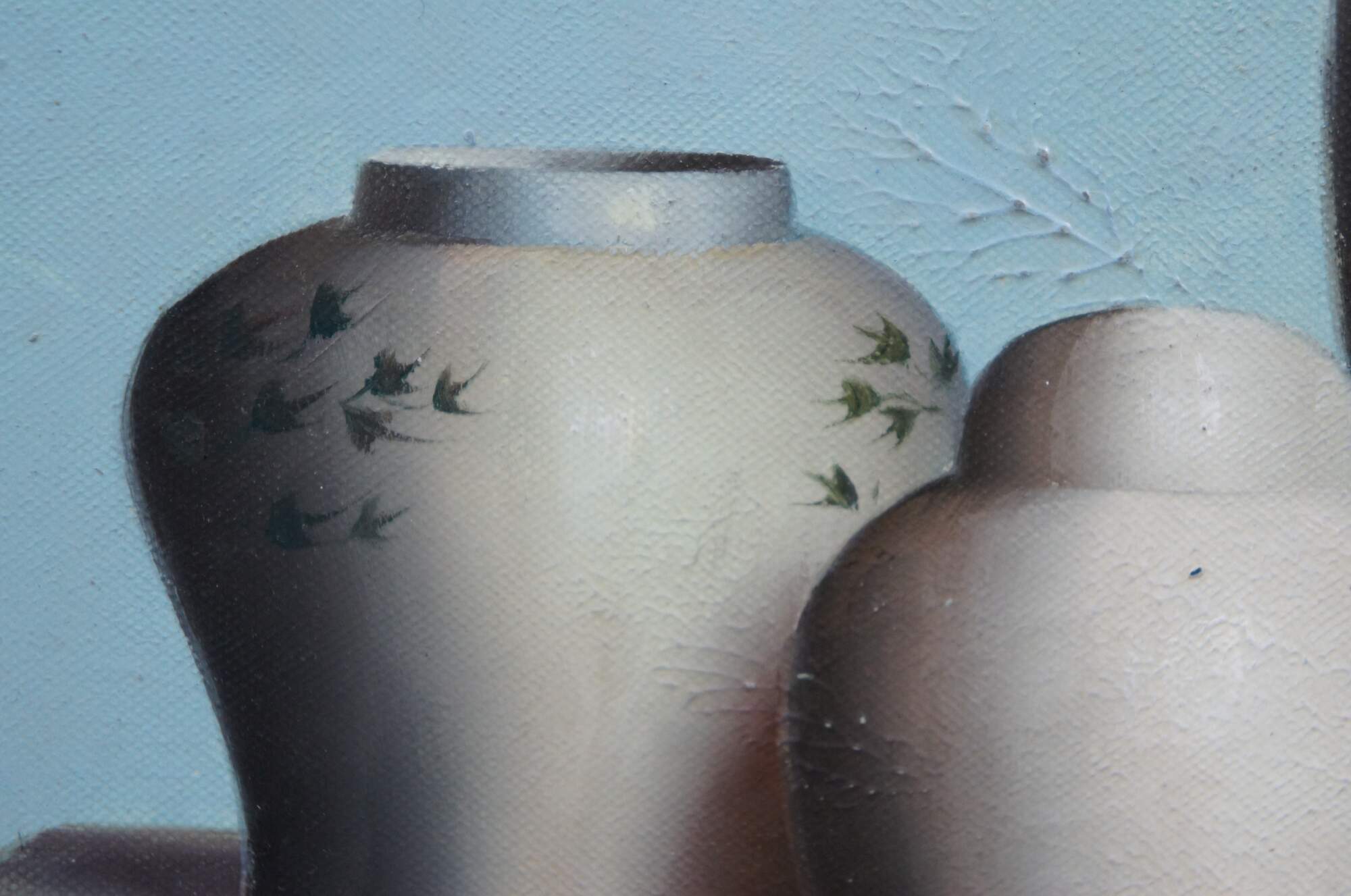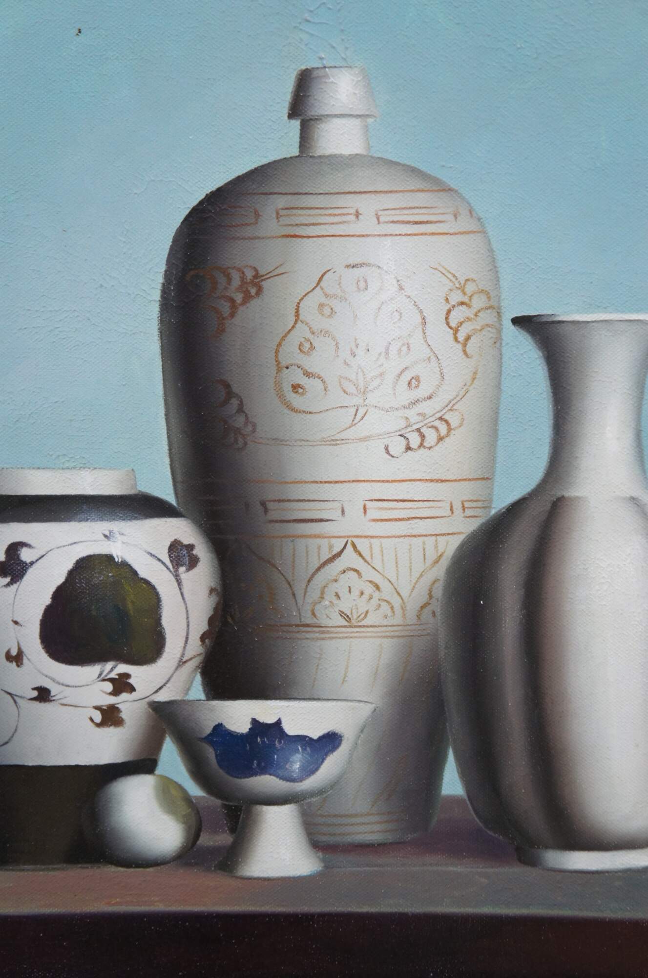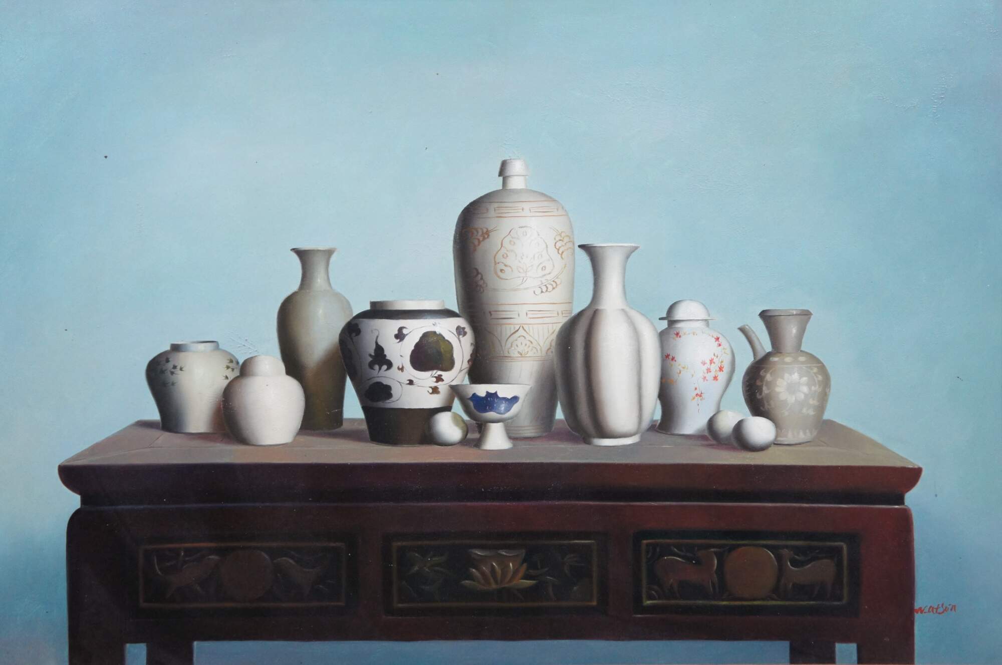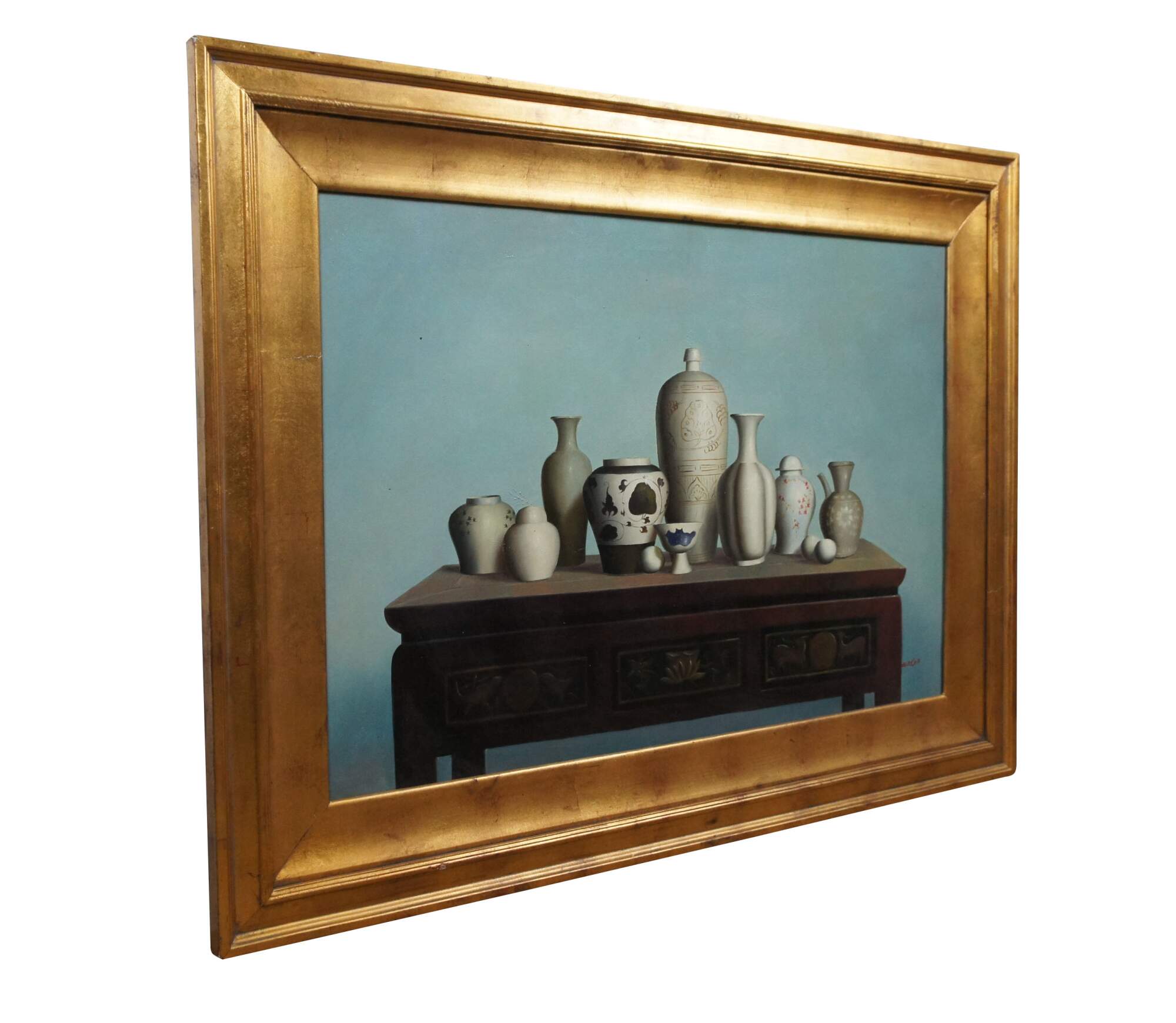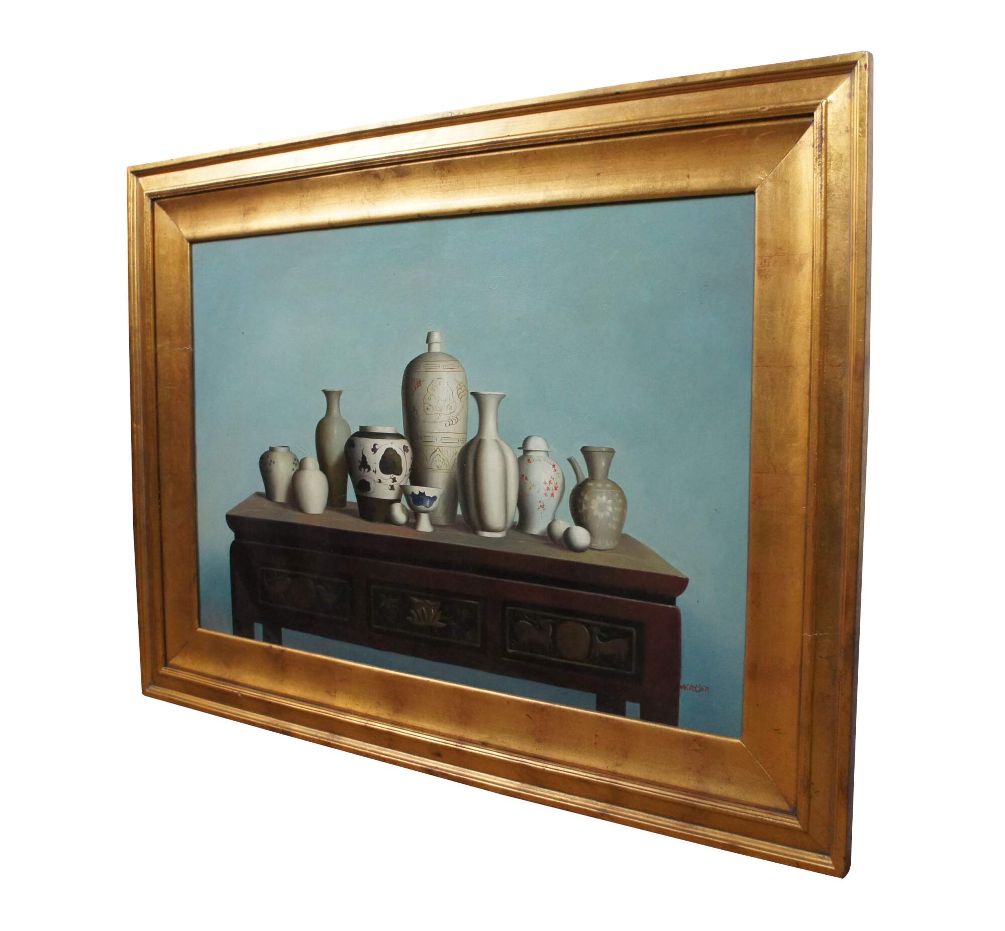 Late 20th century still life oil painting on canvas depicting a clean, realistic array of Asian vases / pottery on a carved wooden table with a light blue background and textured varnish. Signed Watson in lower right. Beveled gilt wood frame.