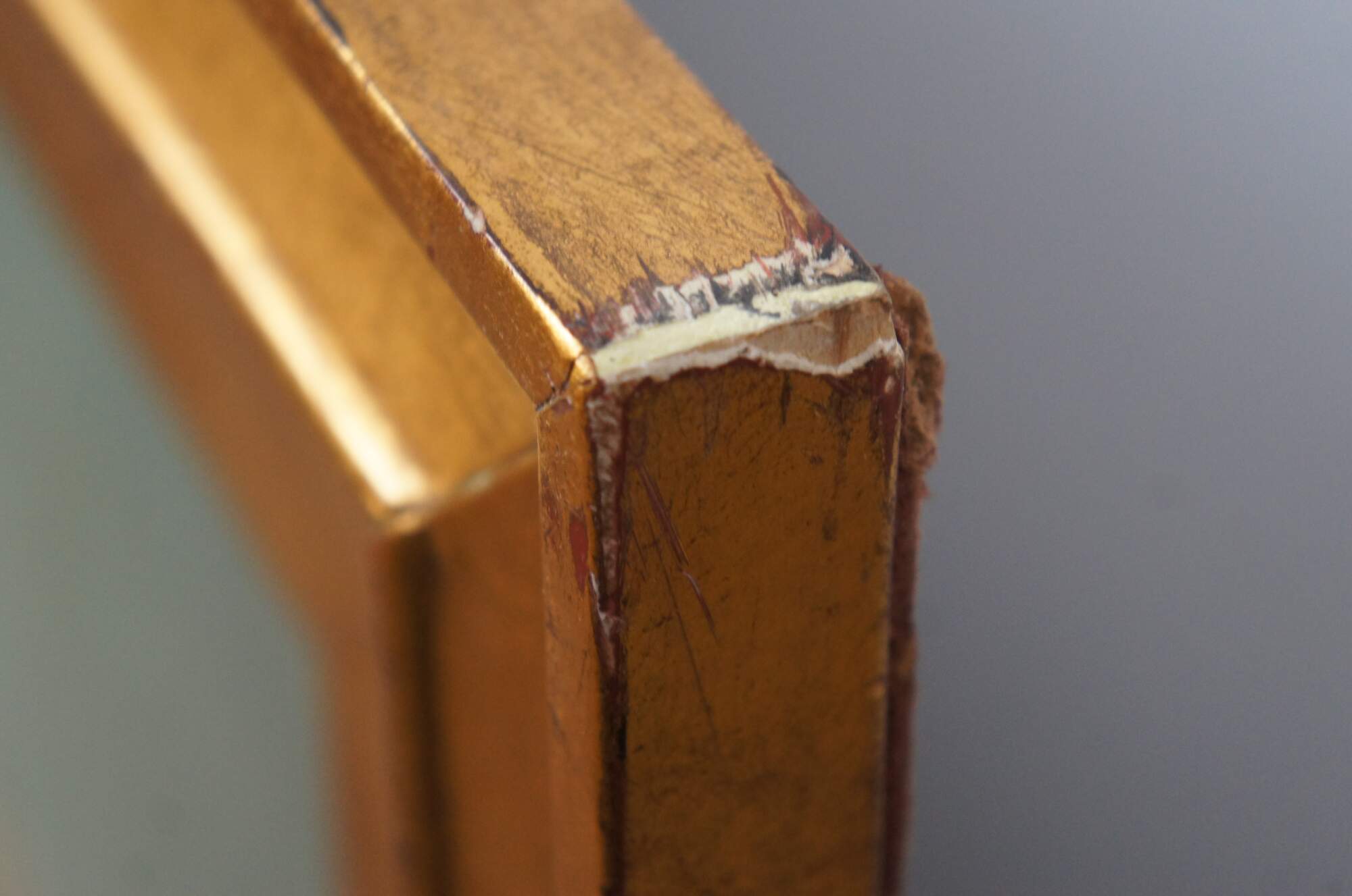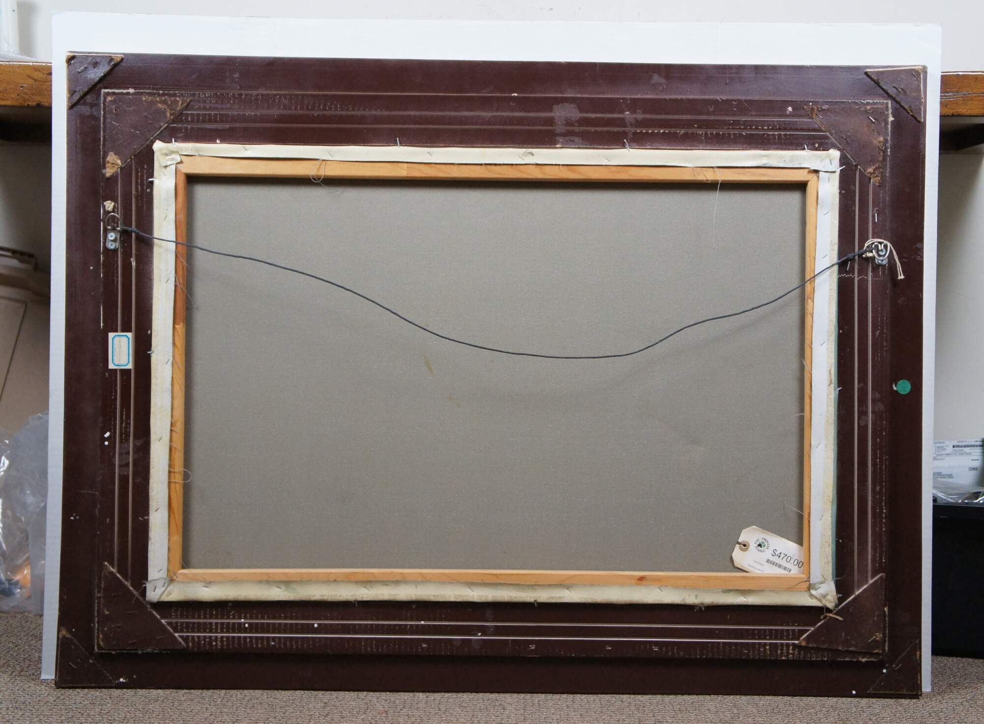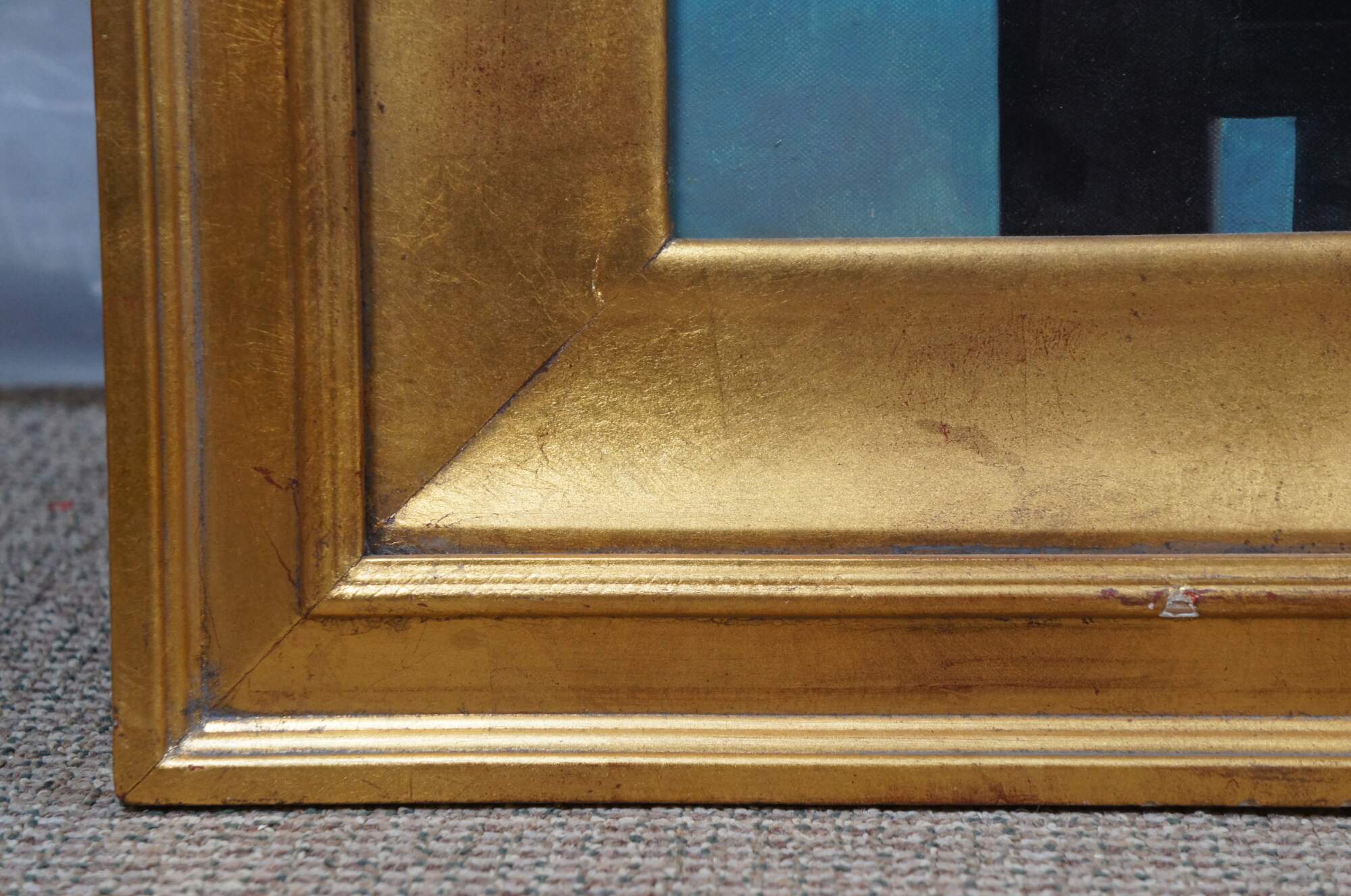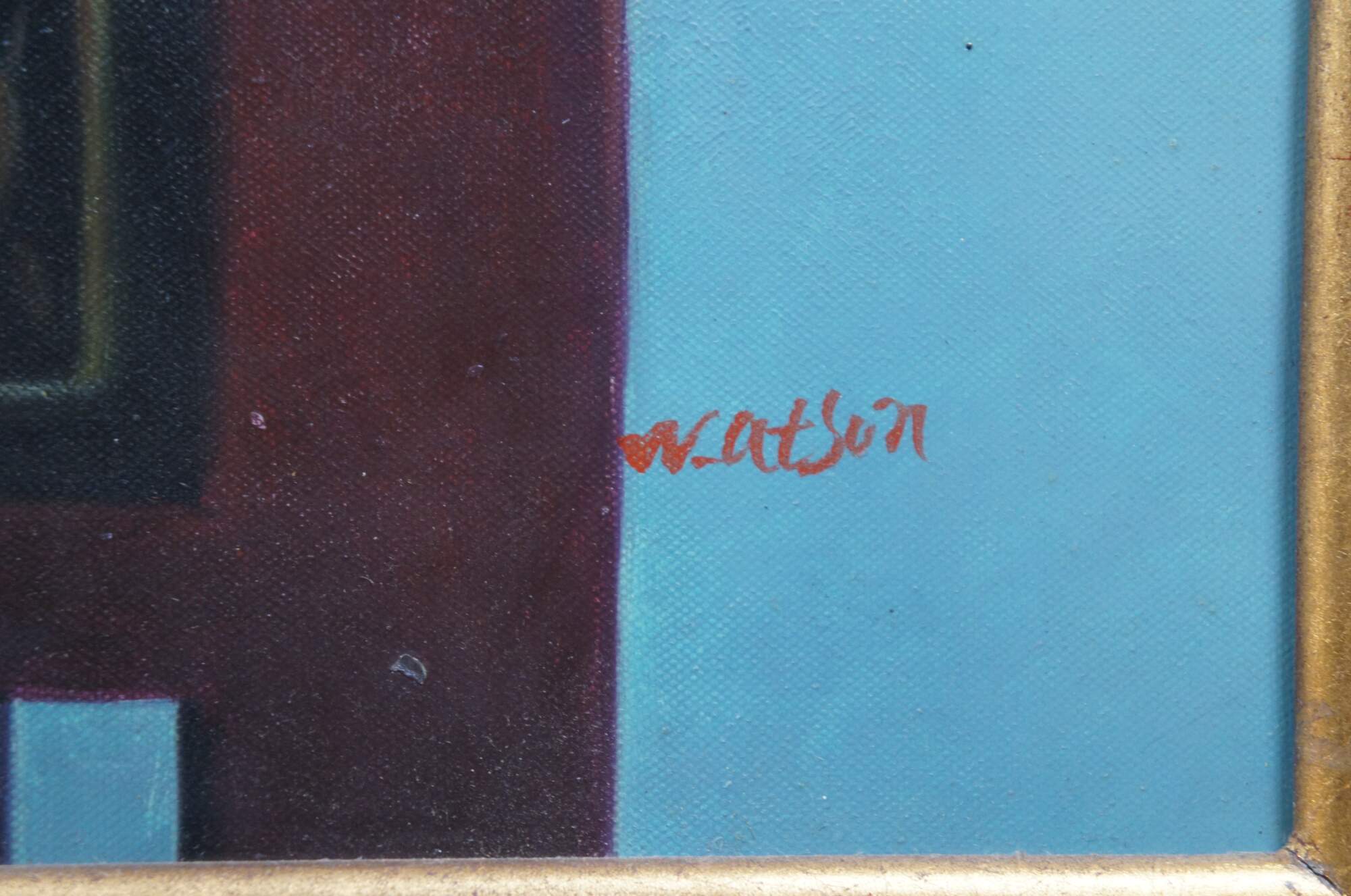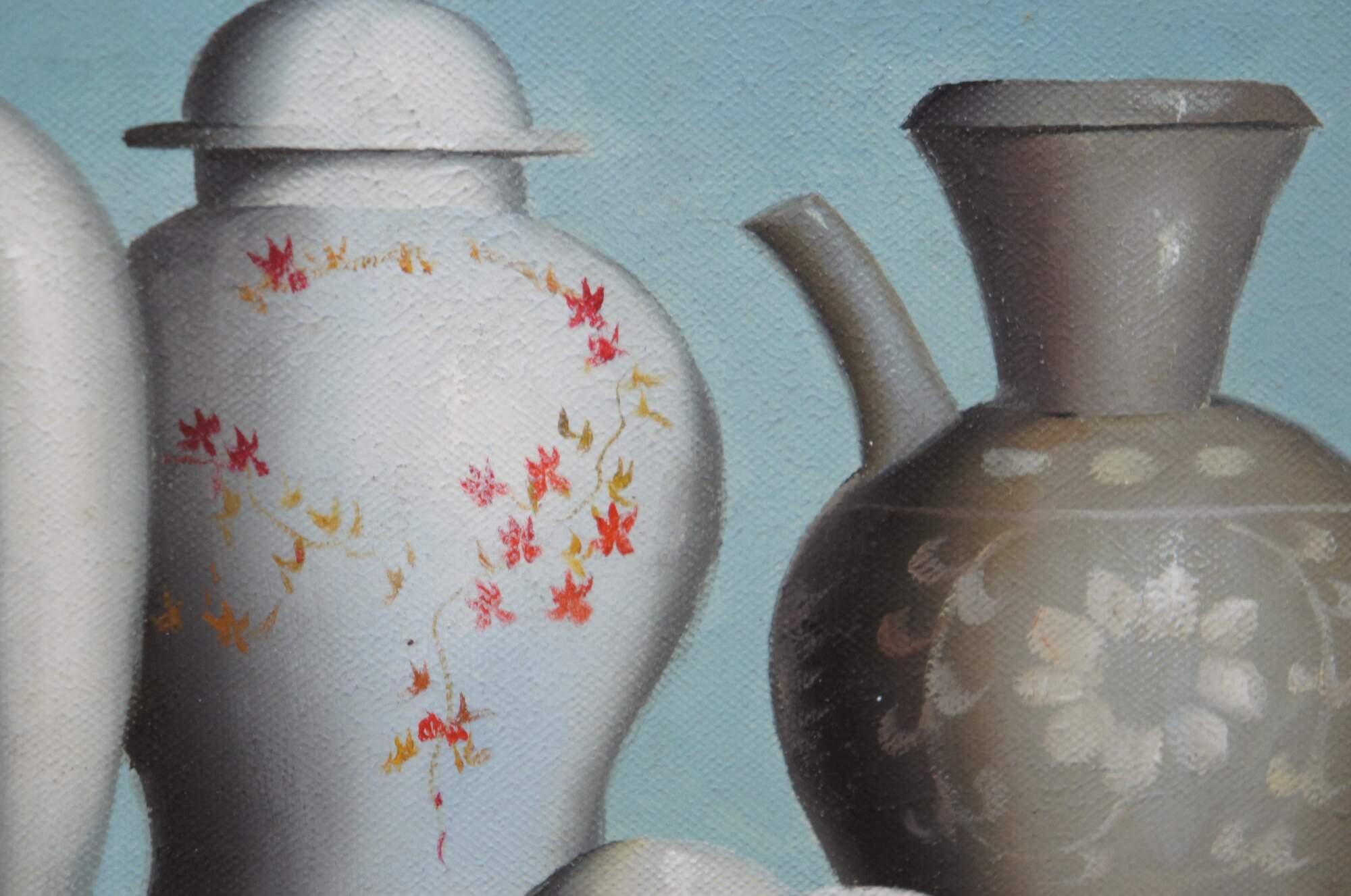 Late 20th century still life oil painting on canvas depicting a clean, realistic array of Asian vases / pottery on a carved wooden table with a light blue background and textured varnish. Signed Watson in lower right. Beveled gilt wood frame.