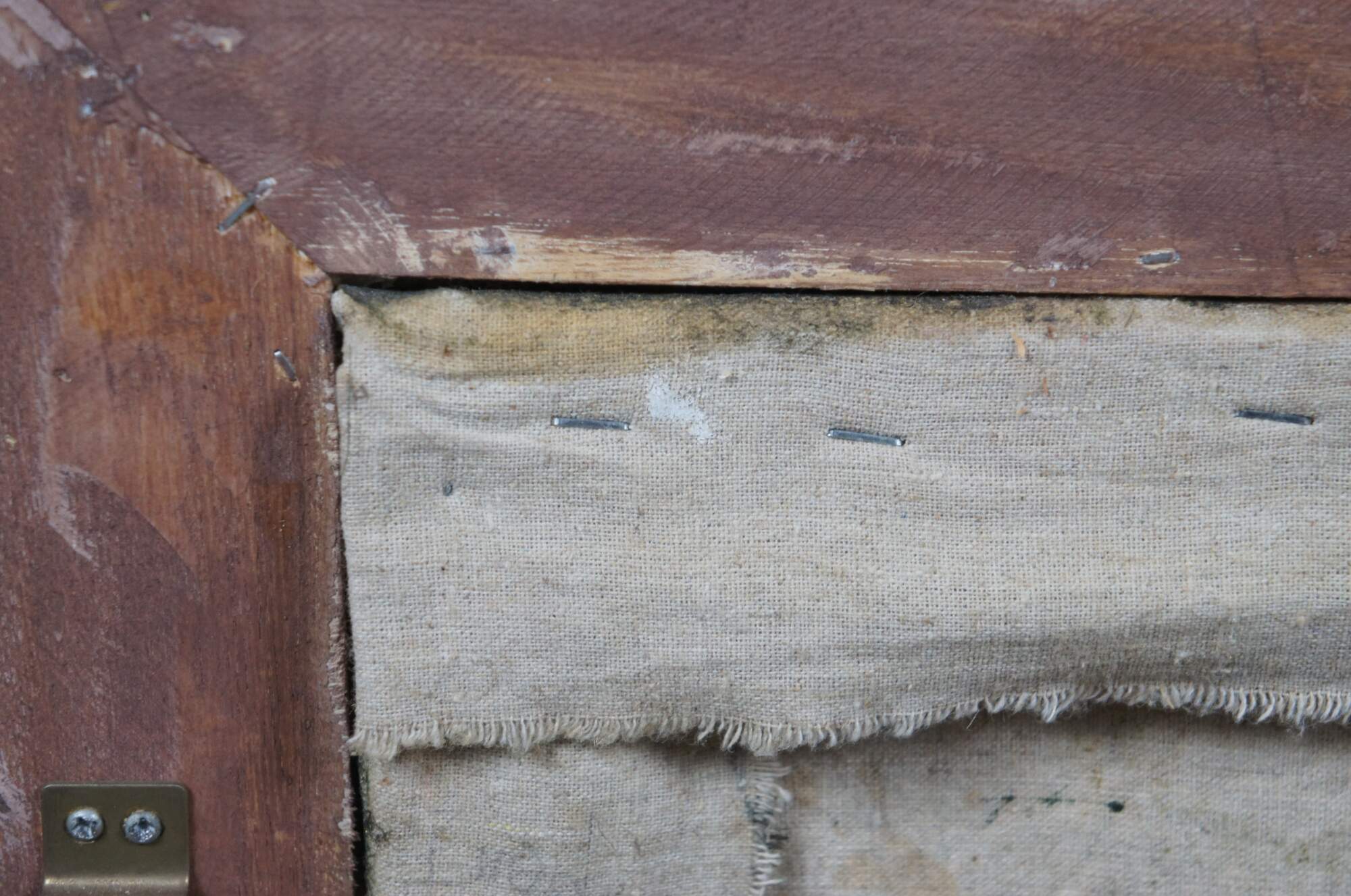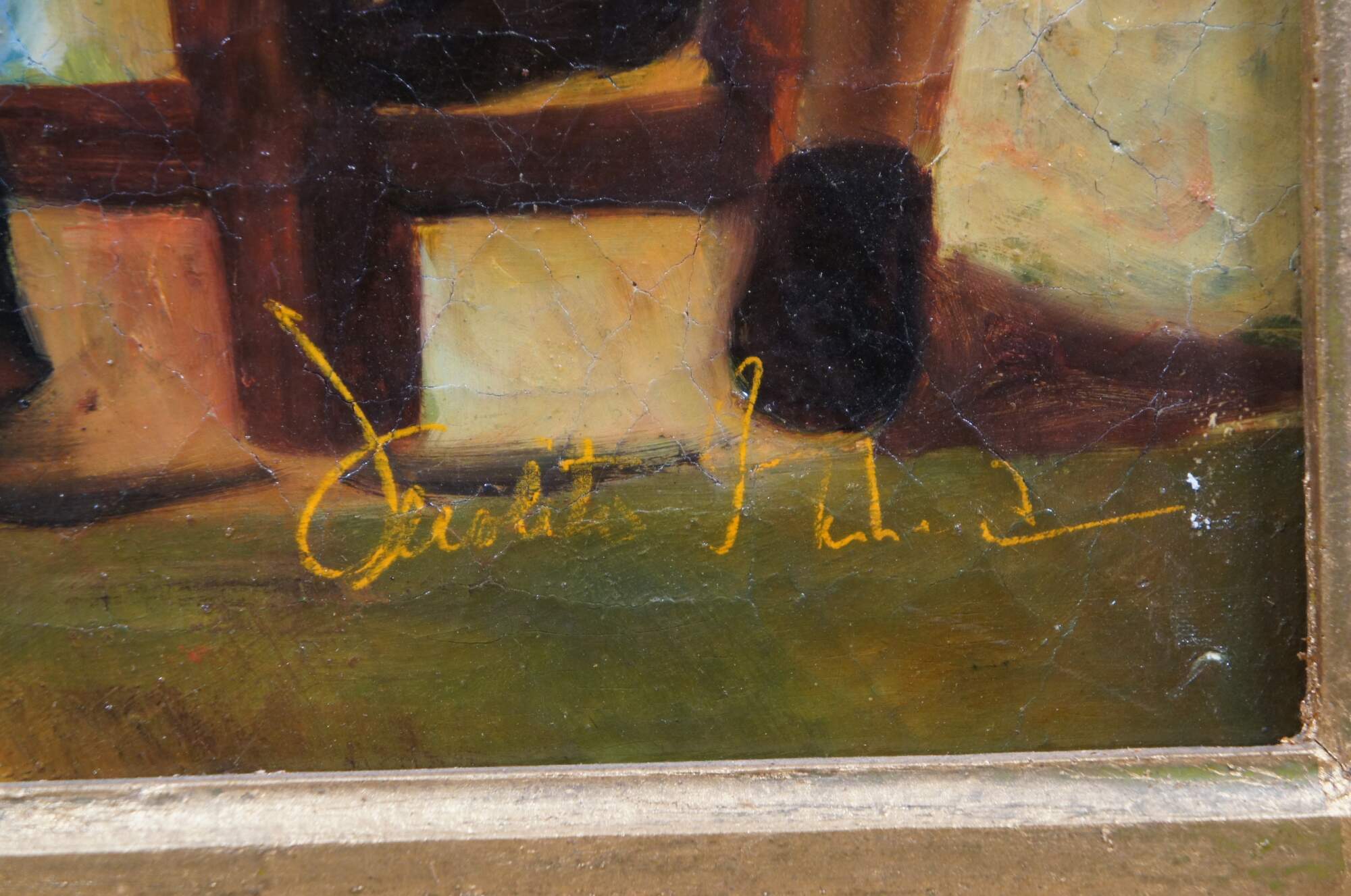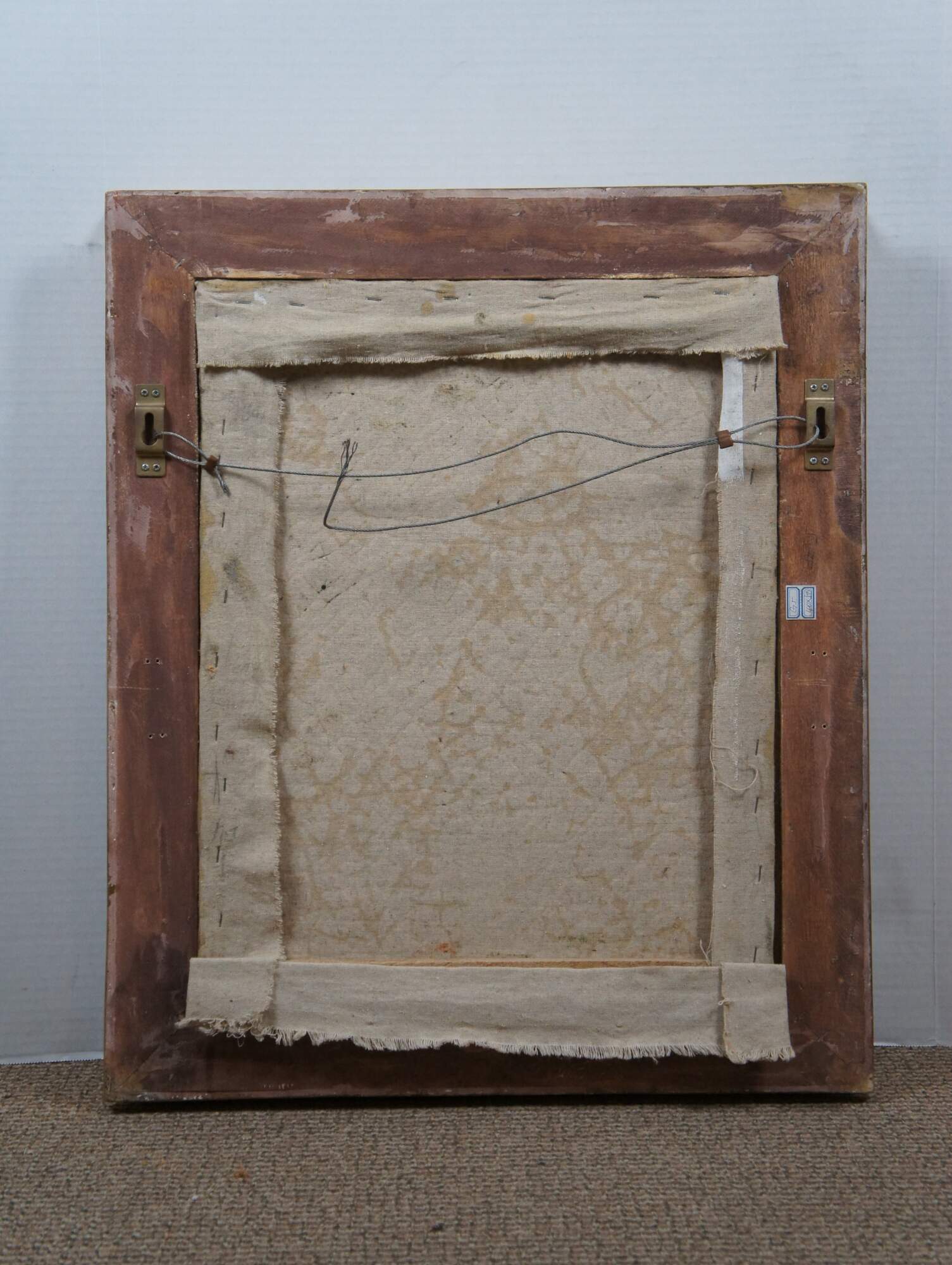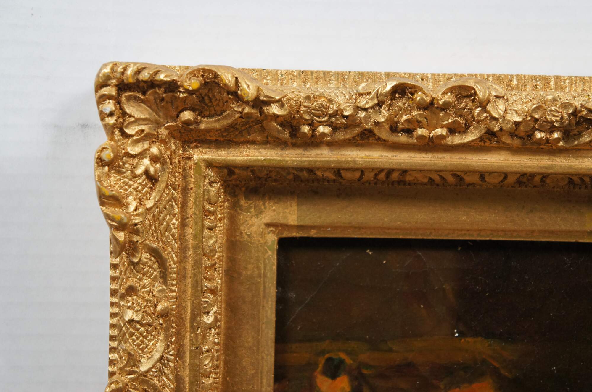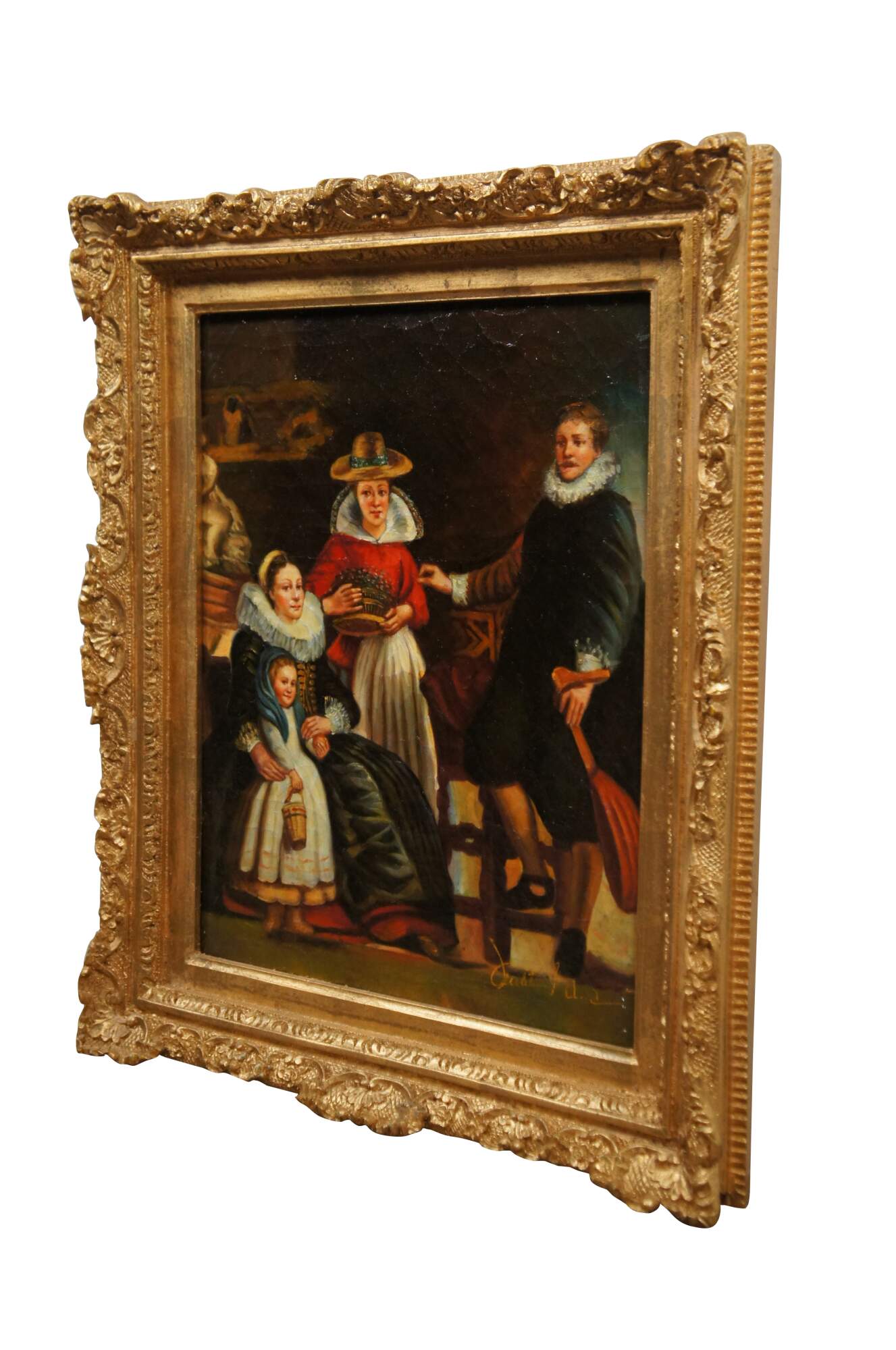 Late 20th century oil painting on linen after "The Artist's Family" by Jacob Jordaens, originally painted circa 1621-1622 (currently house at the Museo del Prado). Depicts Jordaens standing with his wife, daughter, and a servant. Beveled frame with resin molded foliate / scalloped designs and a gold finish.