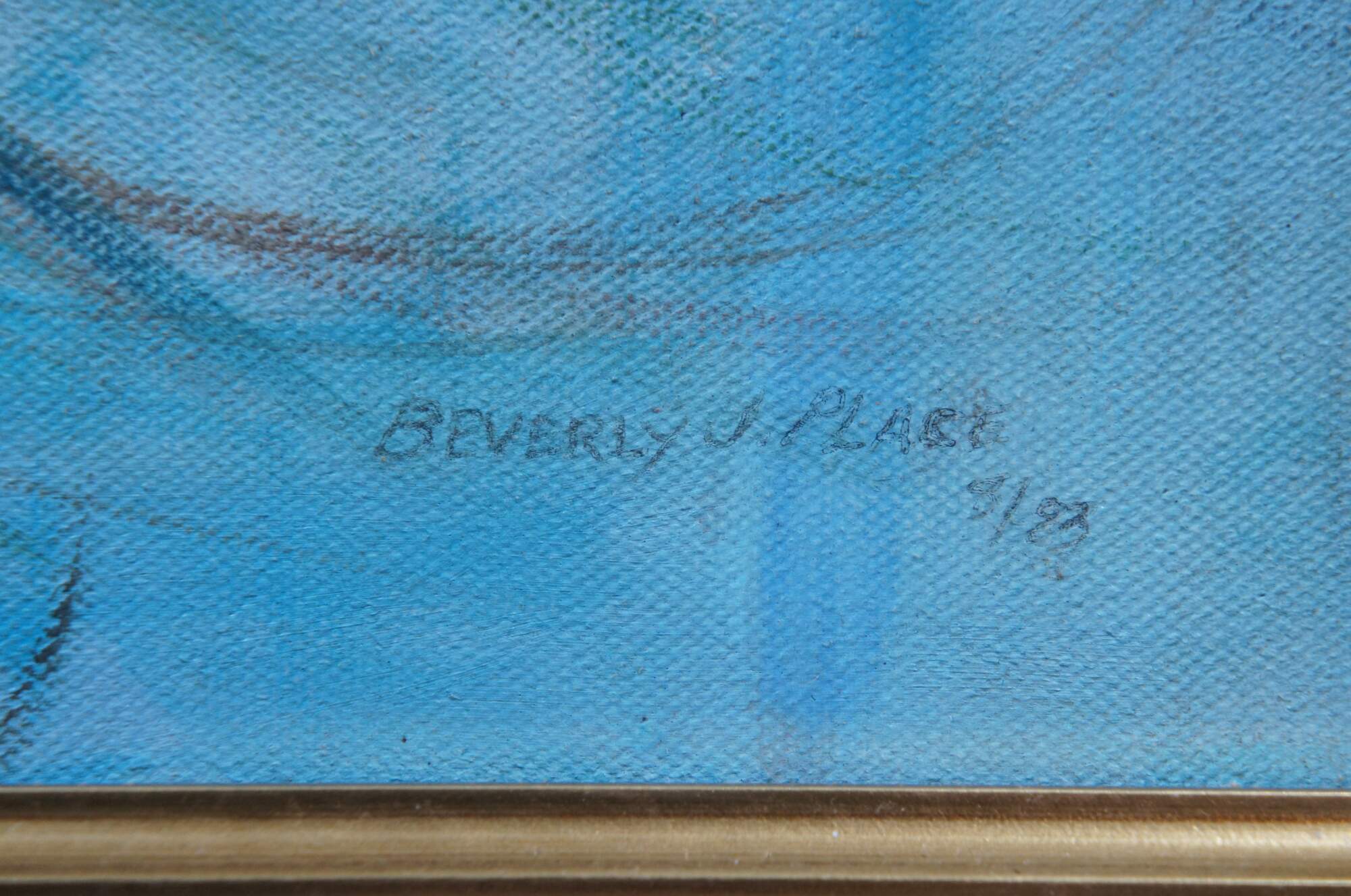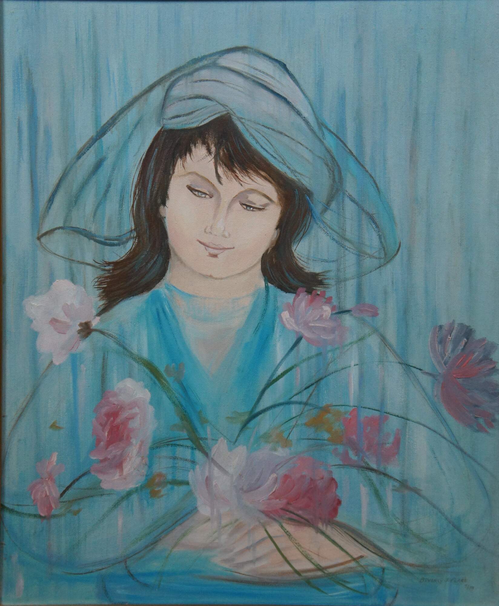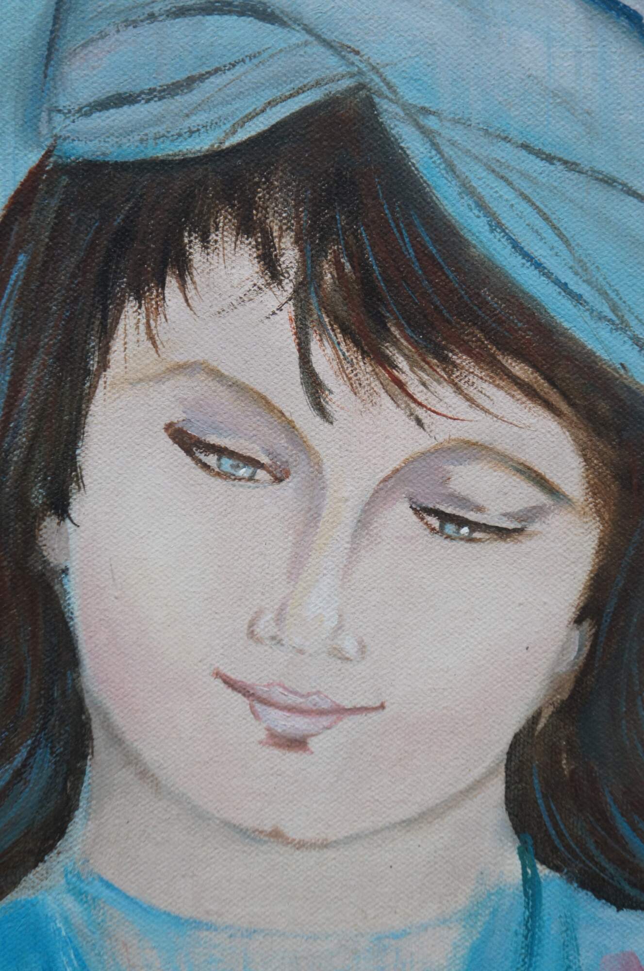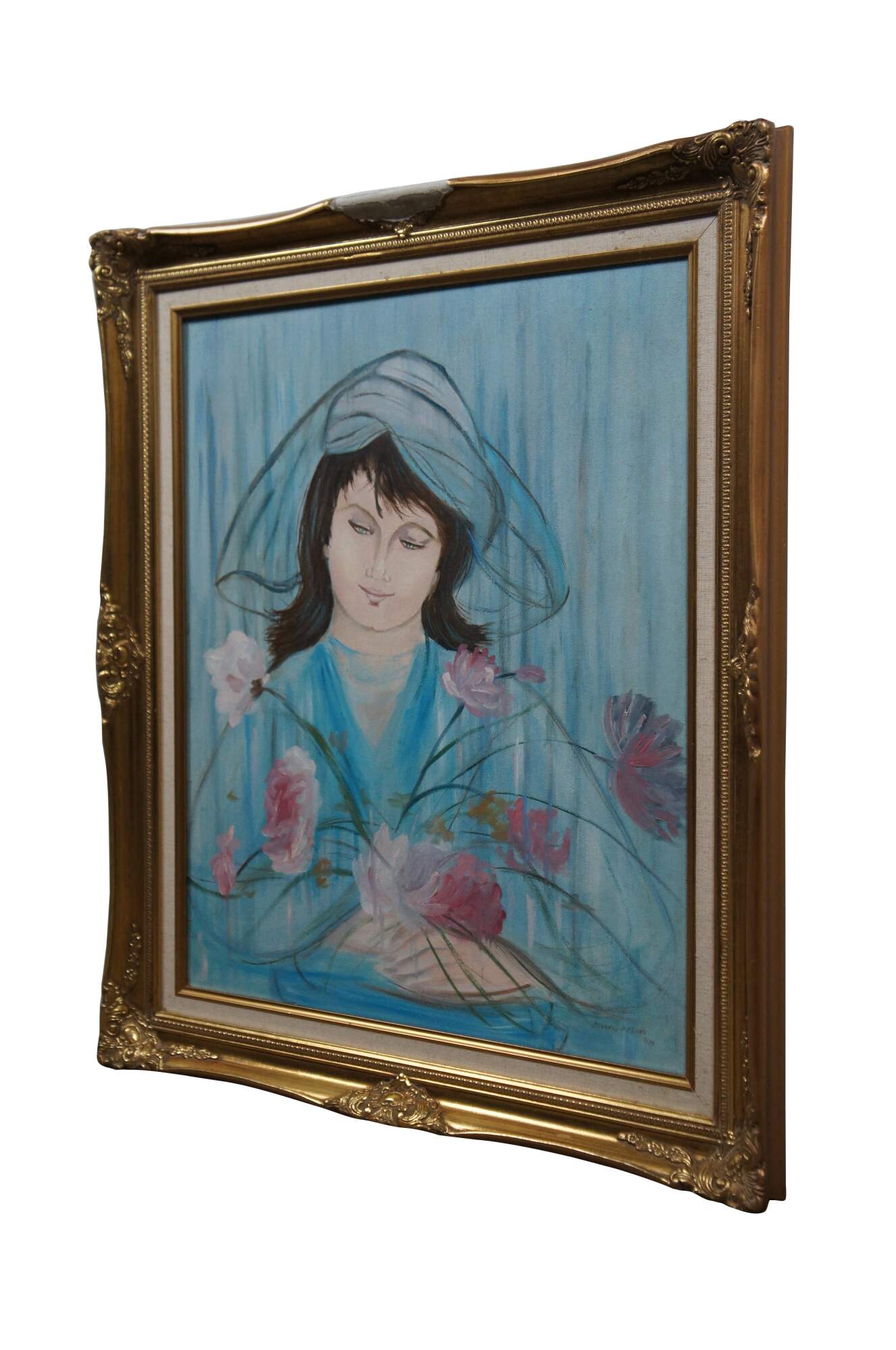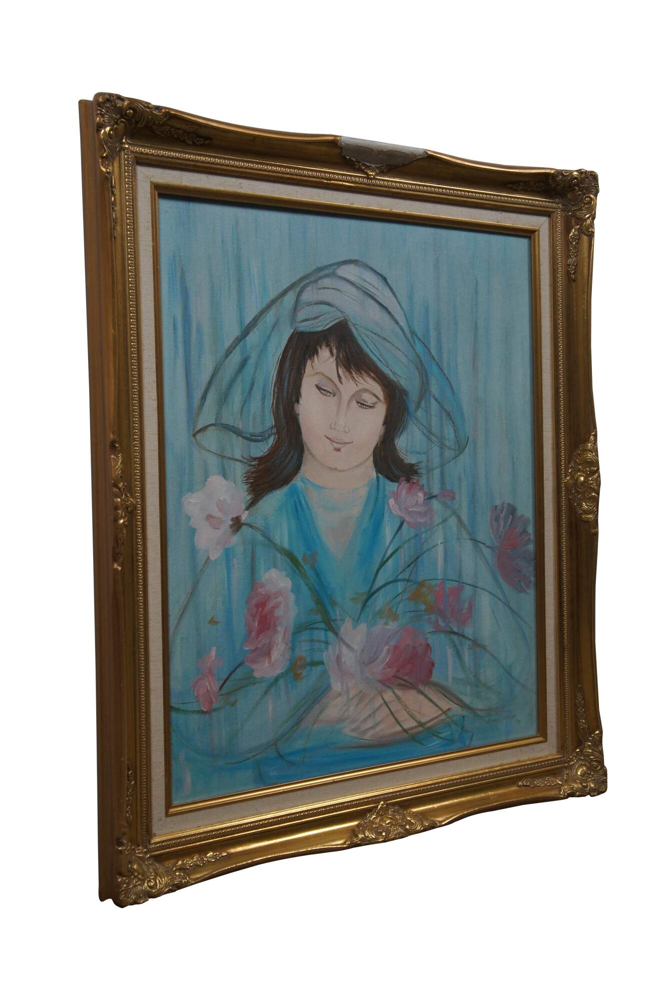 Vintage 1990's portrait oil painting on canvas of a young woman (possibly the Virgin Mary) with brown hair, dressed in blue and holding pink flowers. Signed Beverly J. Place in lower right corner and dated 8/92. Beveled gold frame with molded plaster foliate corners and white linen mat.