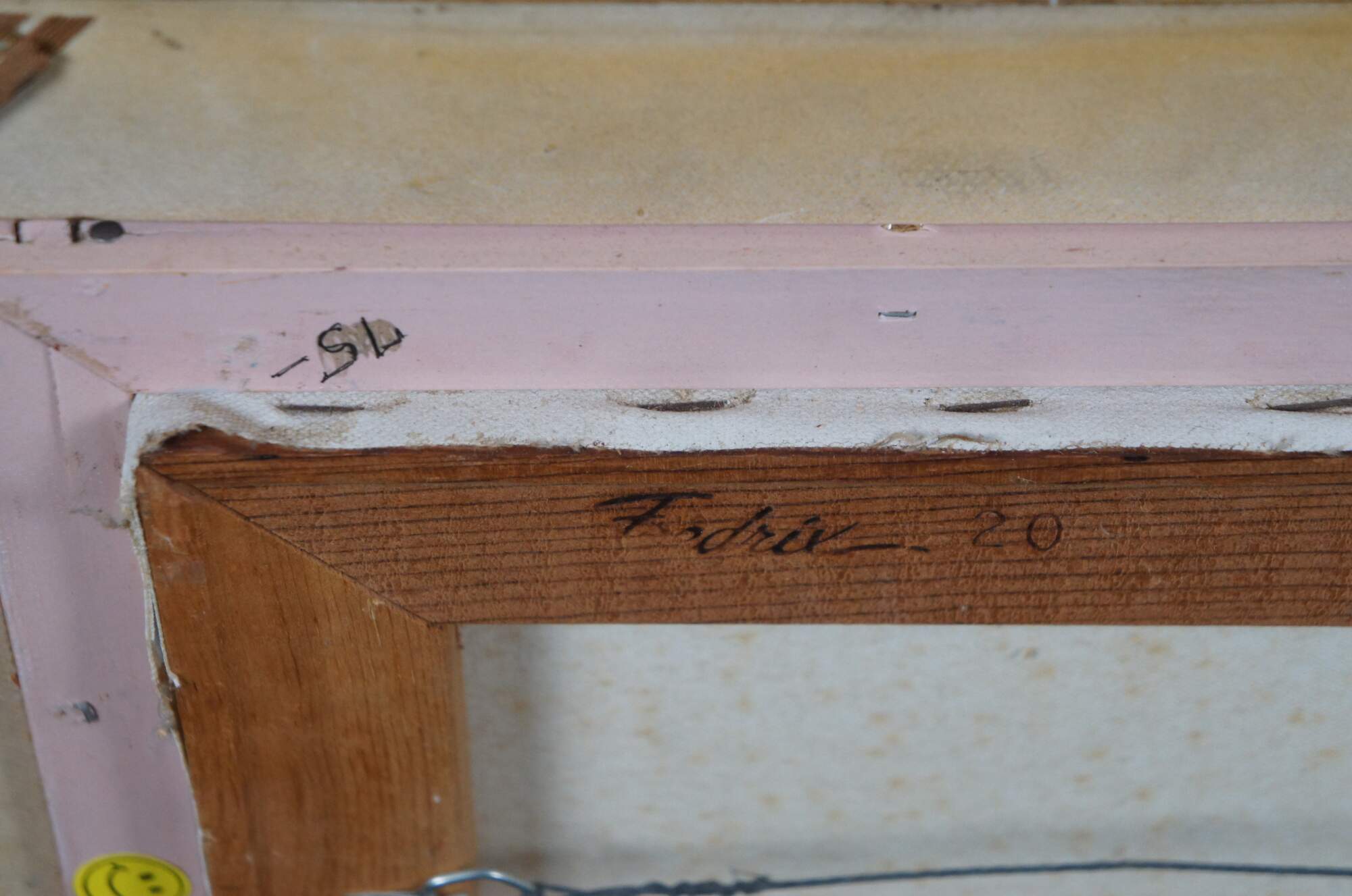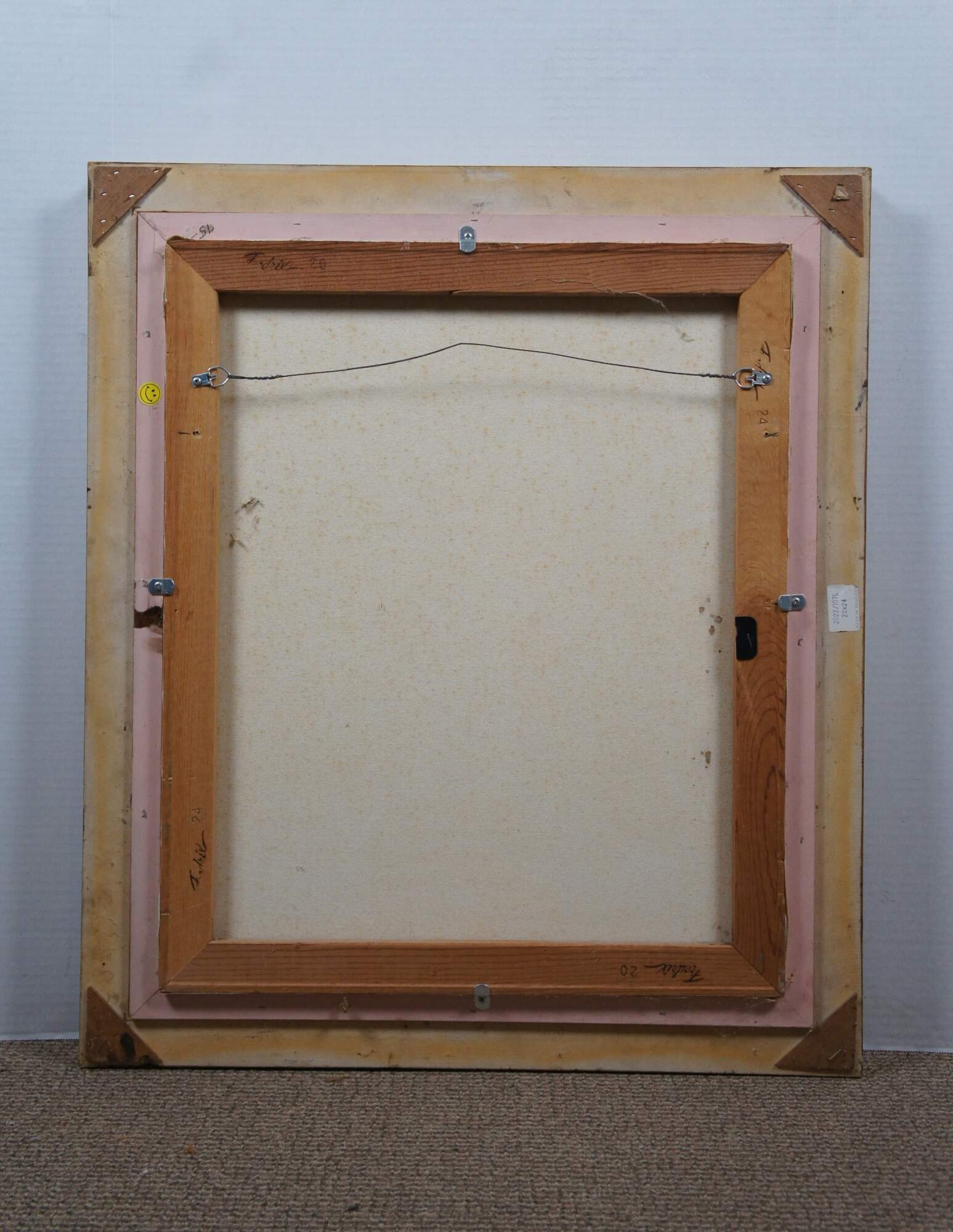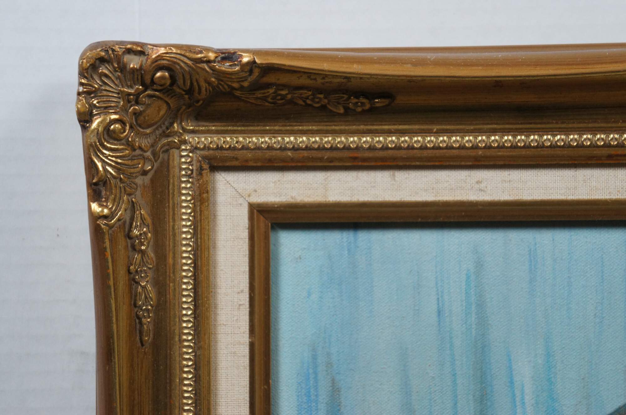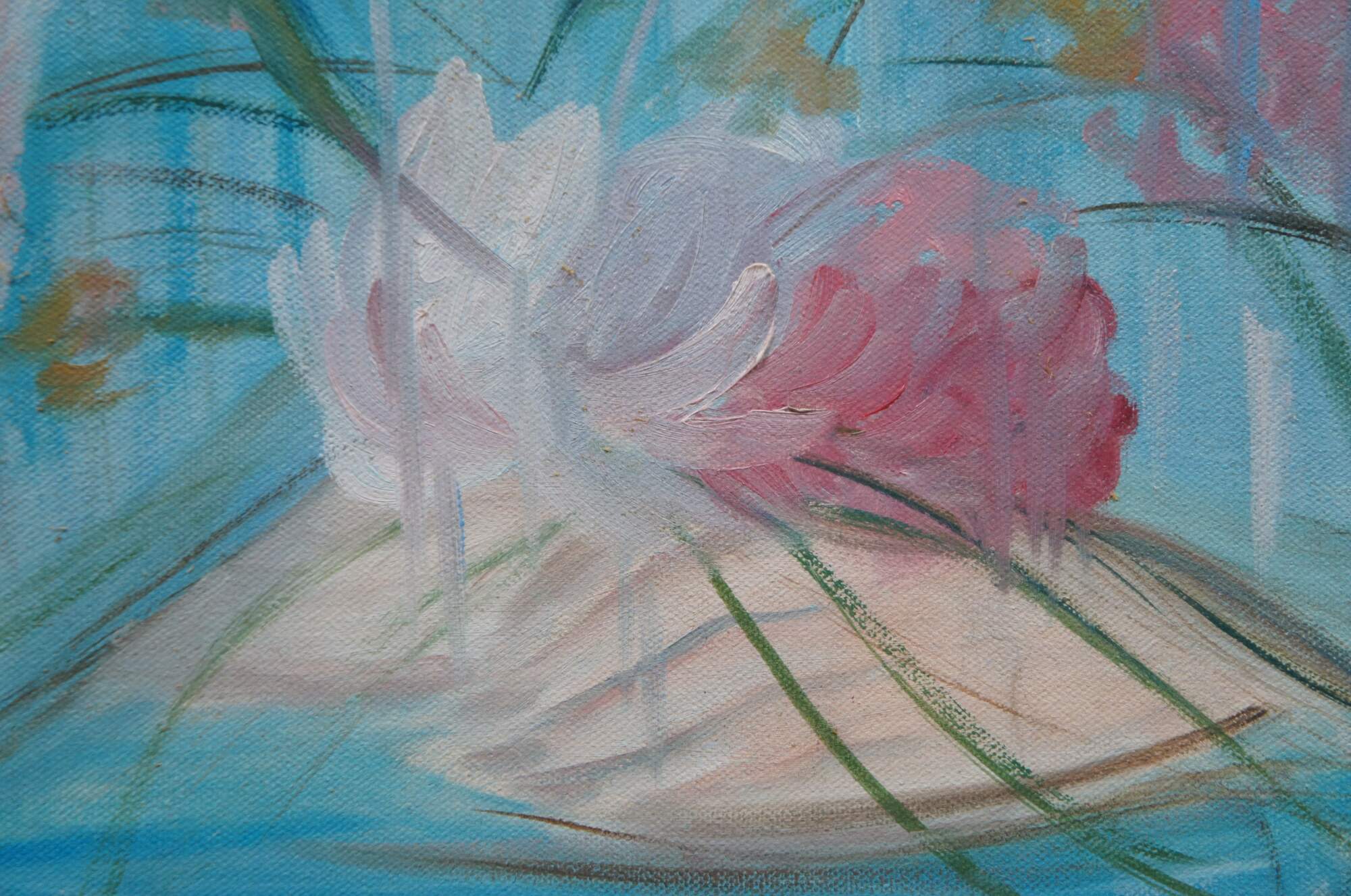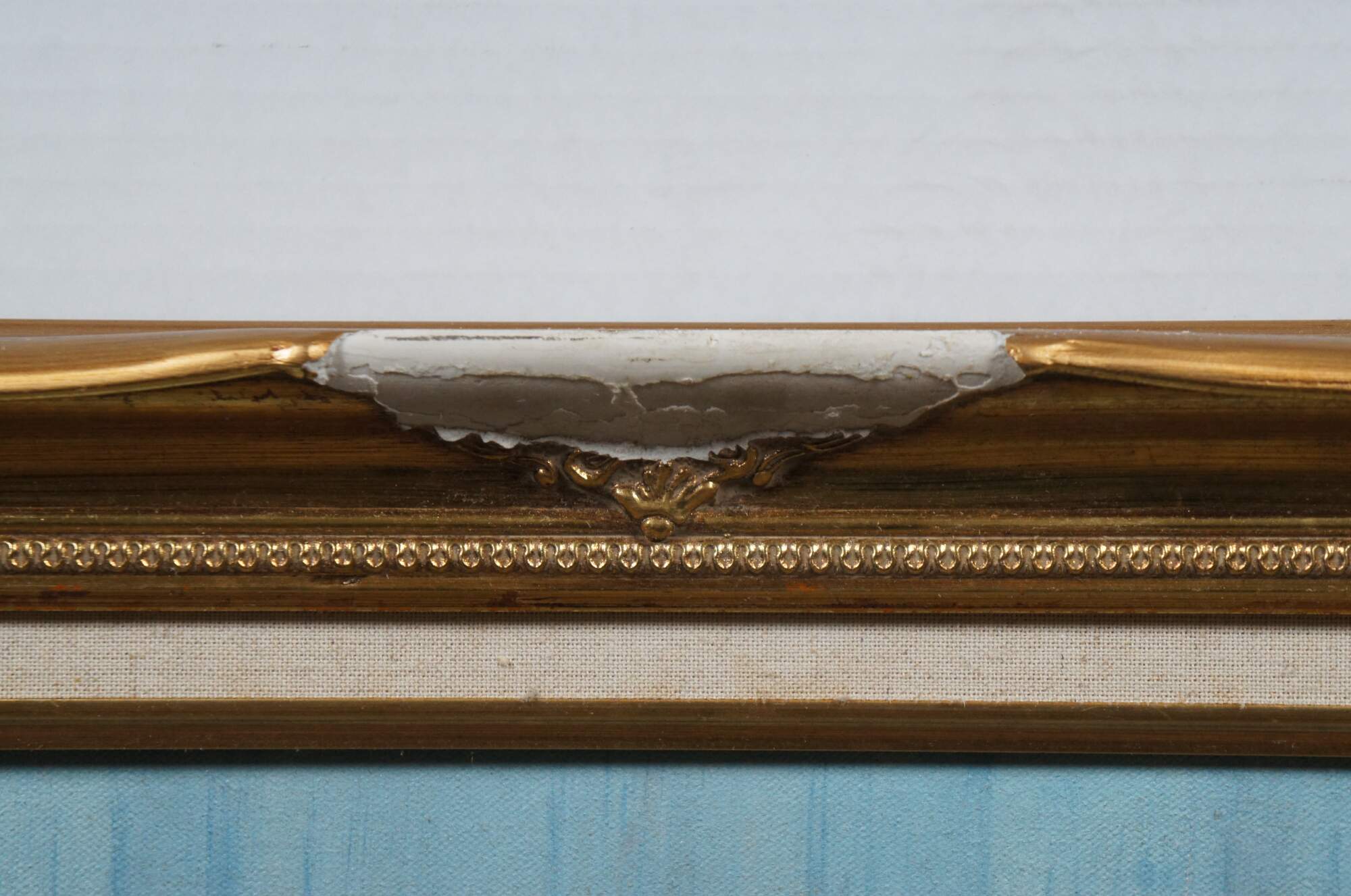 Vintage 1990's portrait oil painting on canvas of a young woman (possibly the Virgin Mary) with brown hair, dressed in blue and holding pink flowers. Signed Beverly J. Place in lower right corner and dated 8/92. Beveled gold frame with molded plaster foliate corners and white linen mat.