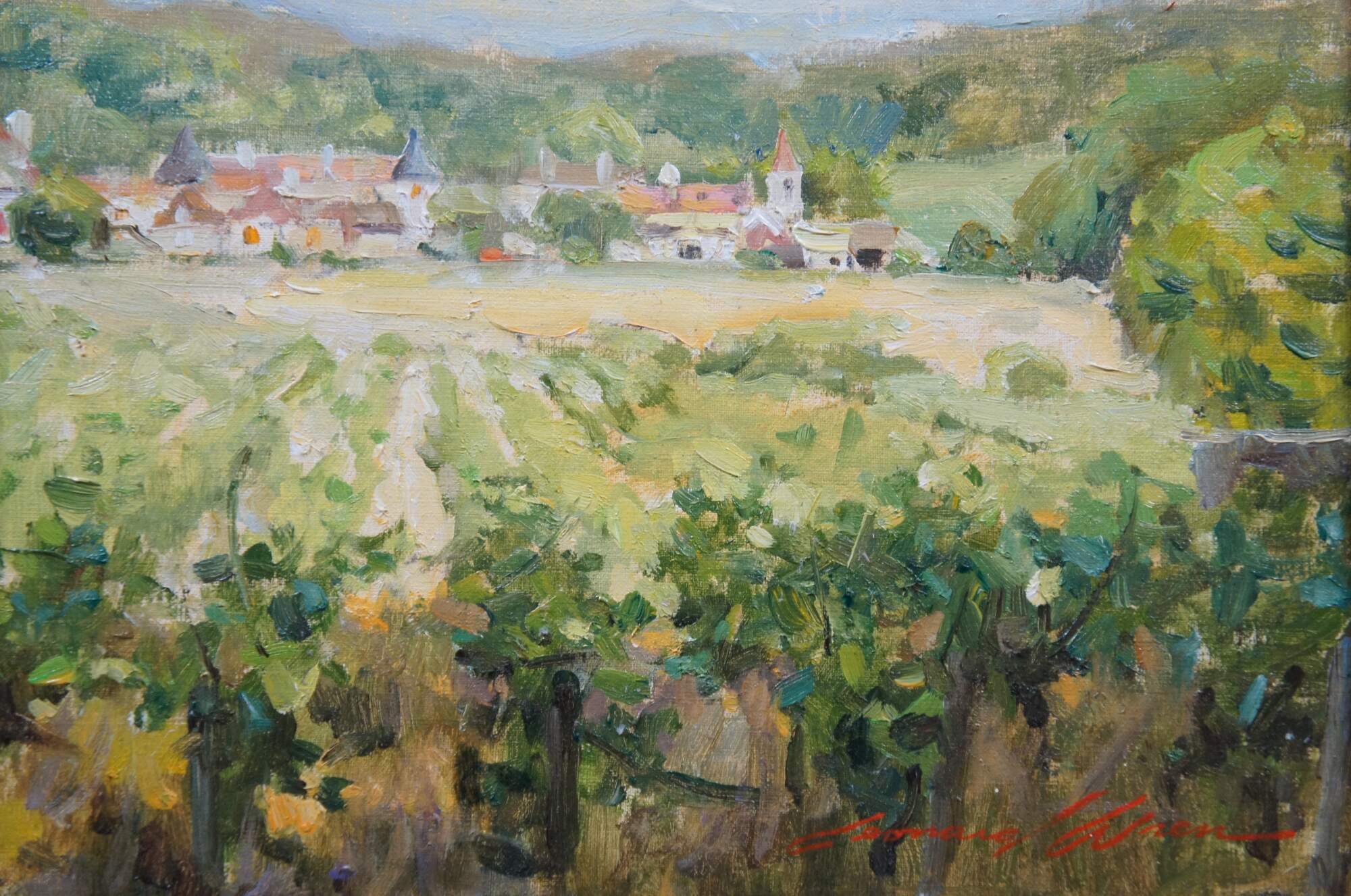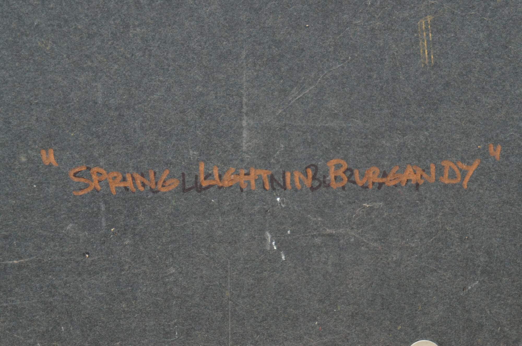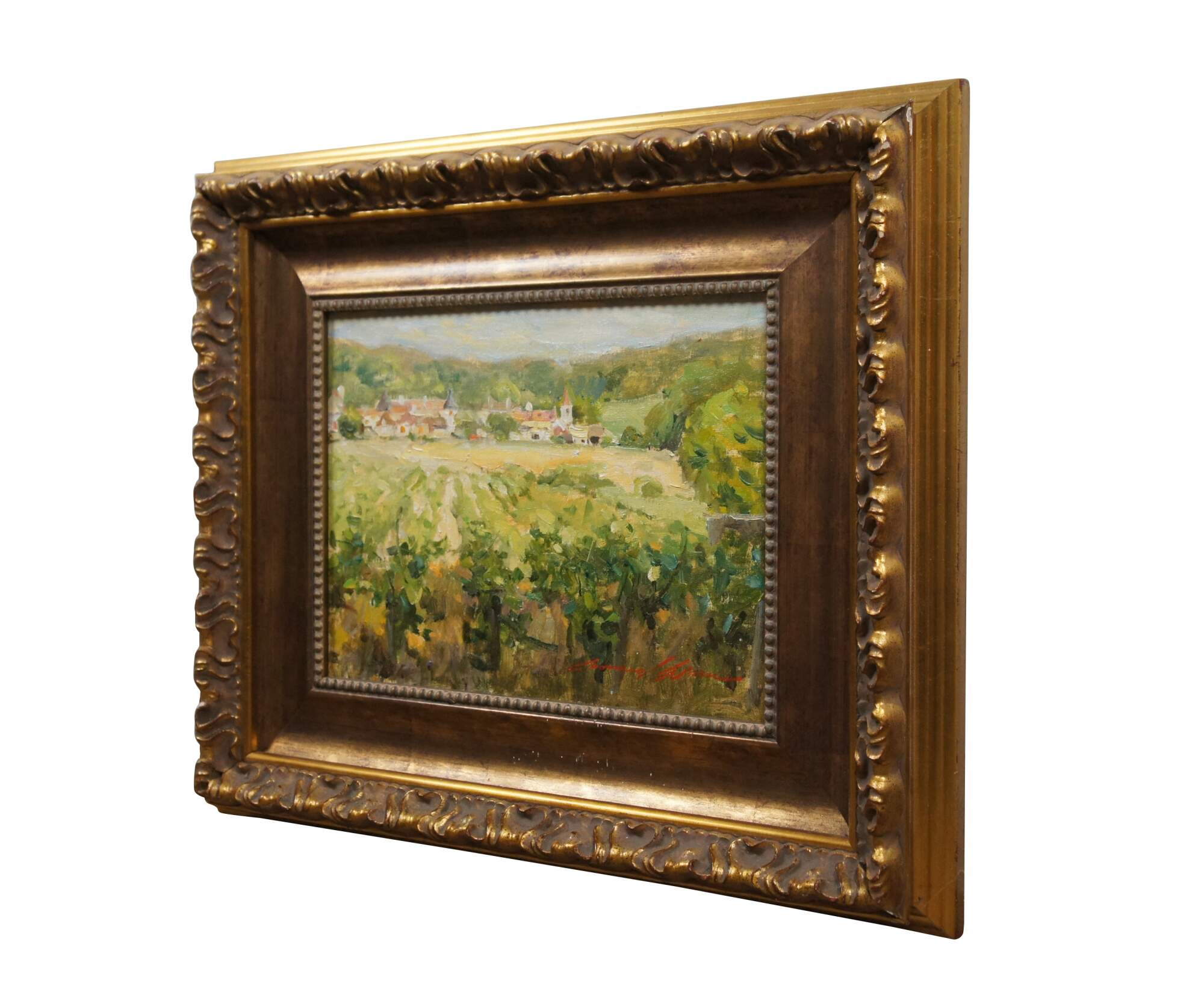 Late 20th century landscape oil painting on board titled "Spring Light in Burgundy (France)" by Leonard Wren. Depicts a charming French Impressionist country landscape of a village viewed across a Vineyard / field. Signed in lower right corner. Beveled frame with molded foliate edge and gold finish.